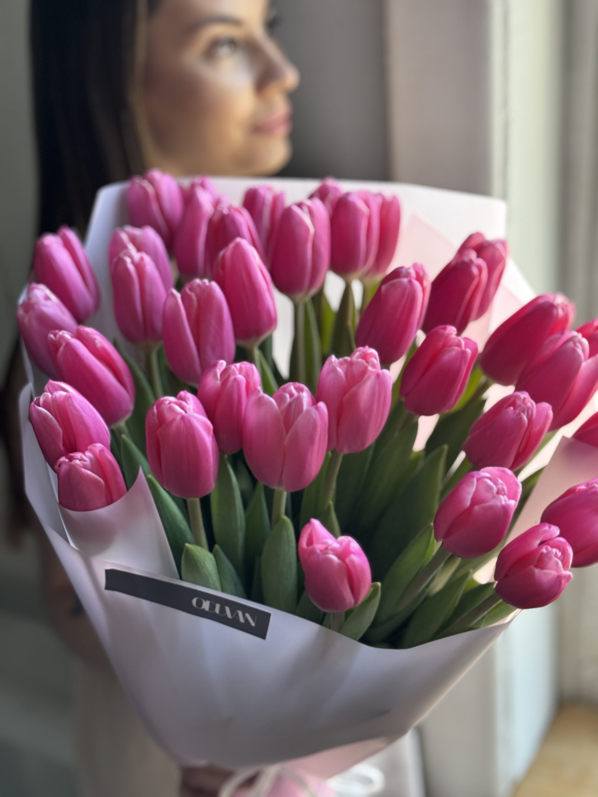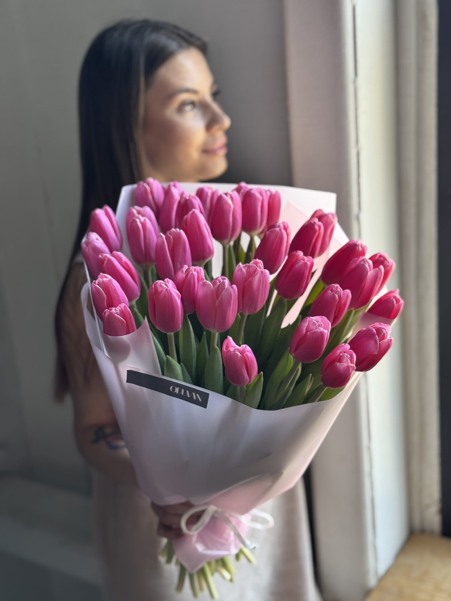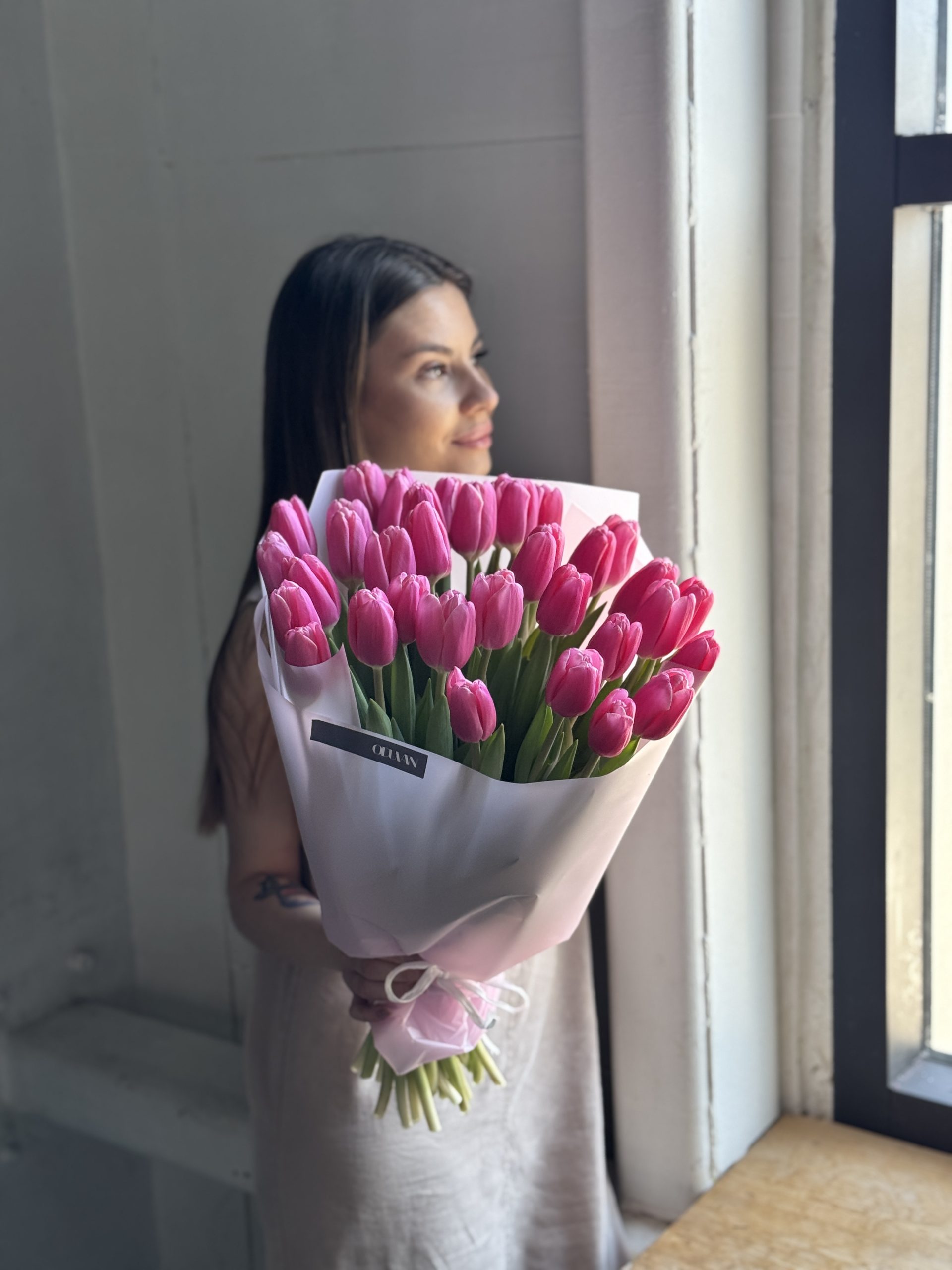 Описание: Монобукет из тюльпанов в авторской упаковке.