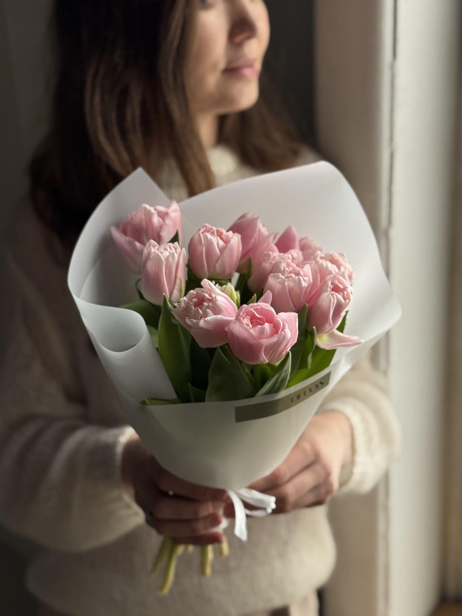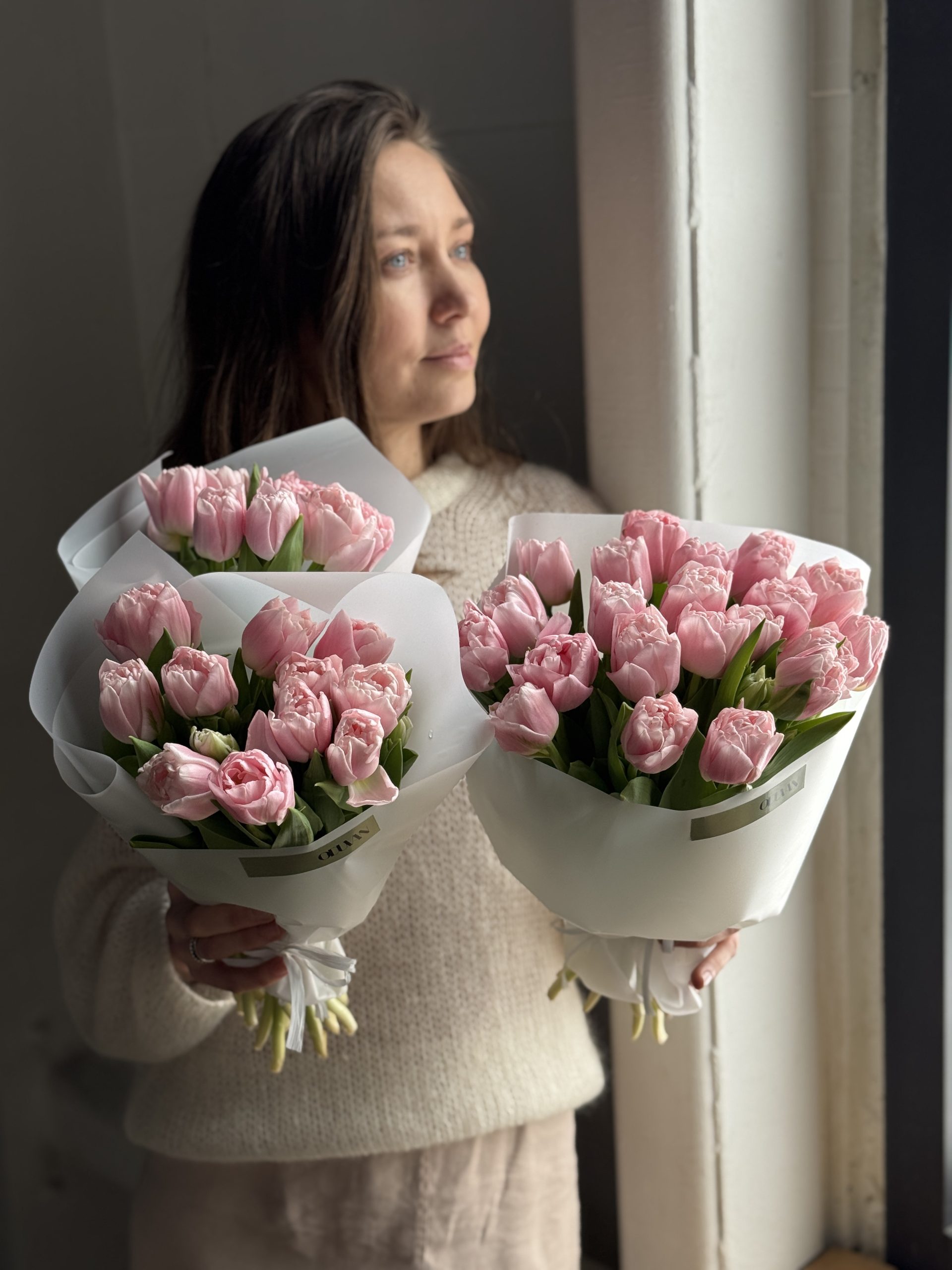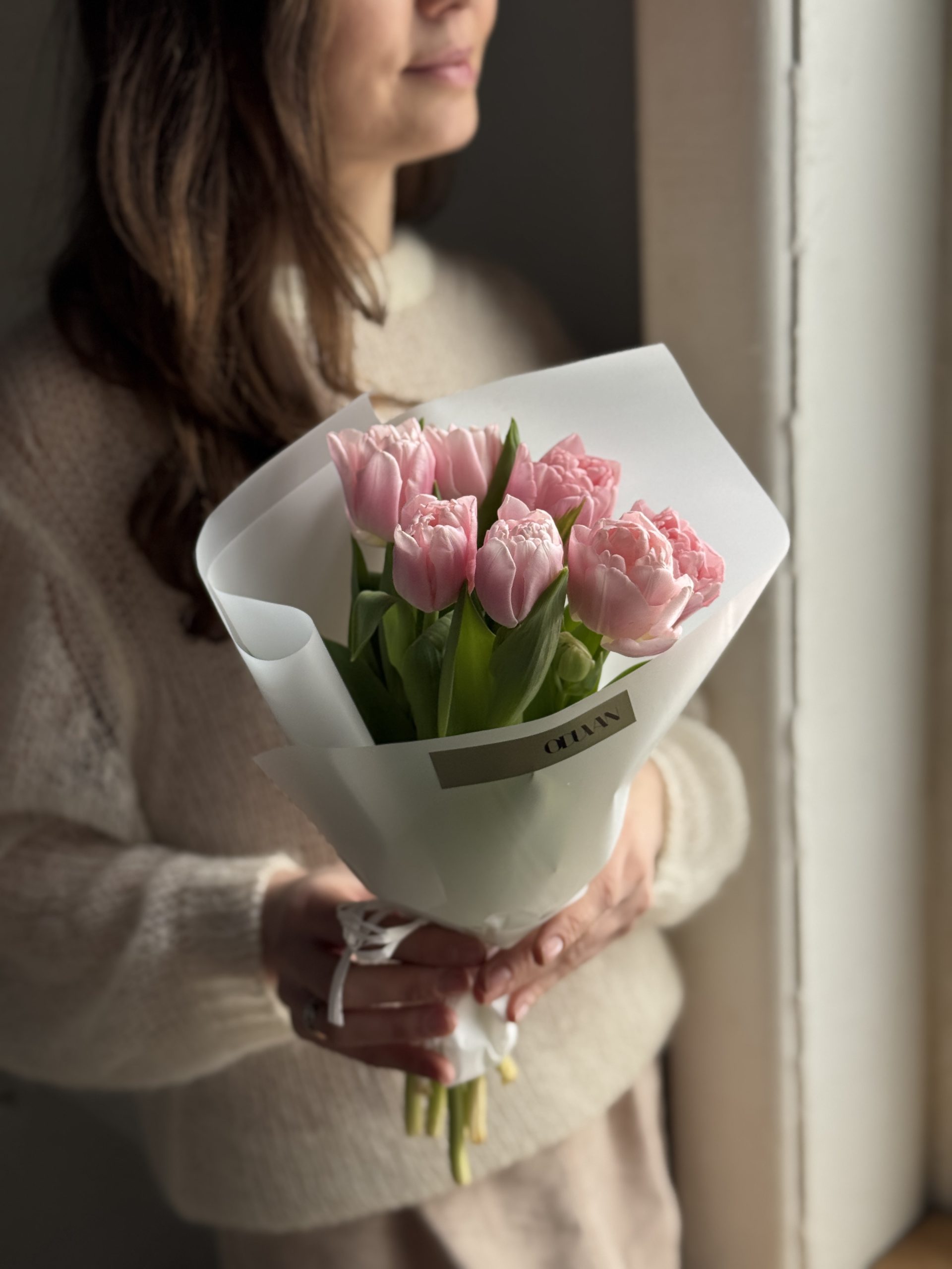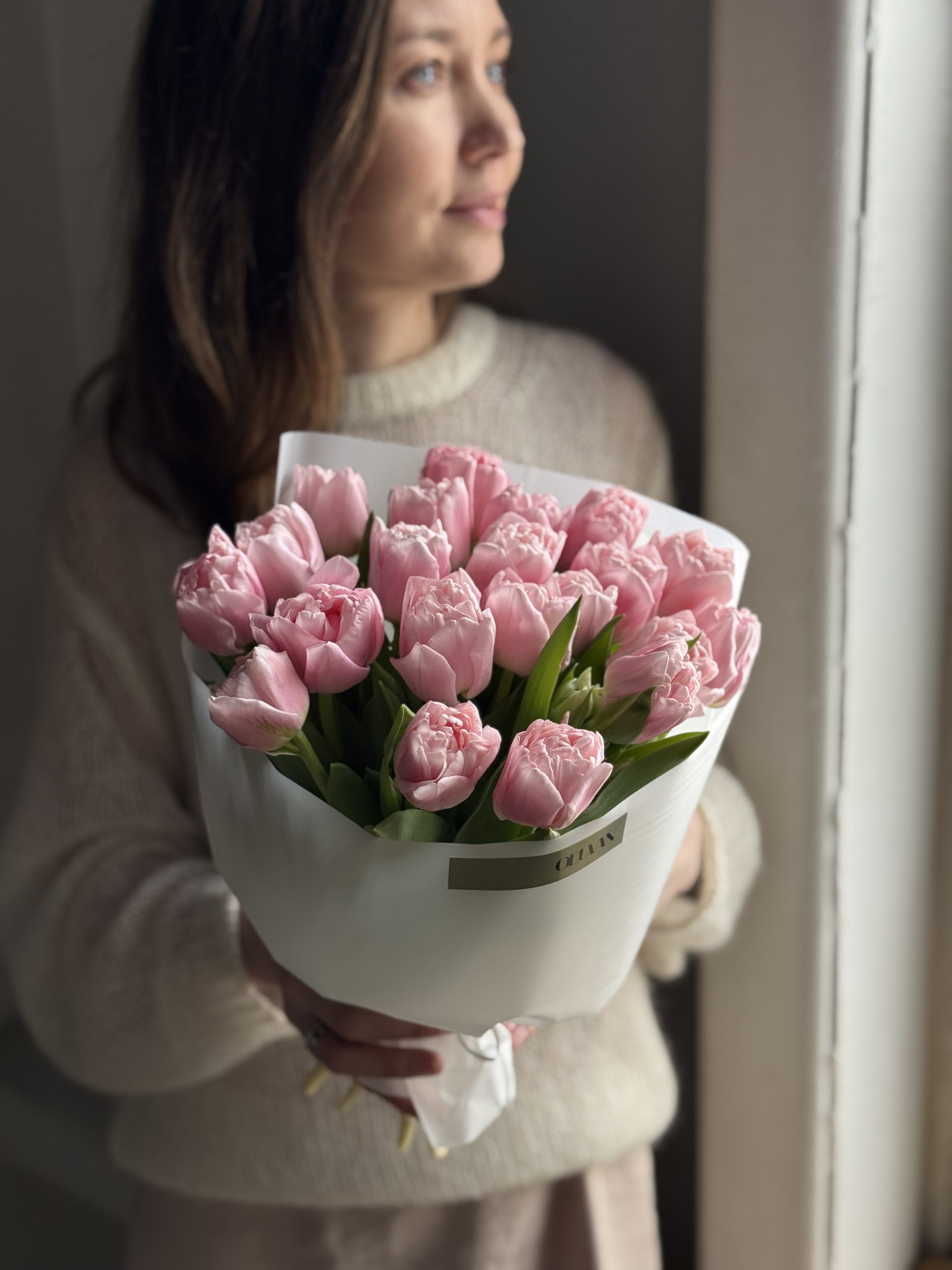 Описание: Монобукет из пионовидных тюльпанов в авторской упаковке.