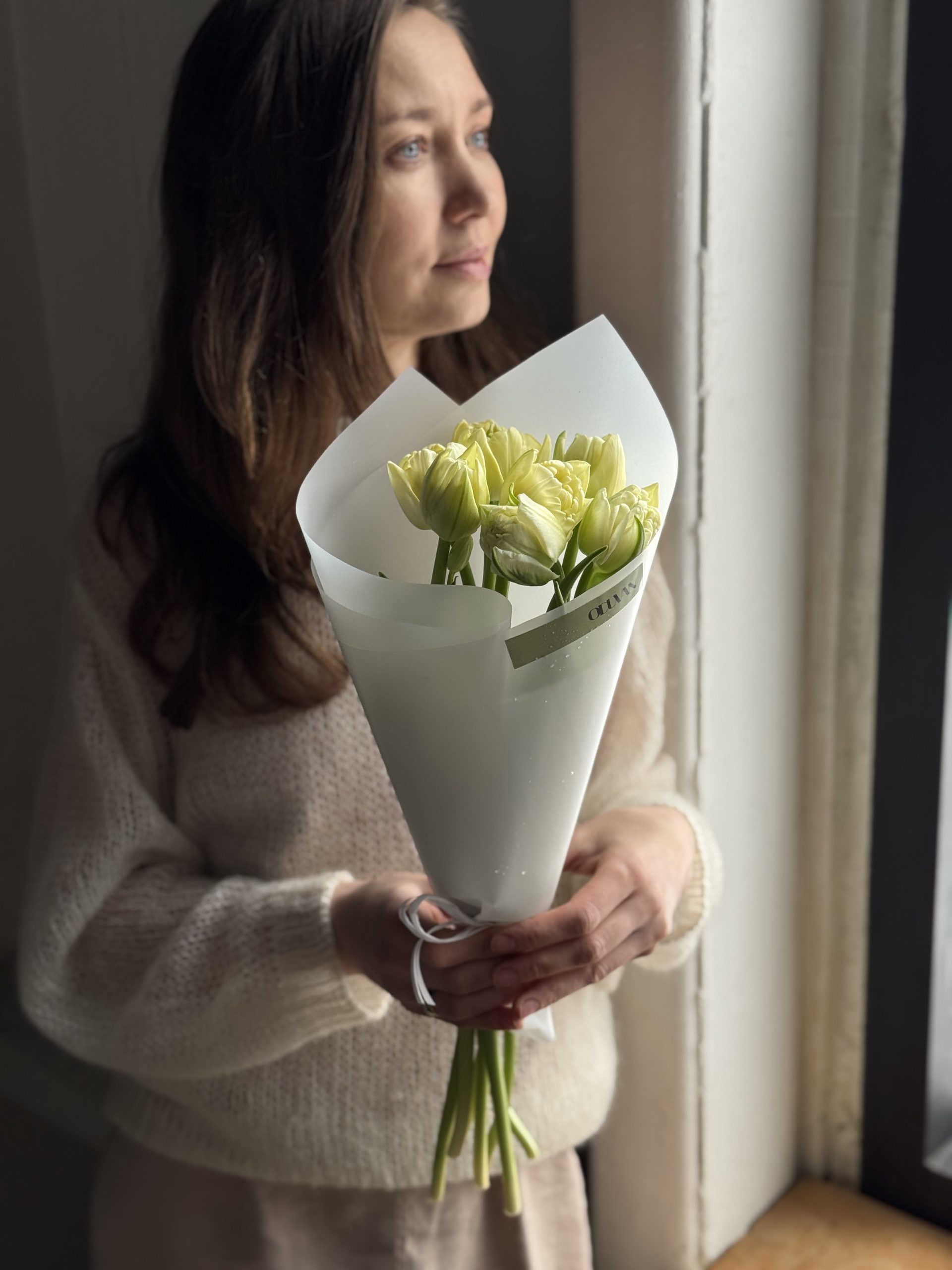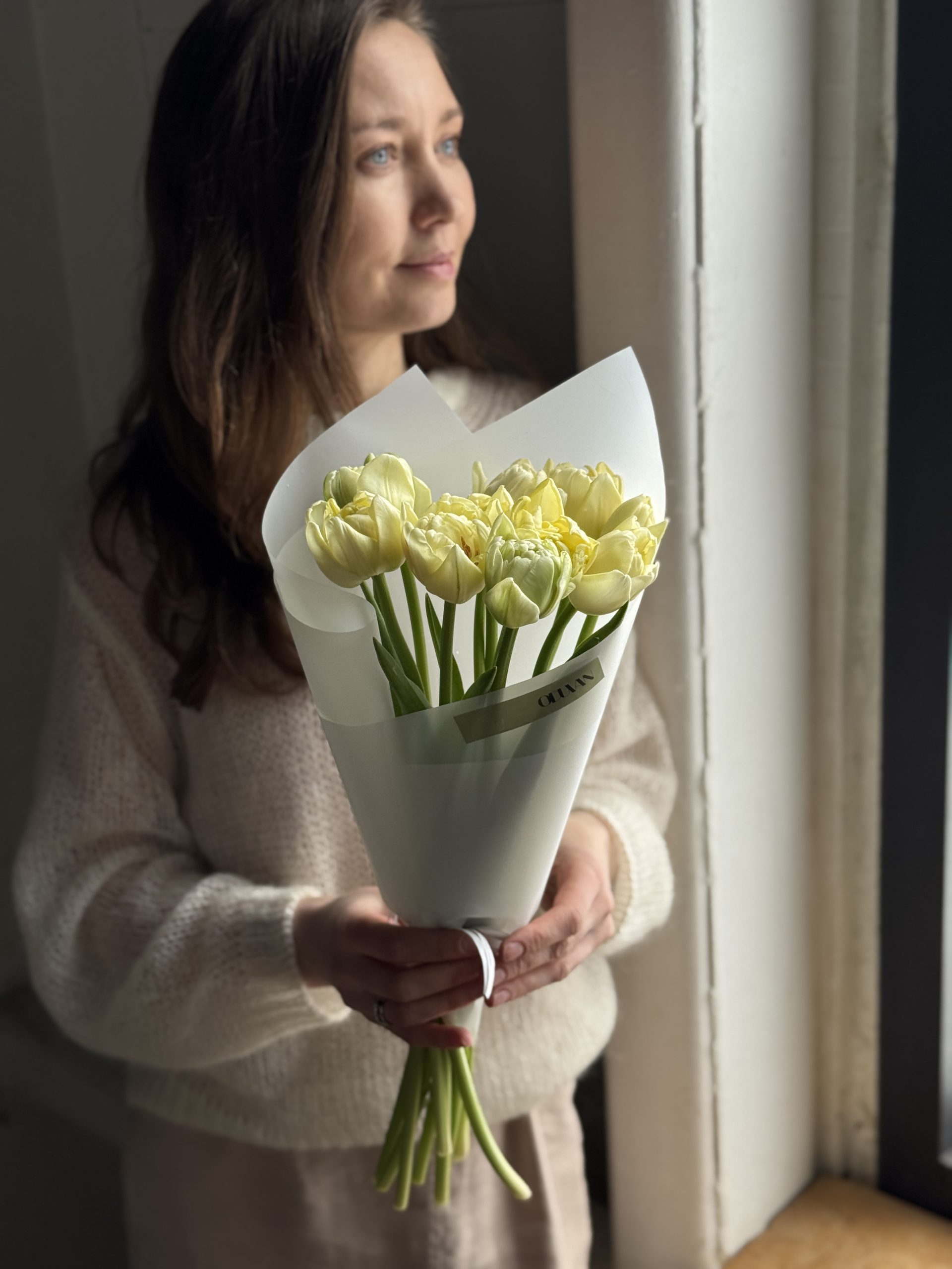 Описание: Монобукет из пионовидных лимонных тюльпанов в авторской упаковке.