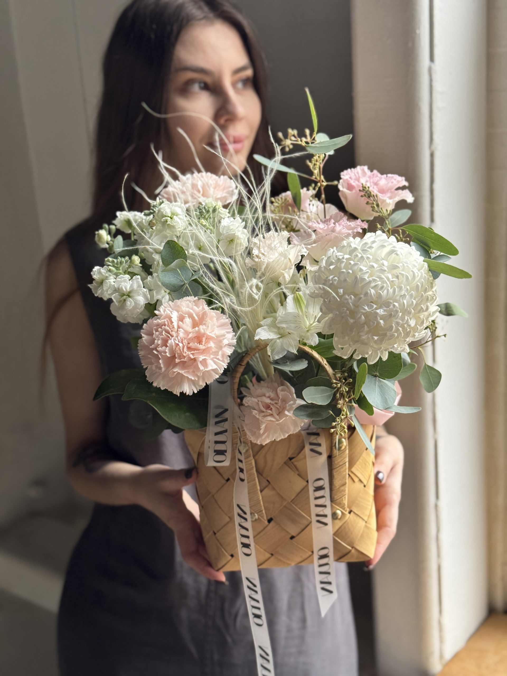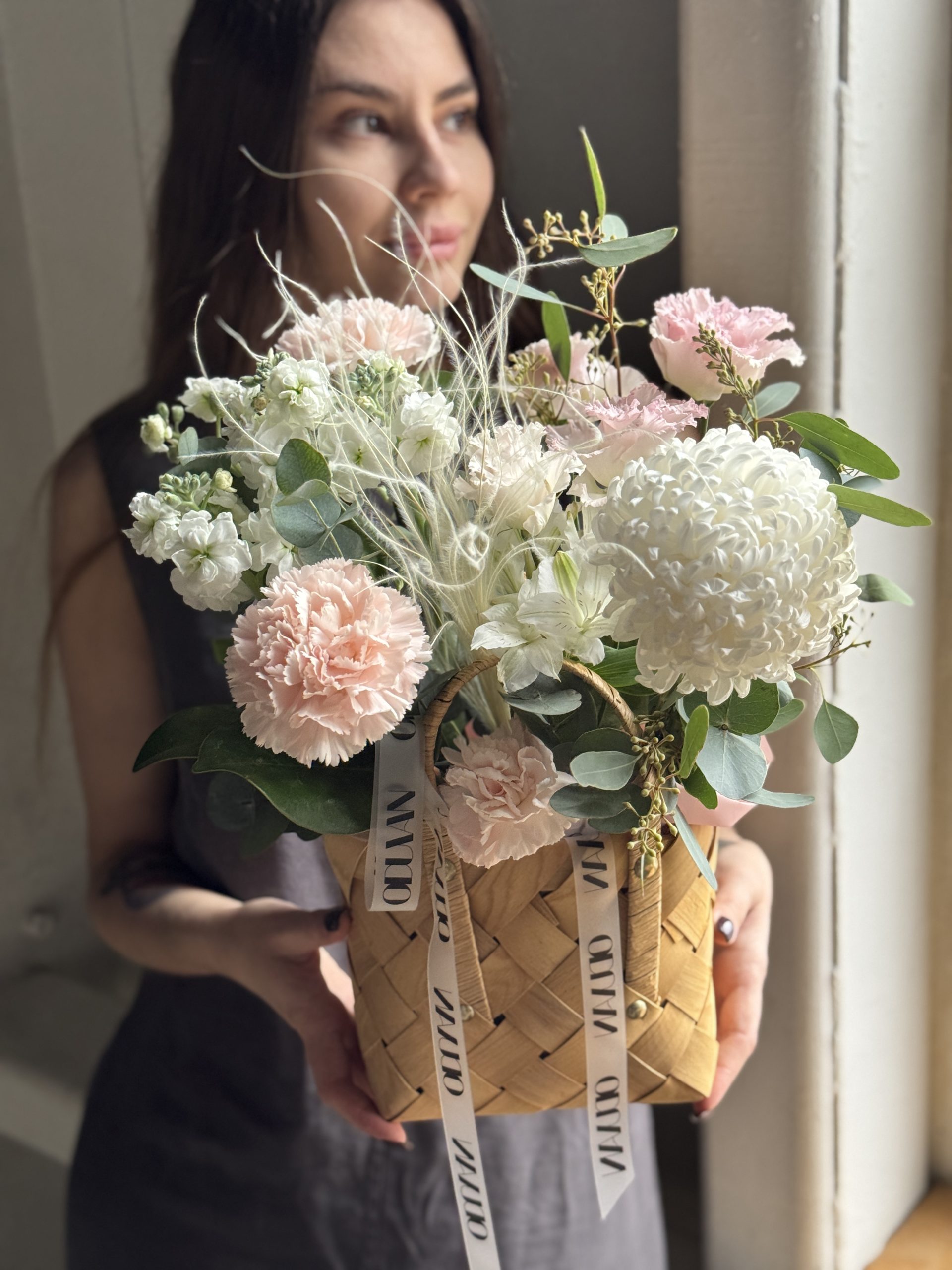 Описание: Композиция в корзинке с хризантемой Бигуди, ароматной маттиолой, эустомой, диантусами, стифой, альстрамерией, веточками эвкалипта популус бадс и магнолией.