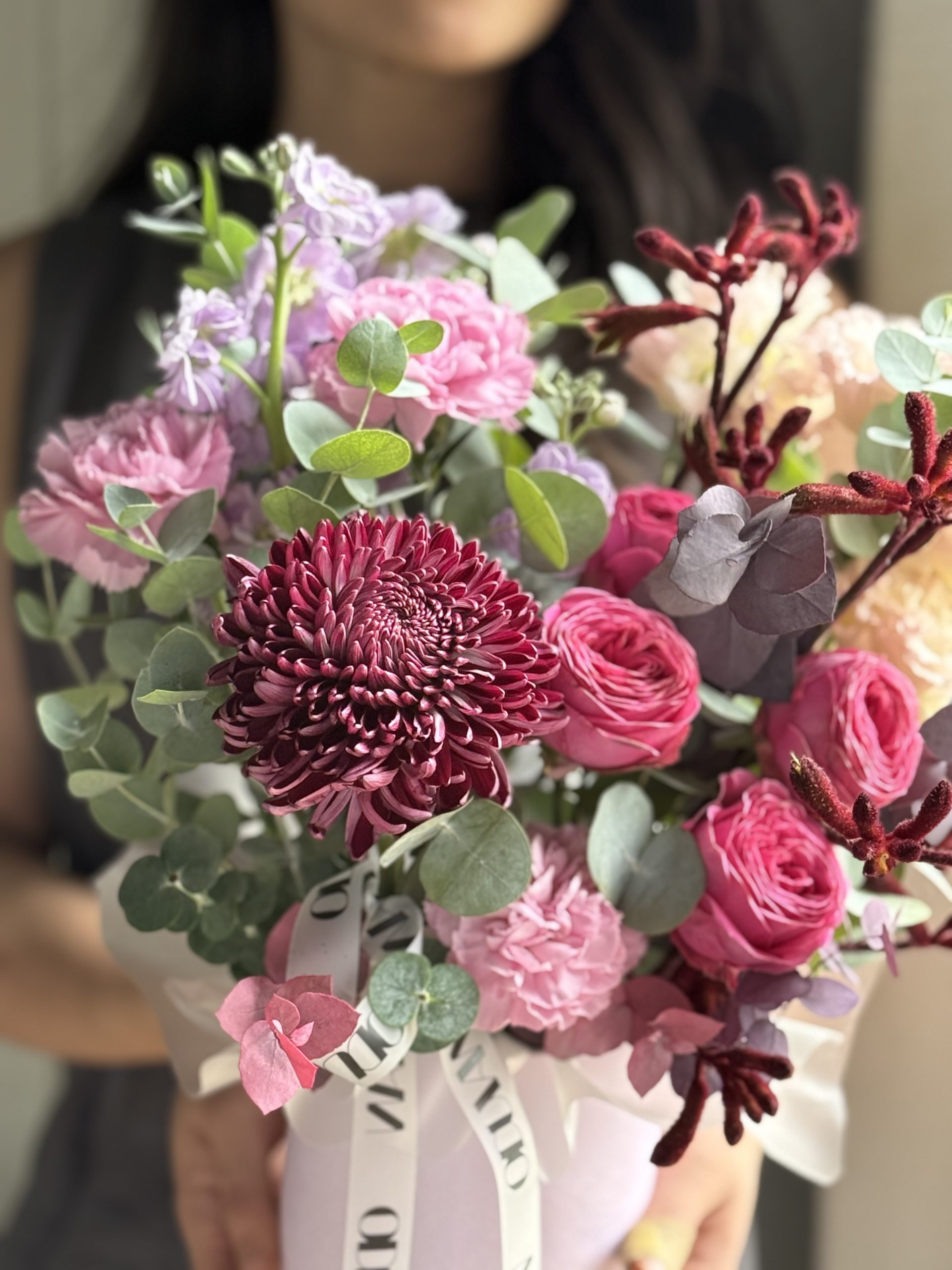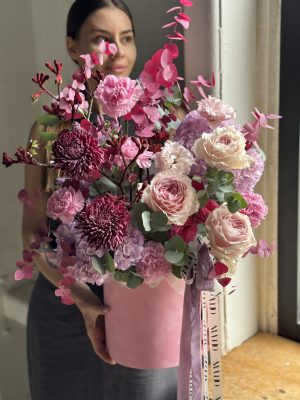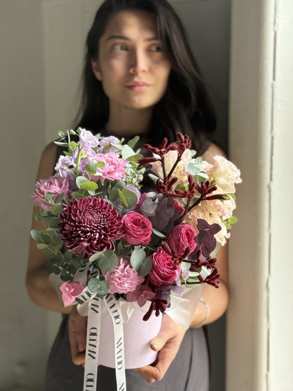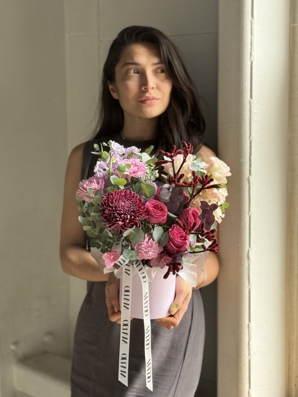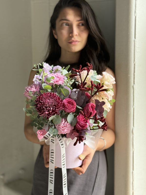 Описание: Композиция в коробке с анигозантусом, хризантемой Бигуди, кустовой пионовидной розой, ароматной маттиолой, эустомой и миксом веточек эвкалипта.