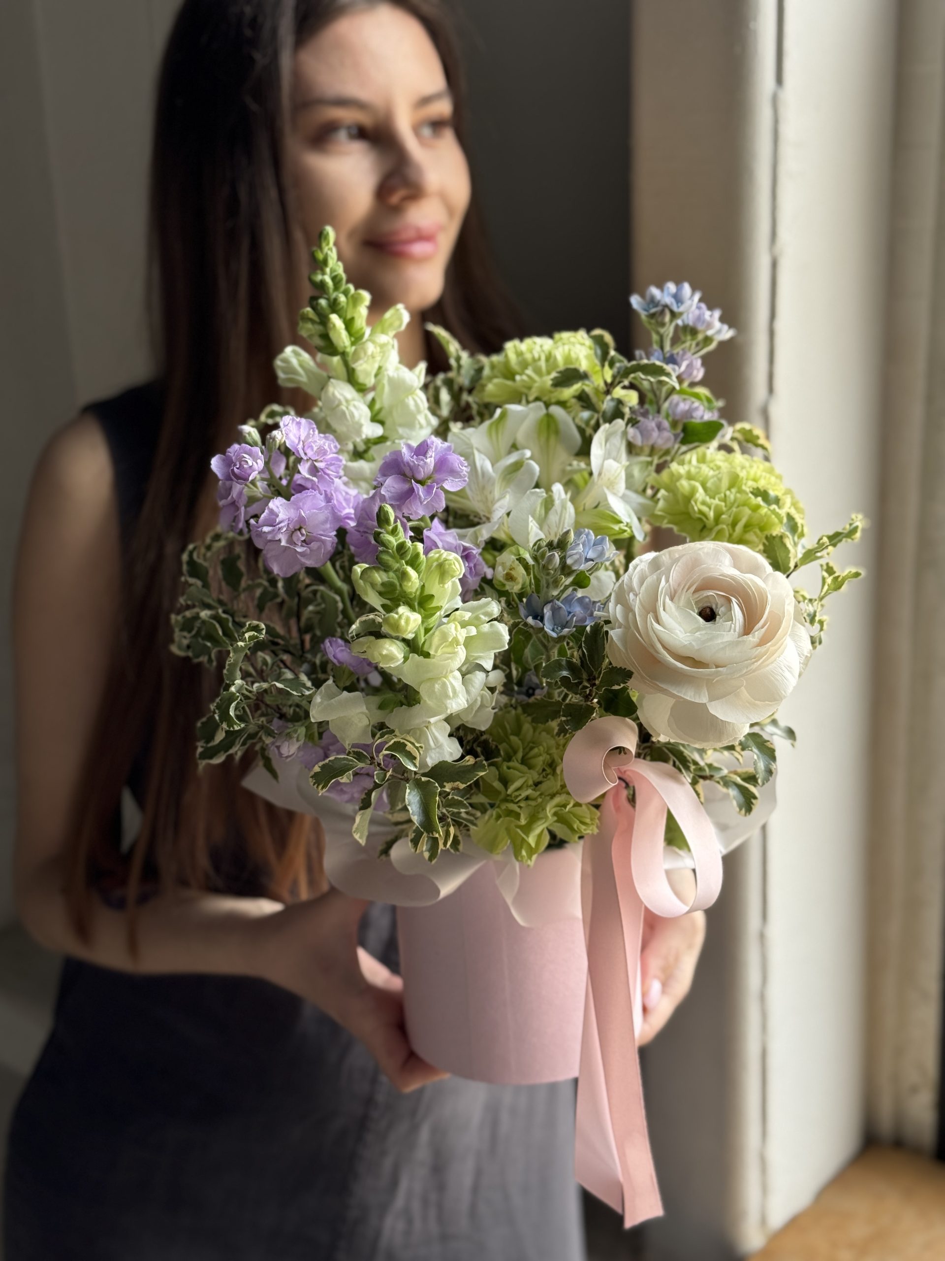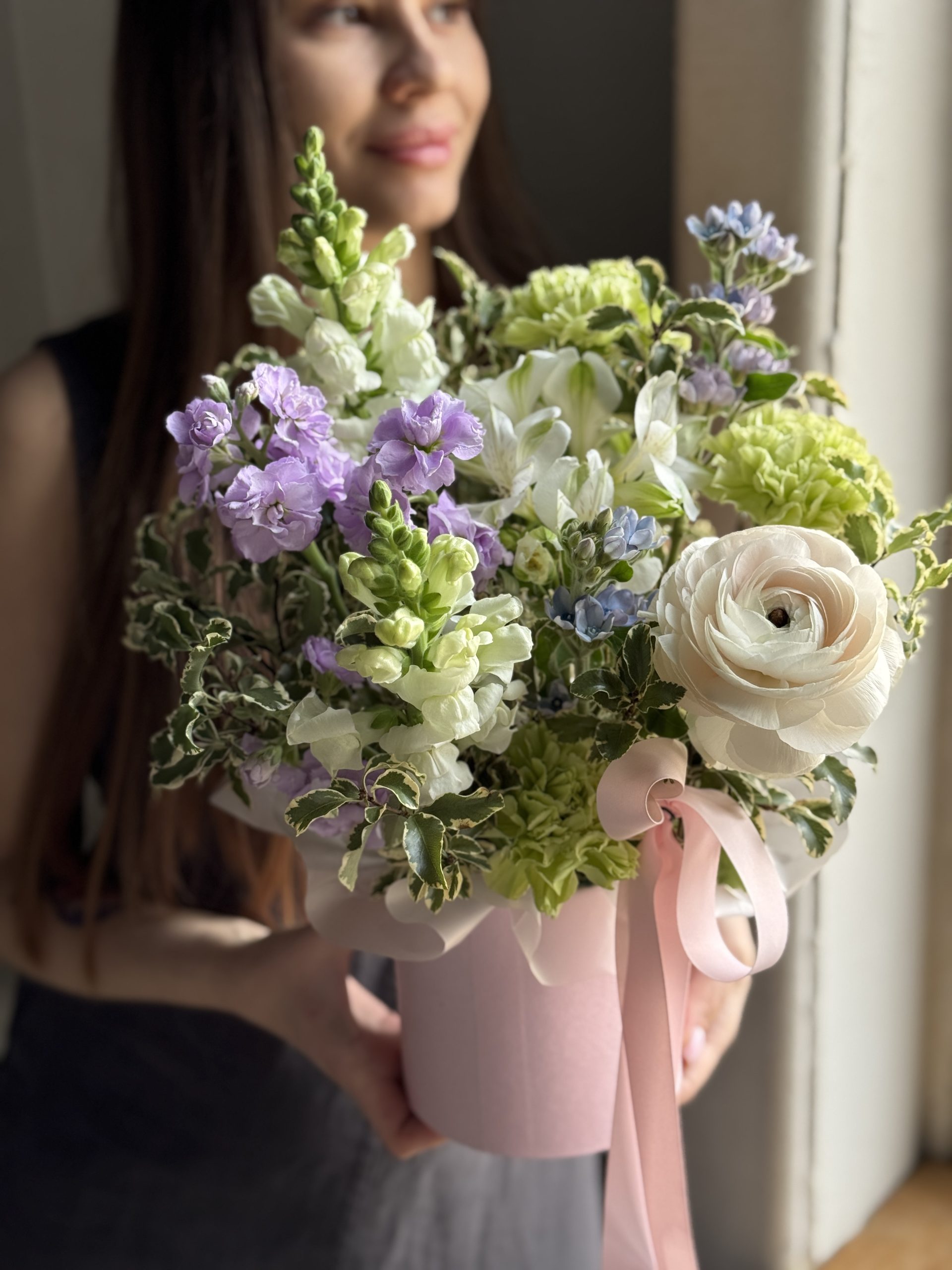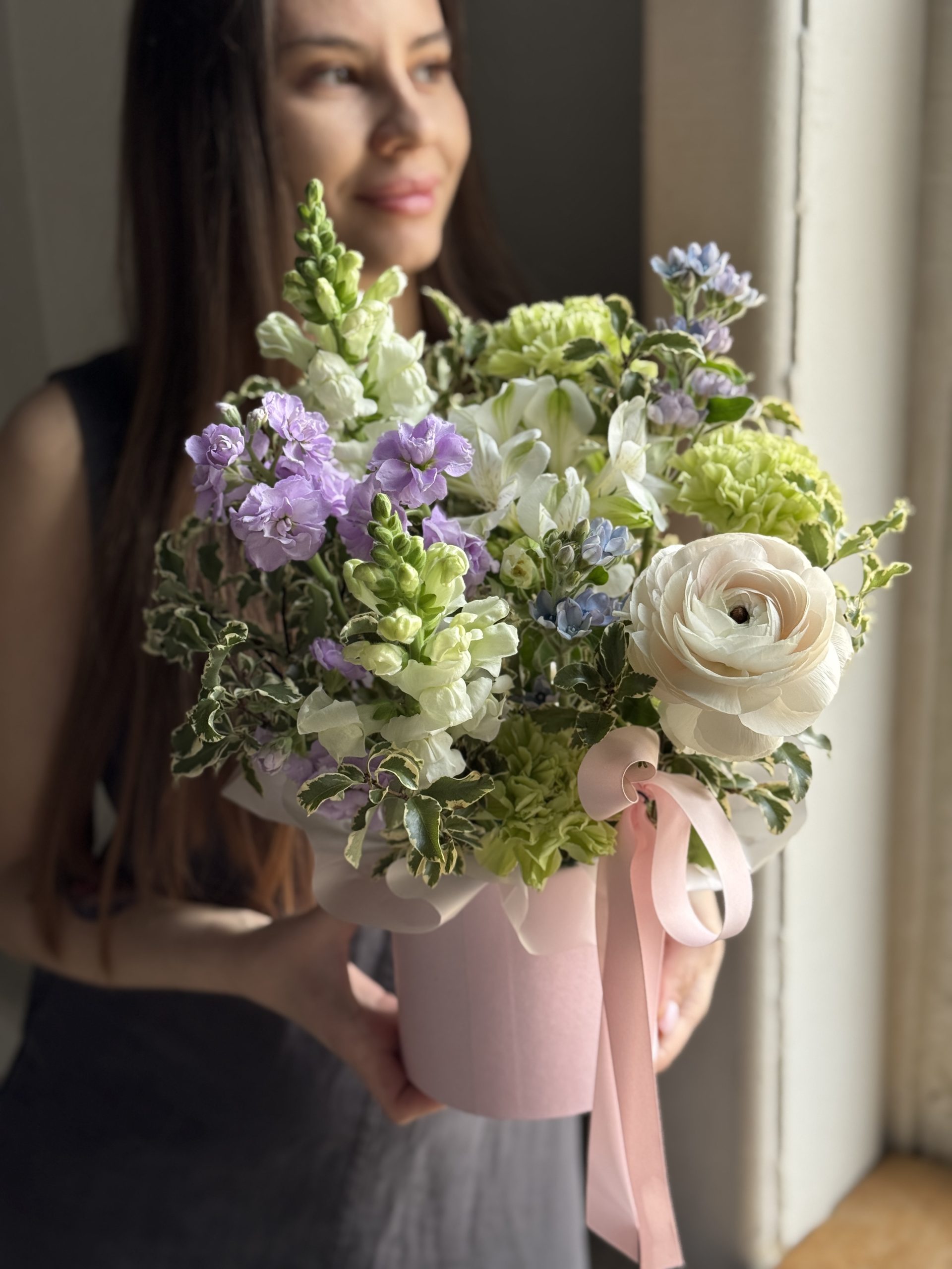 Описание: Композиция в коробке с леувенбеками, ранункулюсом, альстромерией, твидией, кустовой маттиолой, диантусами и листьями питтоспорума.