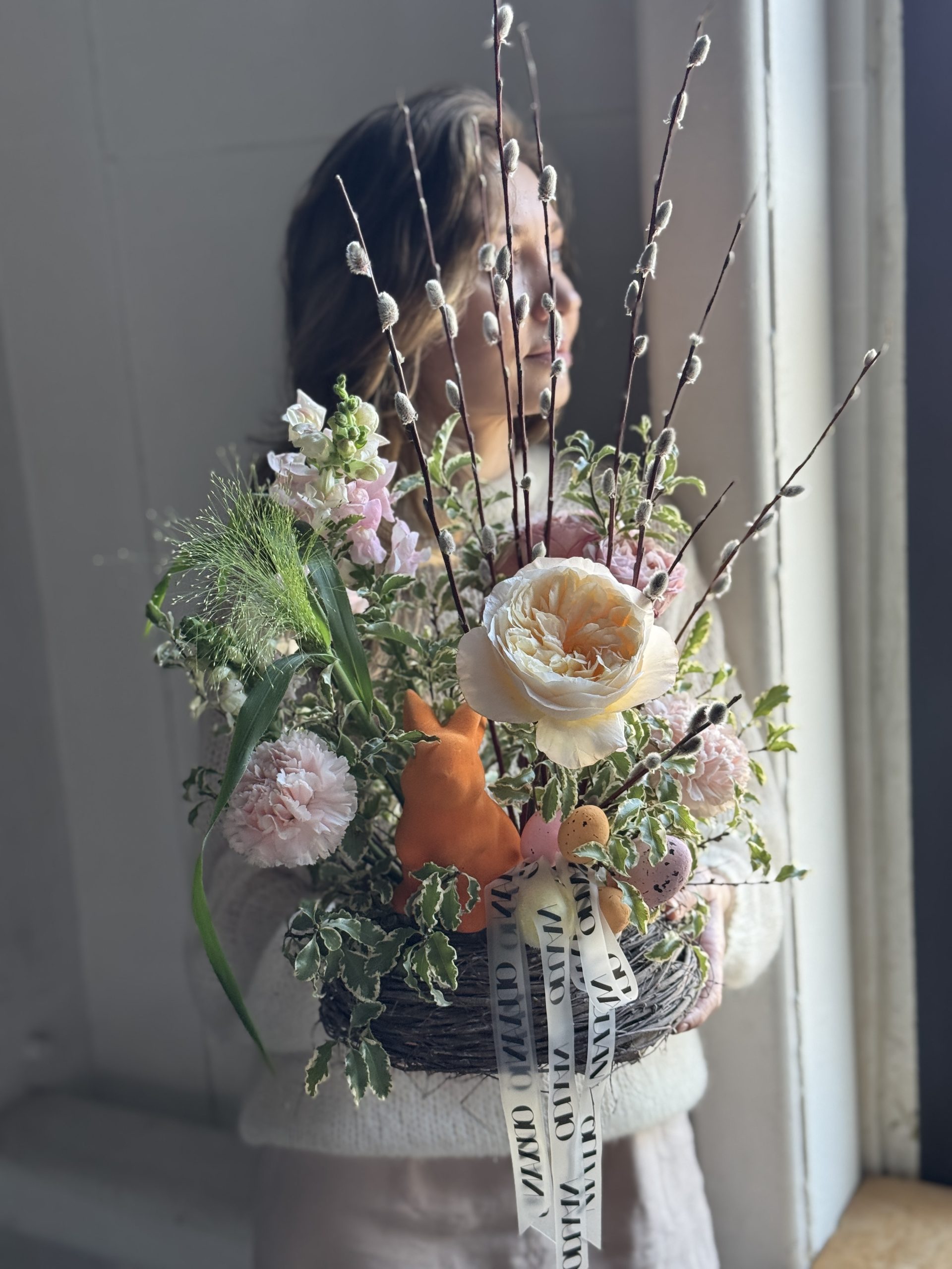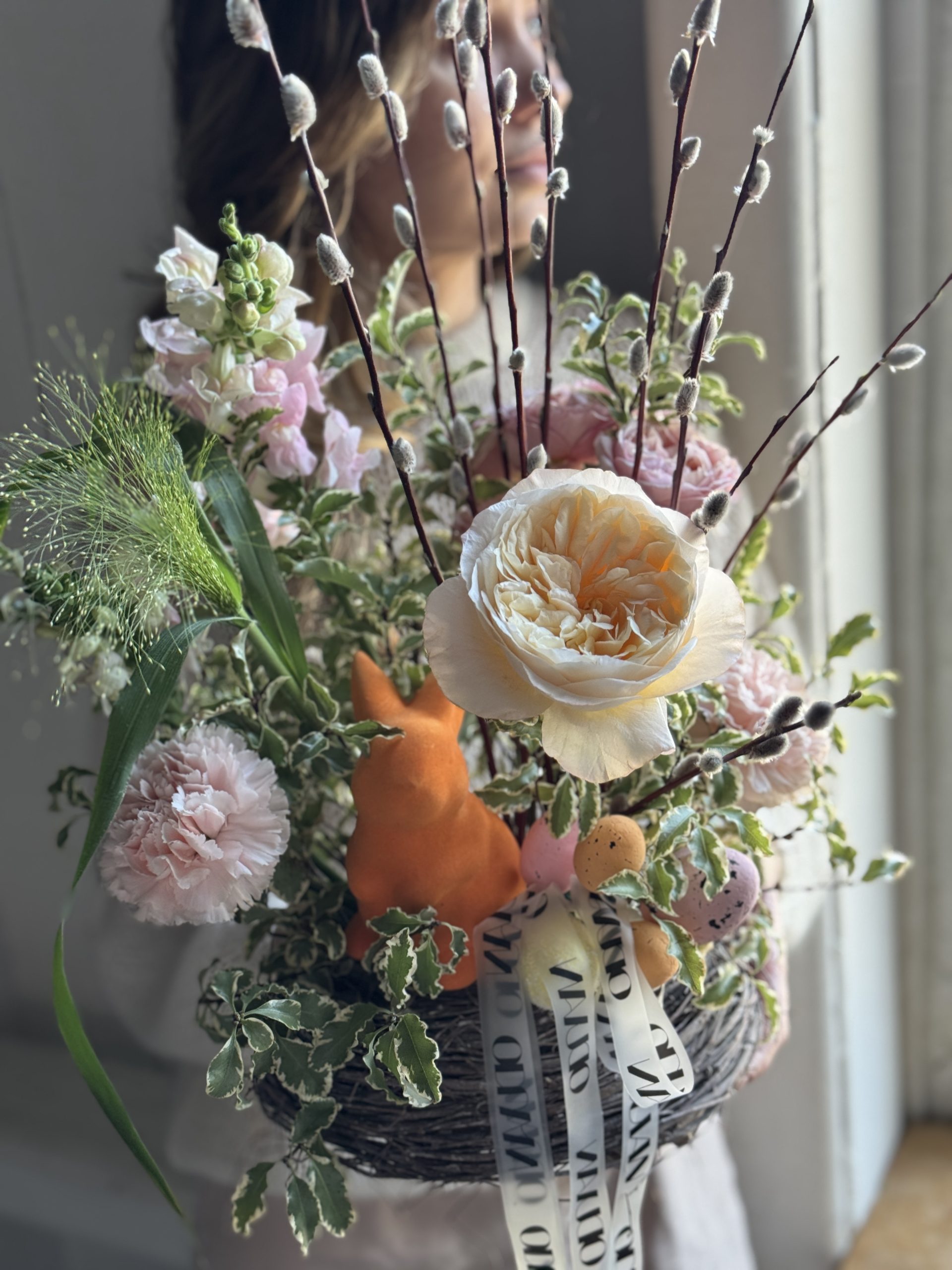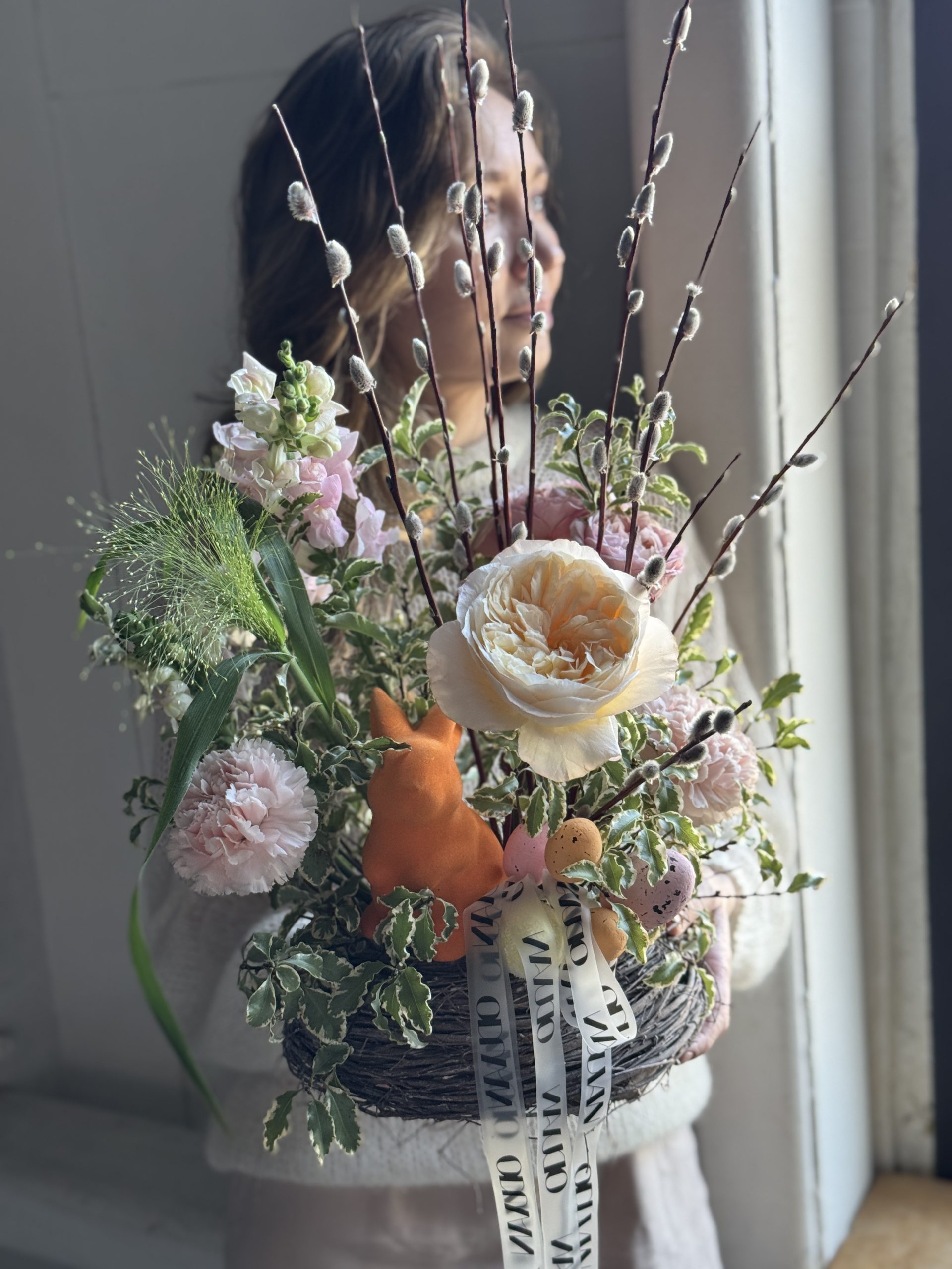 Описание: Композиция в гнезде с садовой и кустовой розами, диантусами, леувенбеками, диантусами, паникумом, листьями питтоспорума, вербой и пасхальным декором.