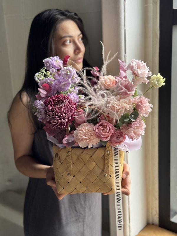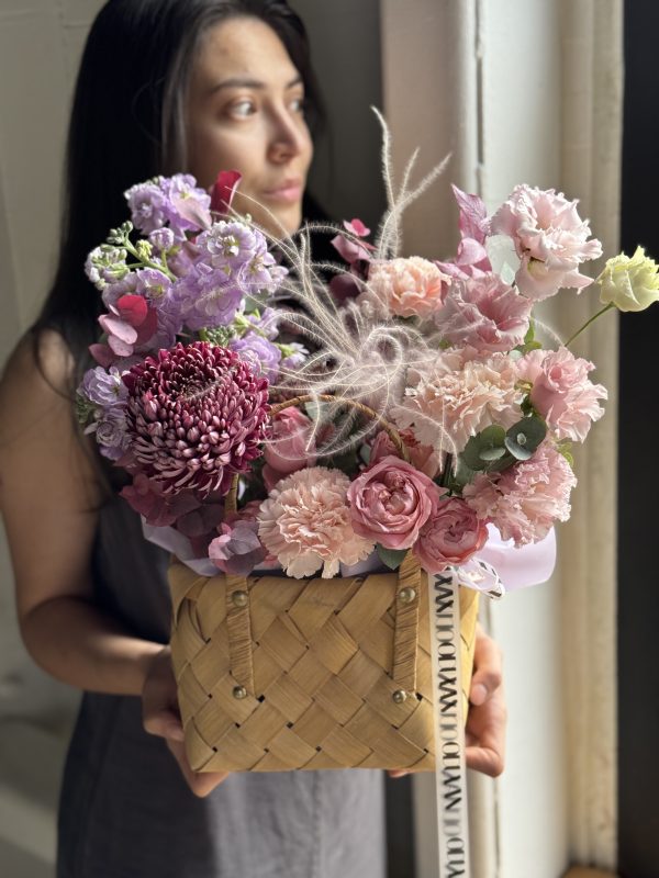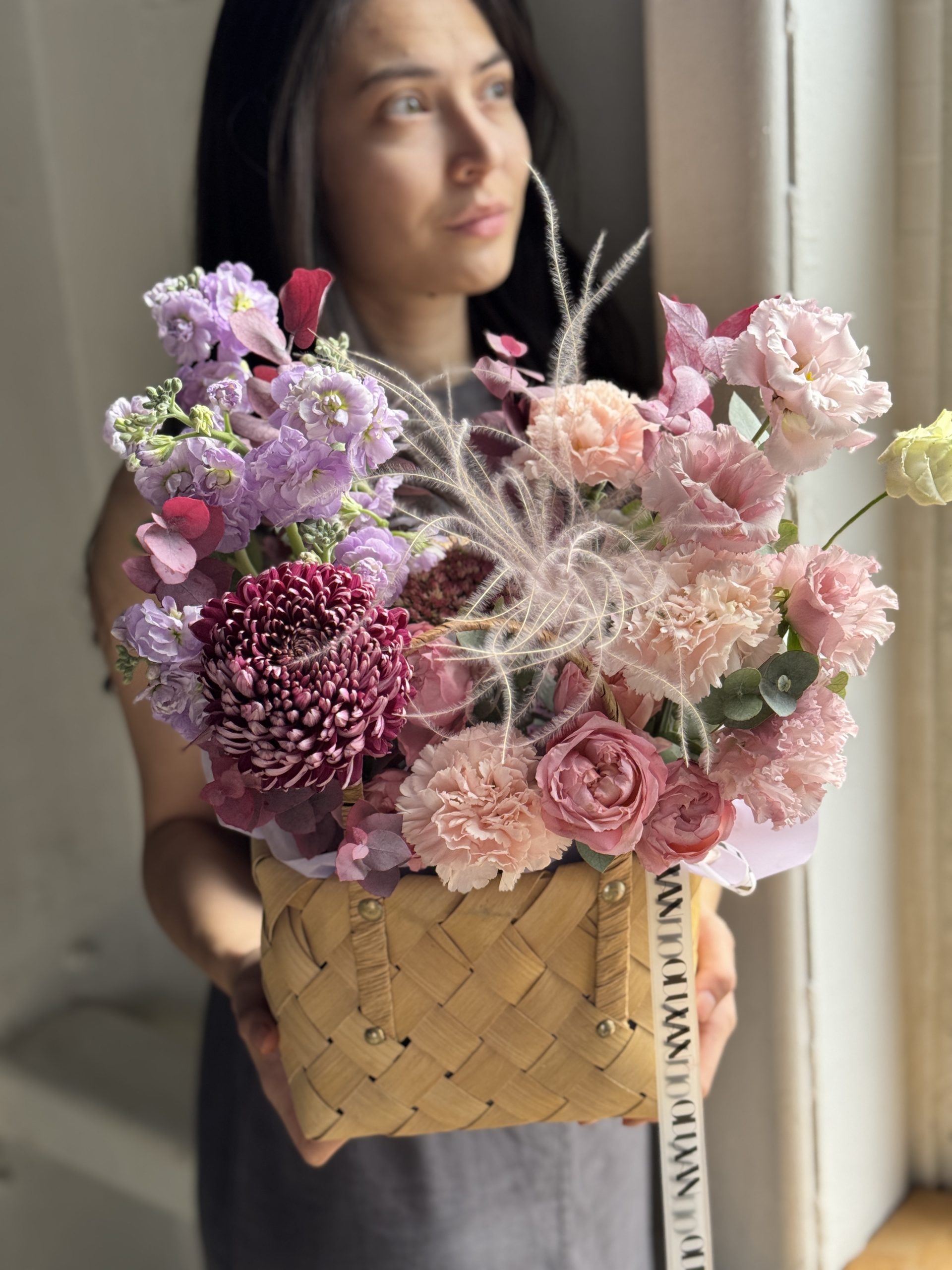 Описание: Композиция в корзине с хризантемой, кустовой пионовидной розой, эустомой, диантусами, маттиолой, стифой, эвкалиптом.