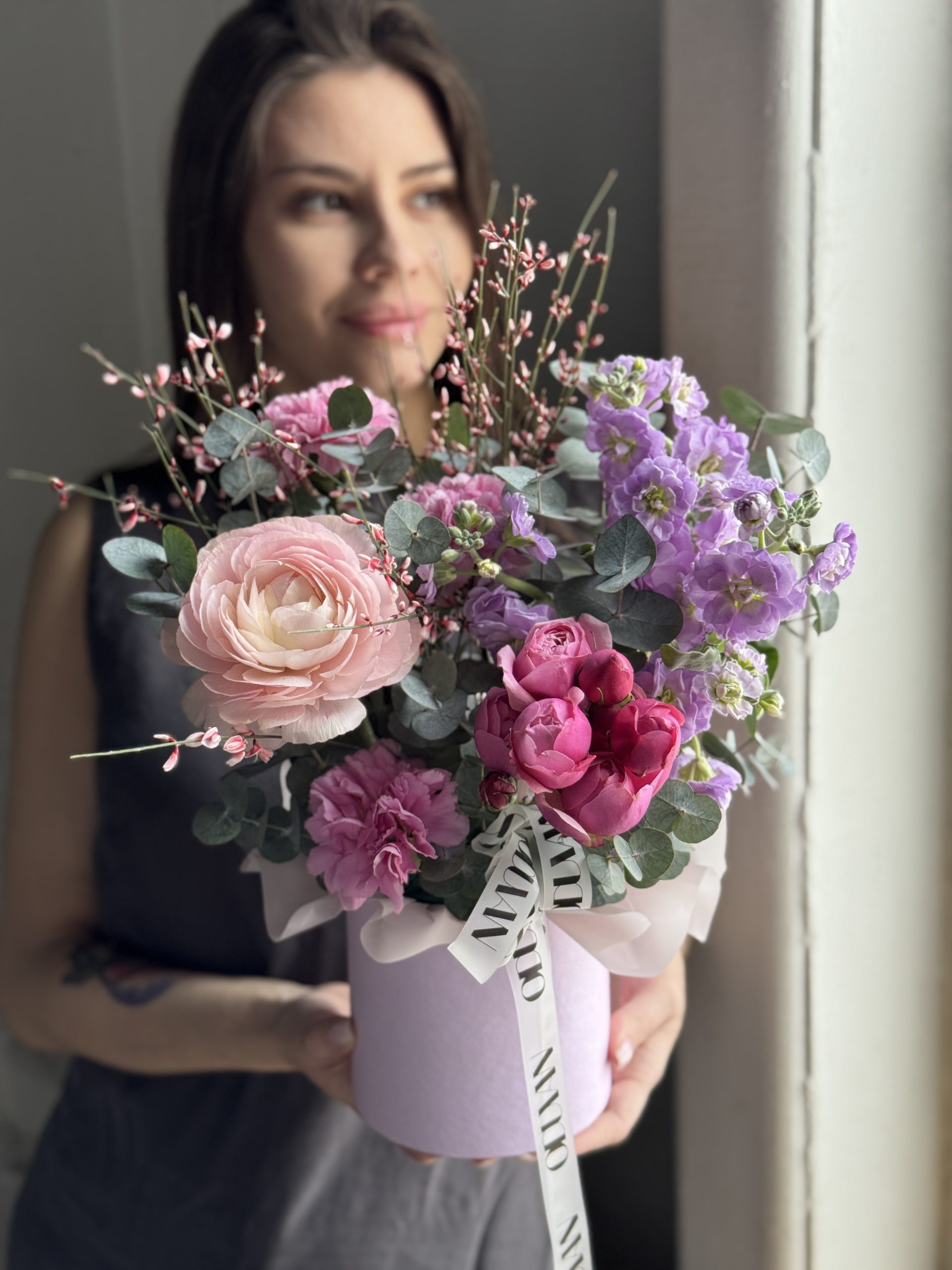 Описание: Композиция в коробке с ранункулюсом, кустовой розой Жизель, ароматной маттиолой, диантусами, ароматной генистой и веточками эвкалипта.