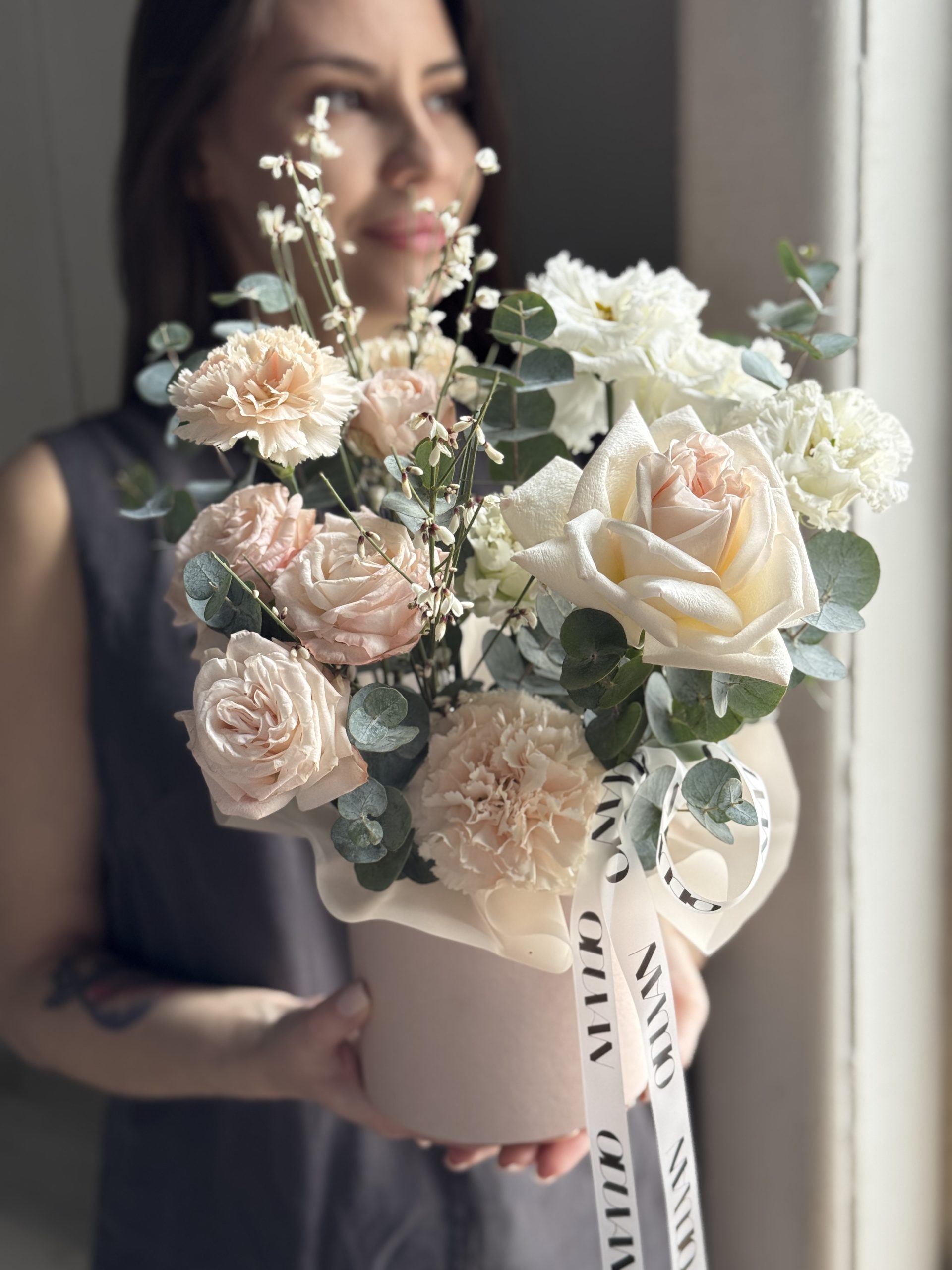 Описание: Композиция в коробке с ранункулюсом, кустовой розой Жизель, ароматной маттиолой, диантусами, ароматной генистой и веточками эвкалипта.