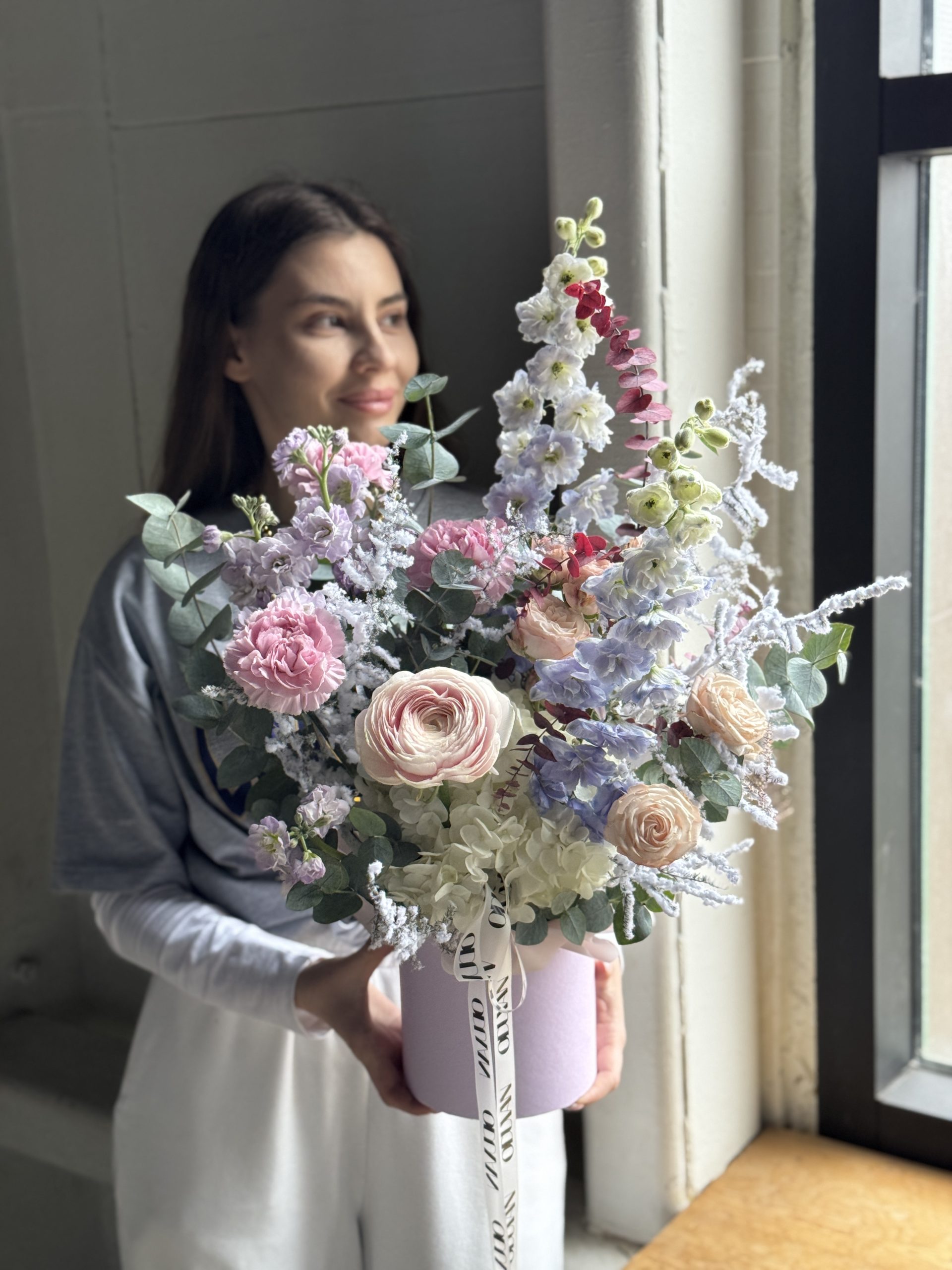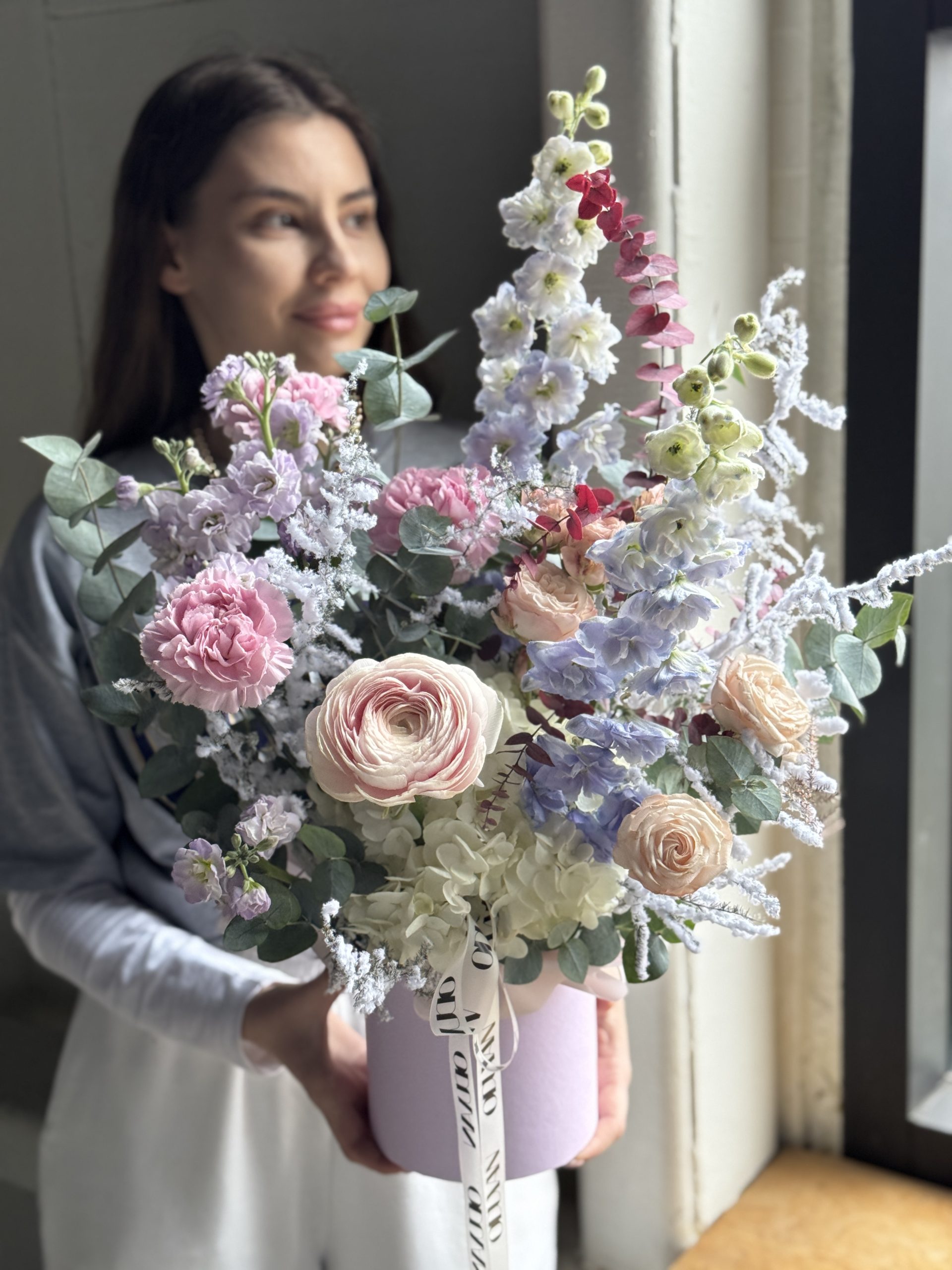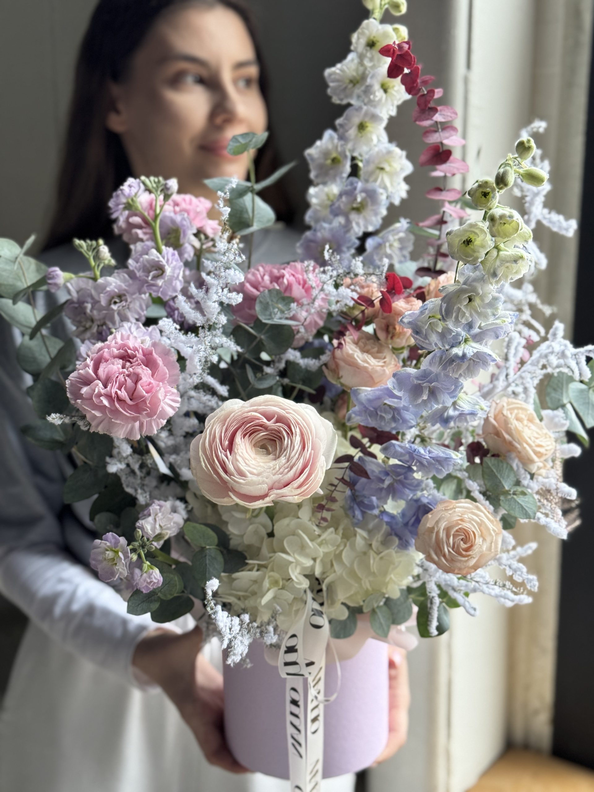 Описание: Композиция в коробке с гортензией, дельфиниумами, ранункулюсом, диантусами, кустовой пионовидной розой, маттиолой, заснеженным аспарагусом и миксом веточек эвкалипта.