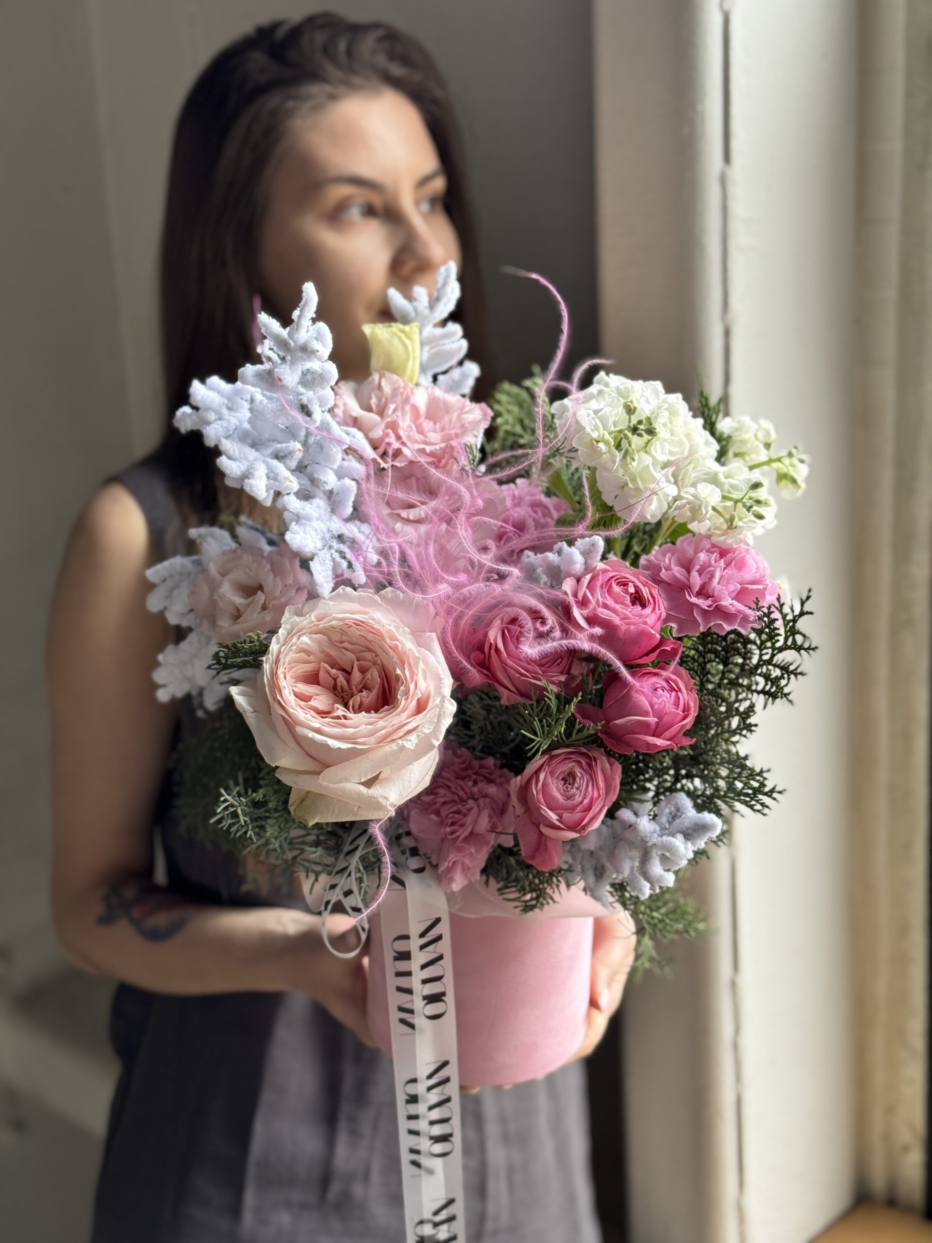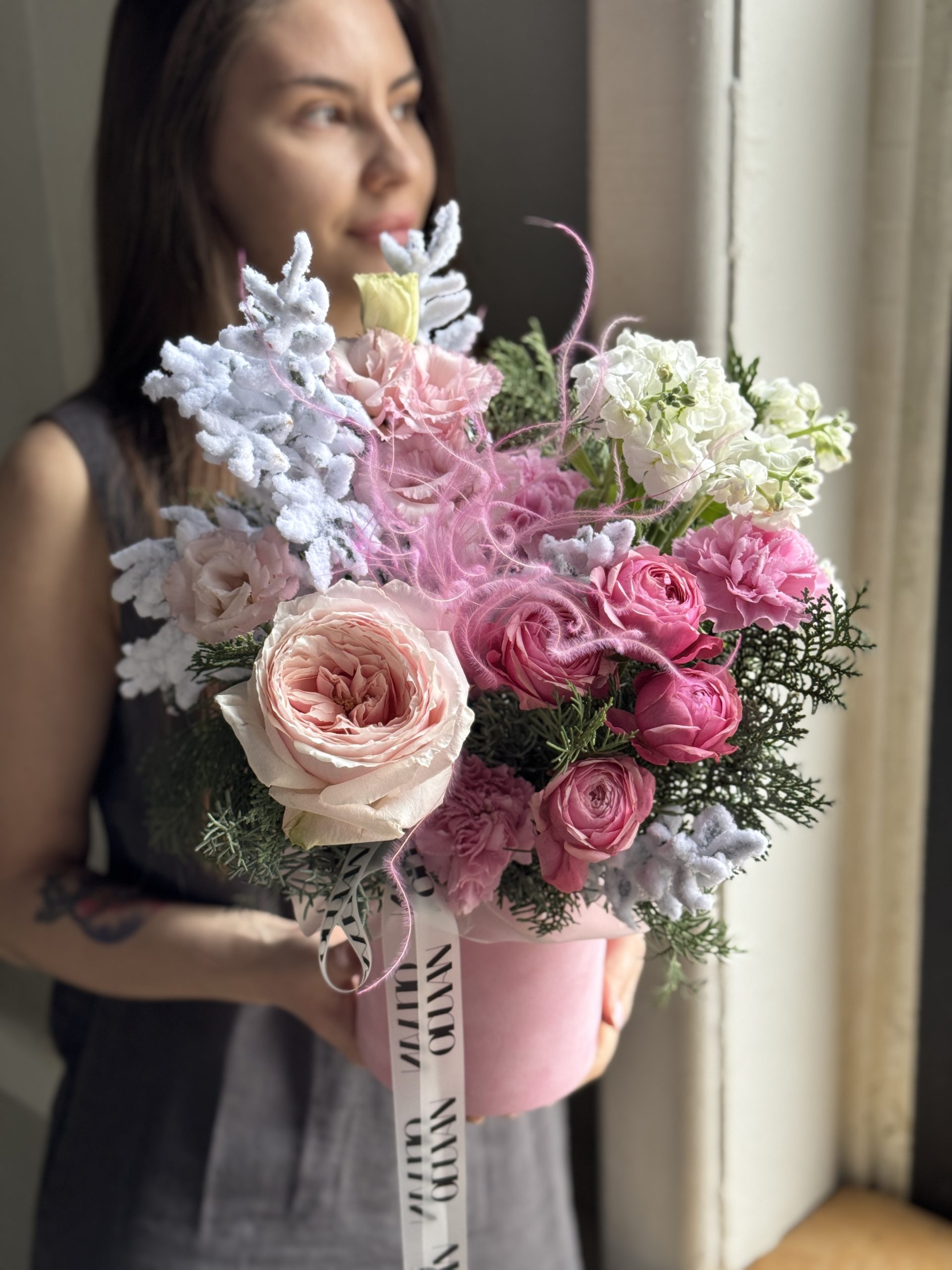 Описание: Композиция в бархатной коробке с садовой и кустовой розами, эустомой, ароматной маттиолой, диантусами, заснеженным рускусом, веточками туи и кедра.