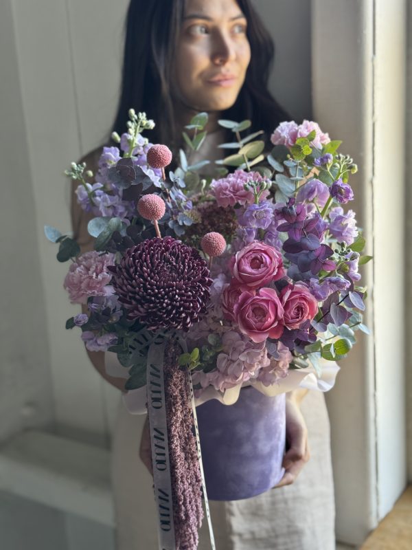 Описание:Композиция в коробке с гортензиями, хризантемой, кустовой розой, маттиолой, гвоздиками, коаспедиями, амарантом и эвкалиптом.