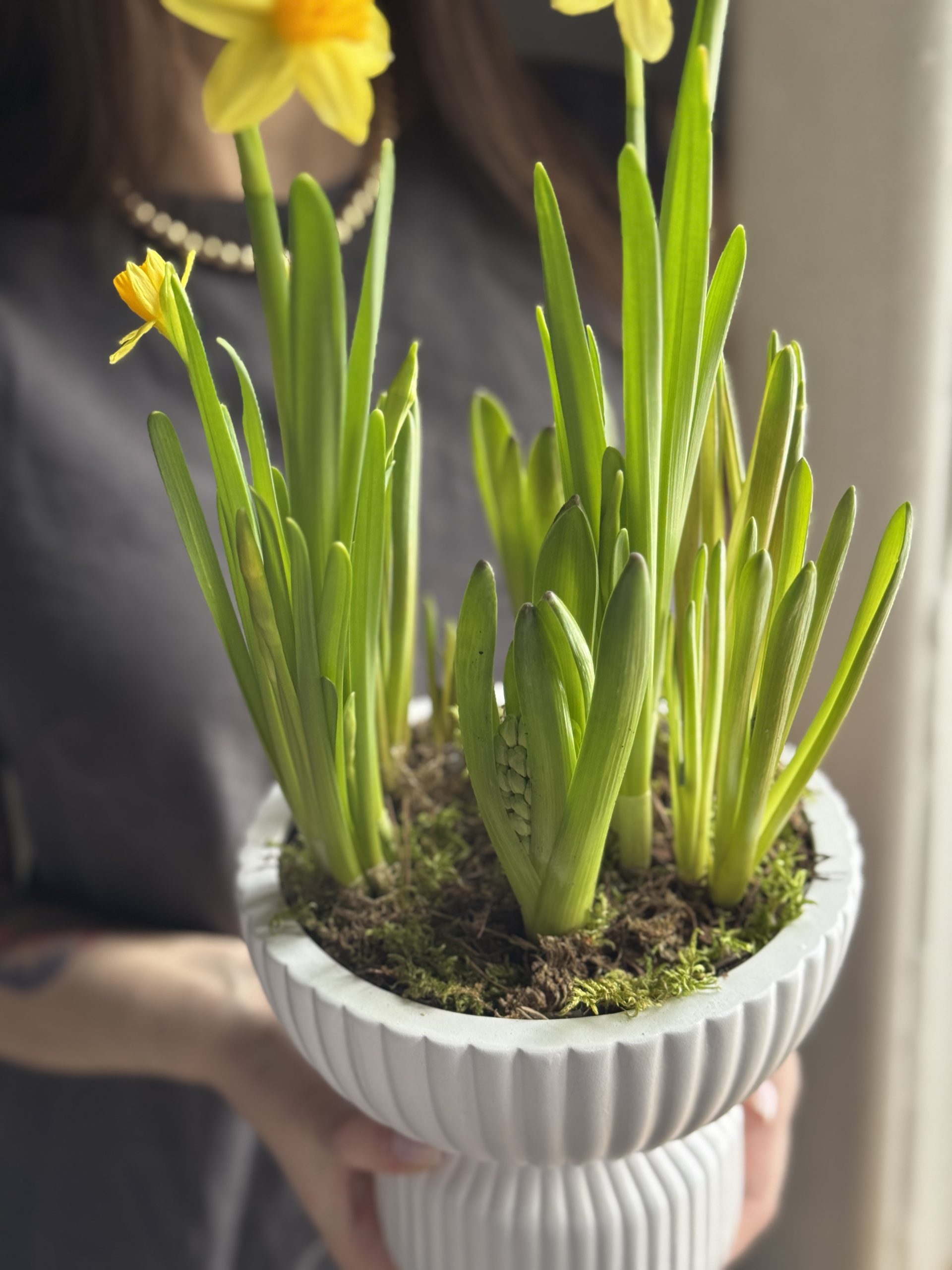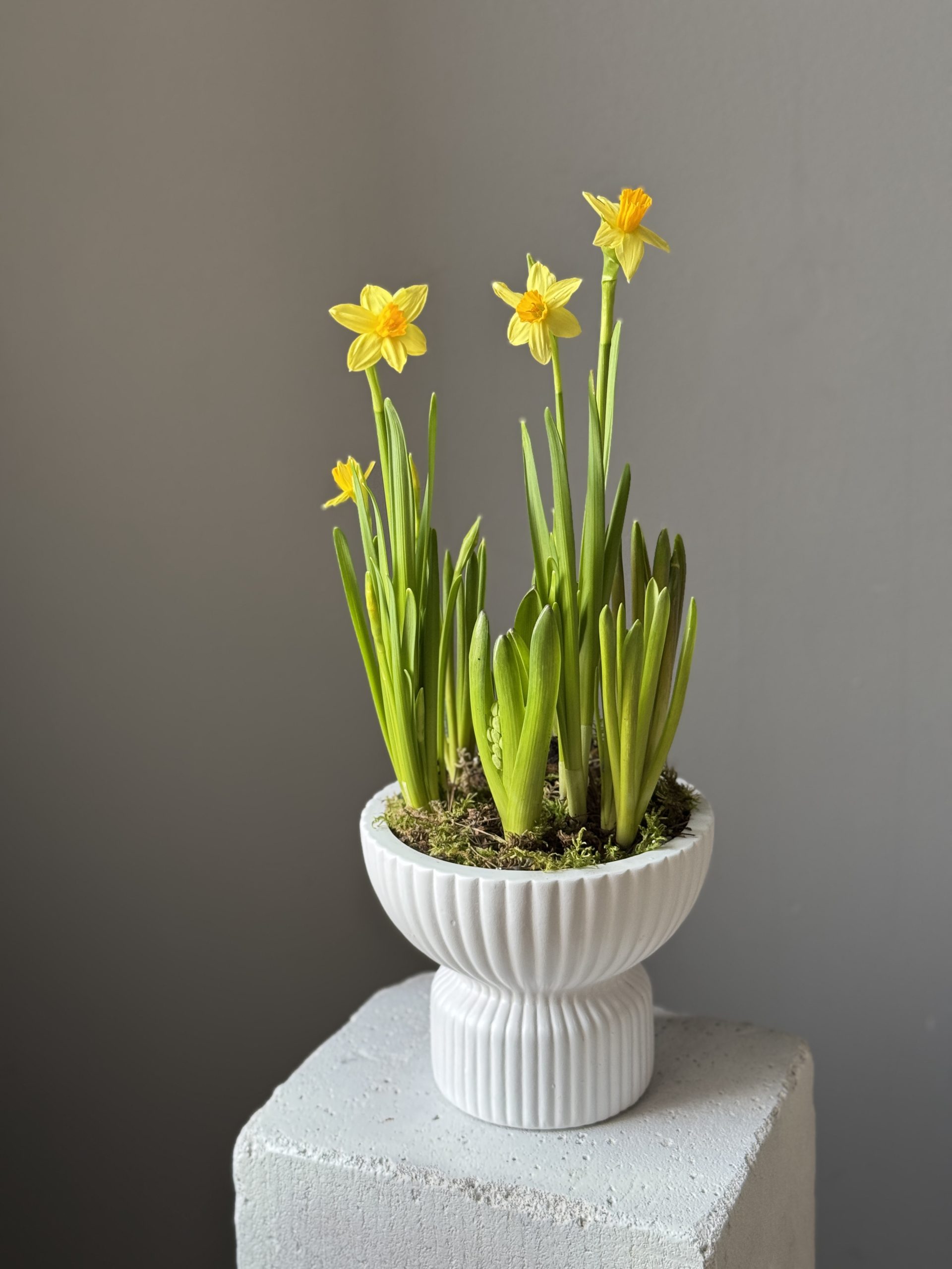 Описание: Композиция размером S в керамическом кашпо с луковицами нарциссов, мускари и гиацинтов.