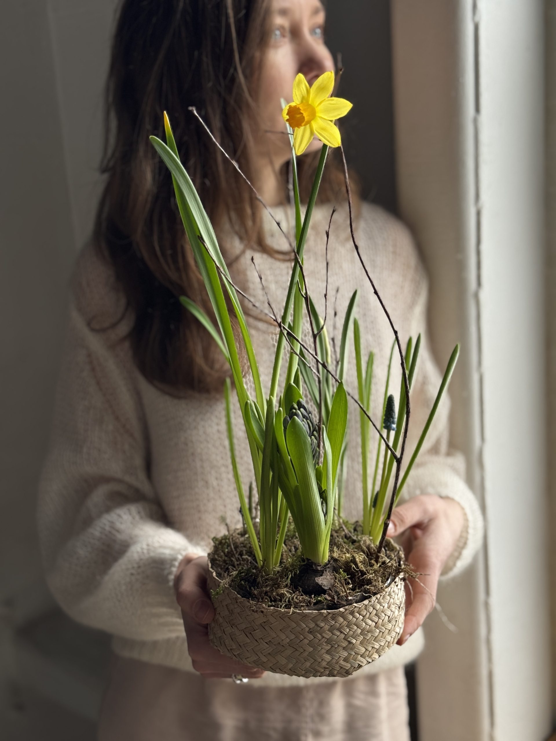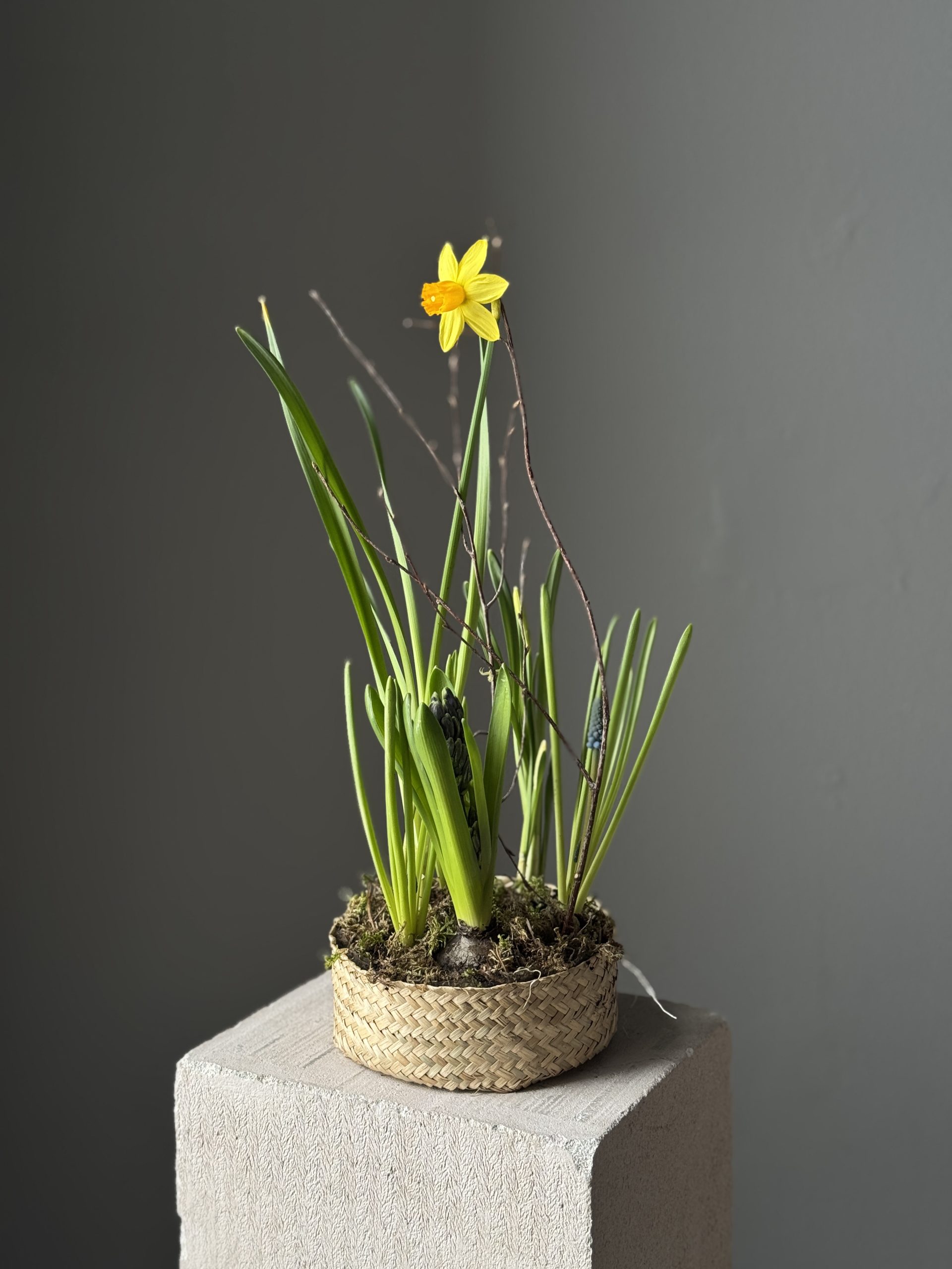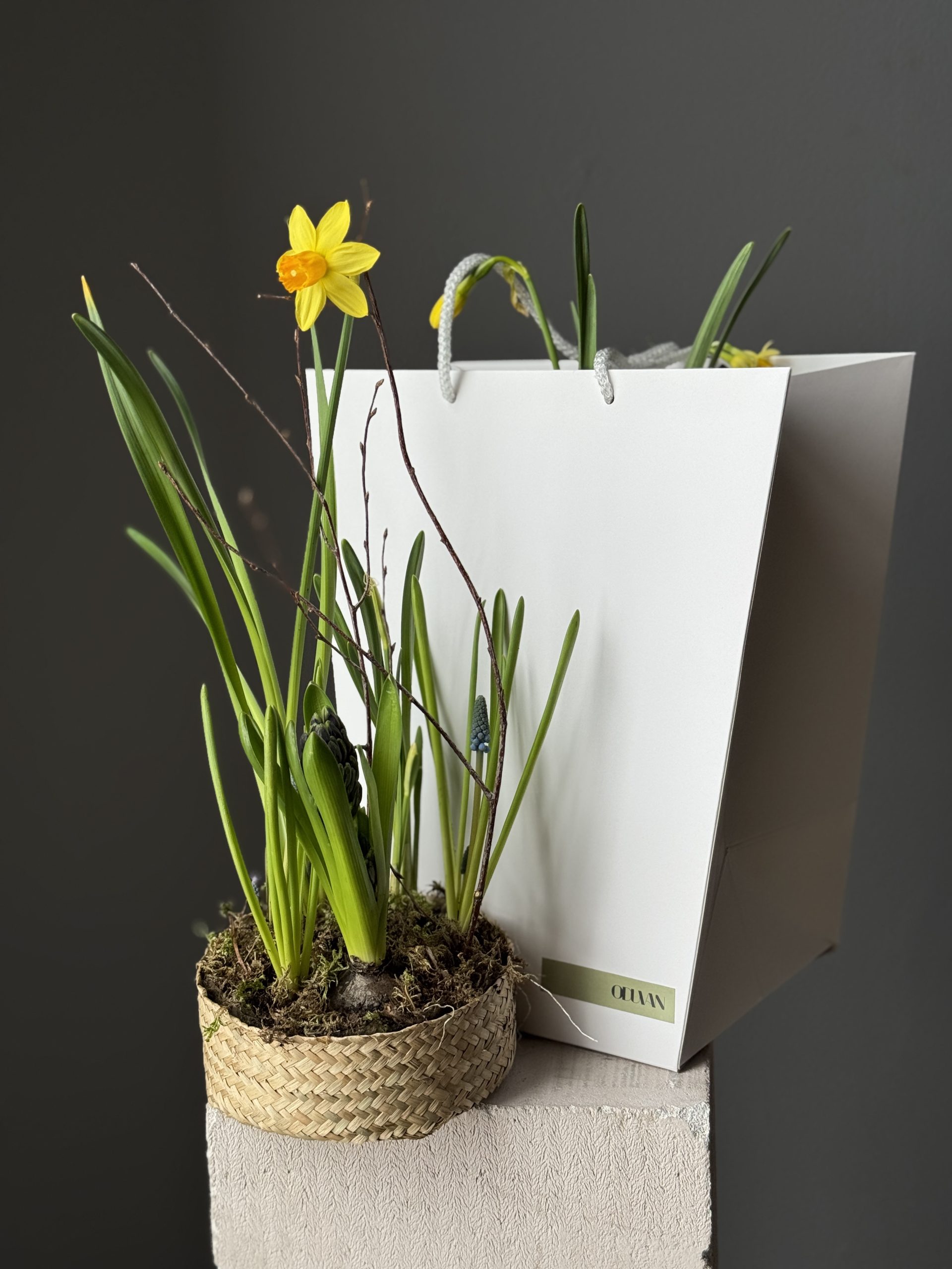 Описание: Композиция размером XS в плетеном кашпо с луковицами нарциссов, мускари и гиацинтов и ветками березы.