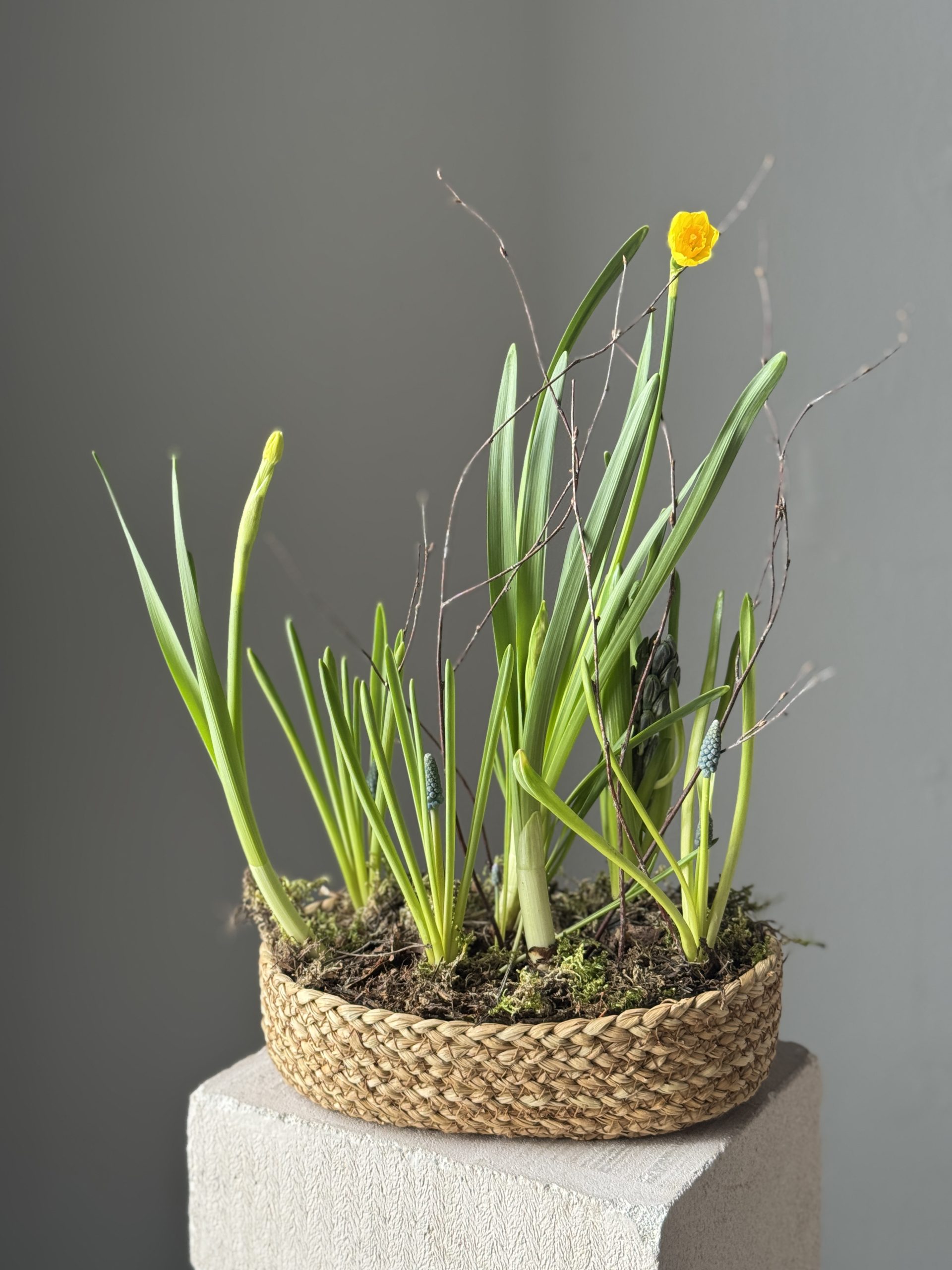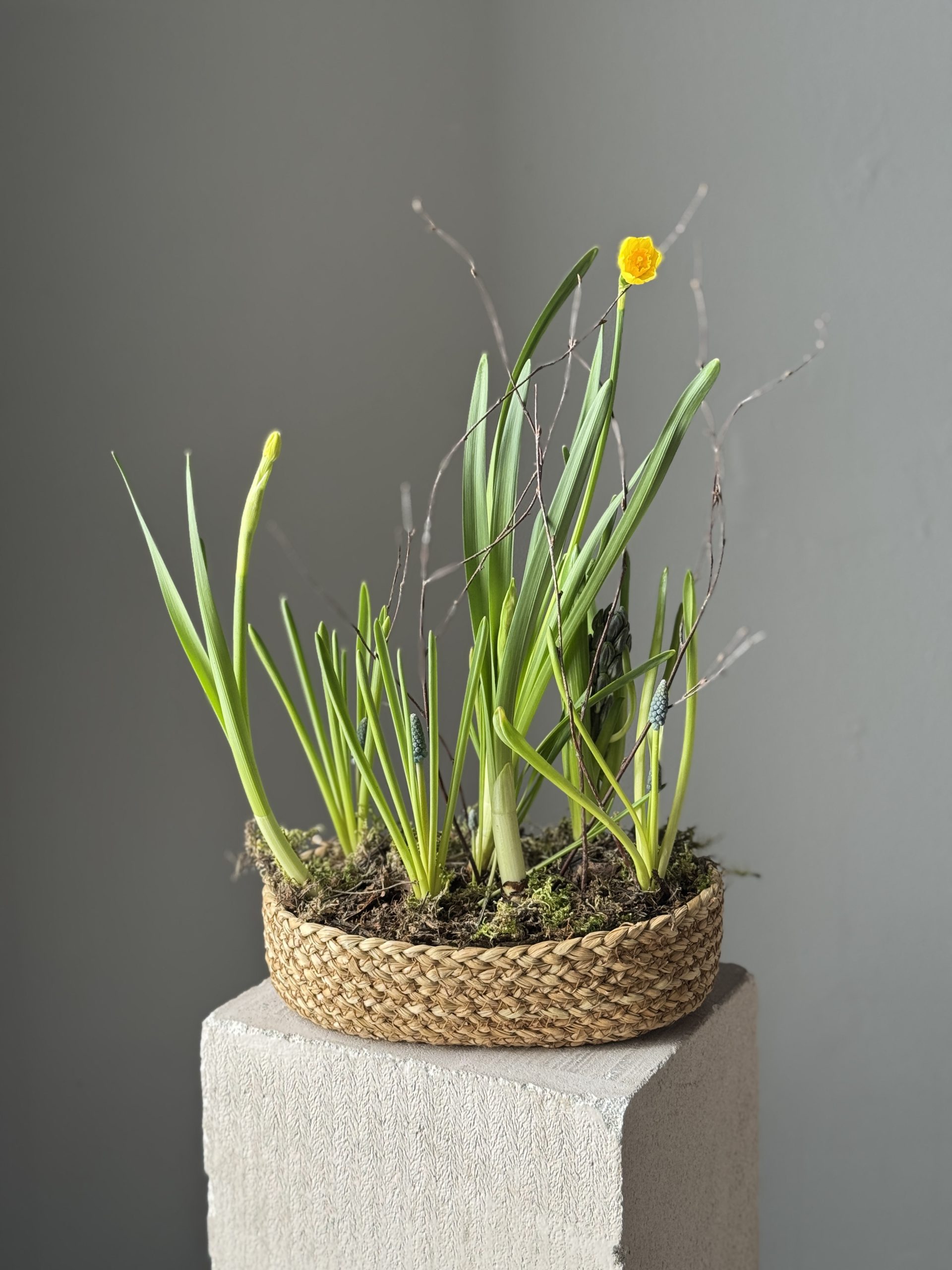 Описание: Композиция размером S в плетеном кашпо с луковицами нарциссов, мускари и гиацинтов.