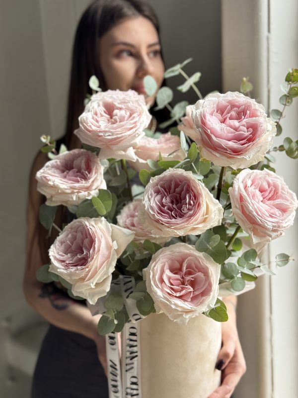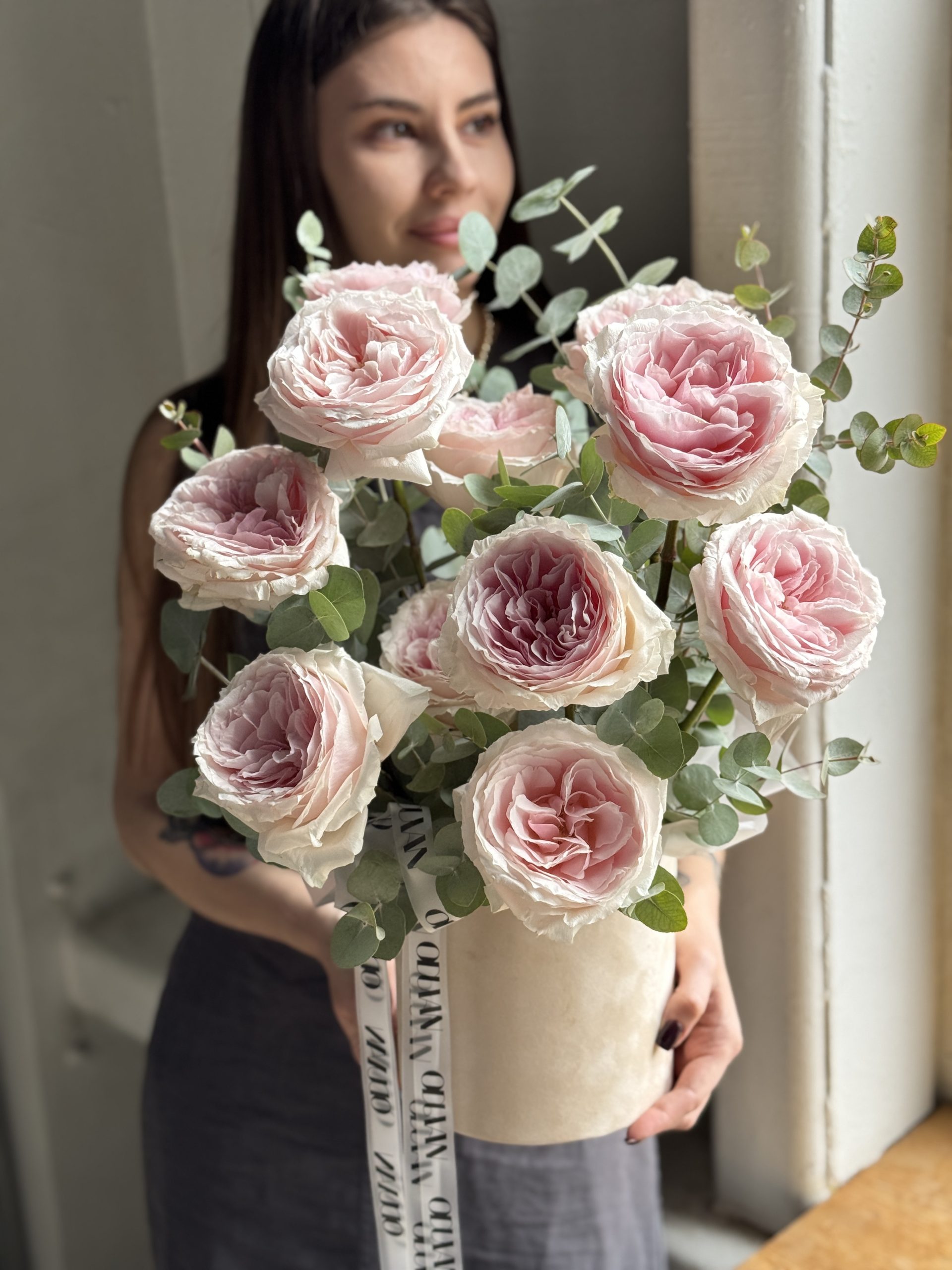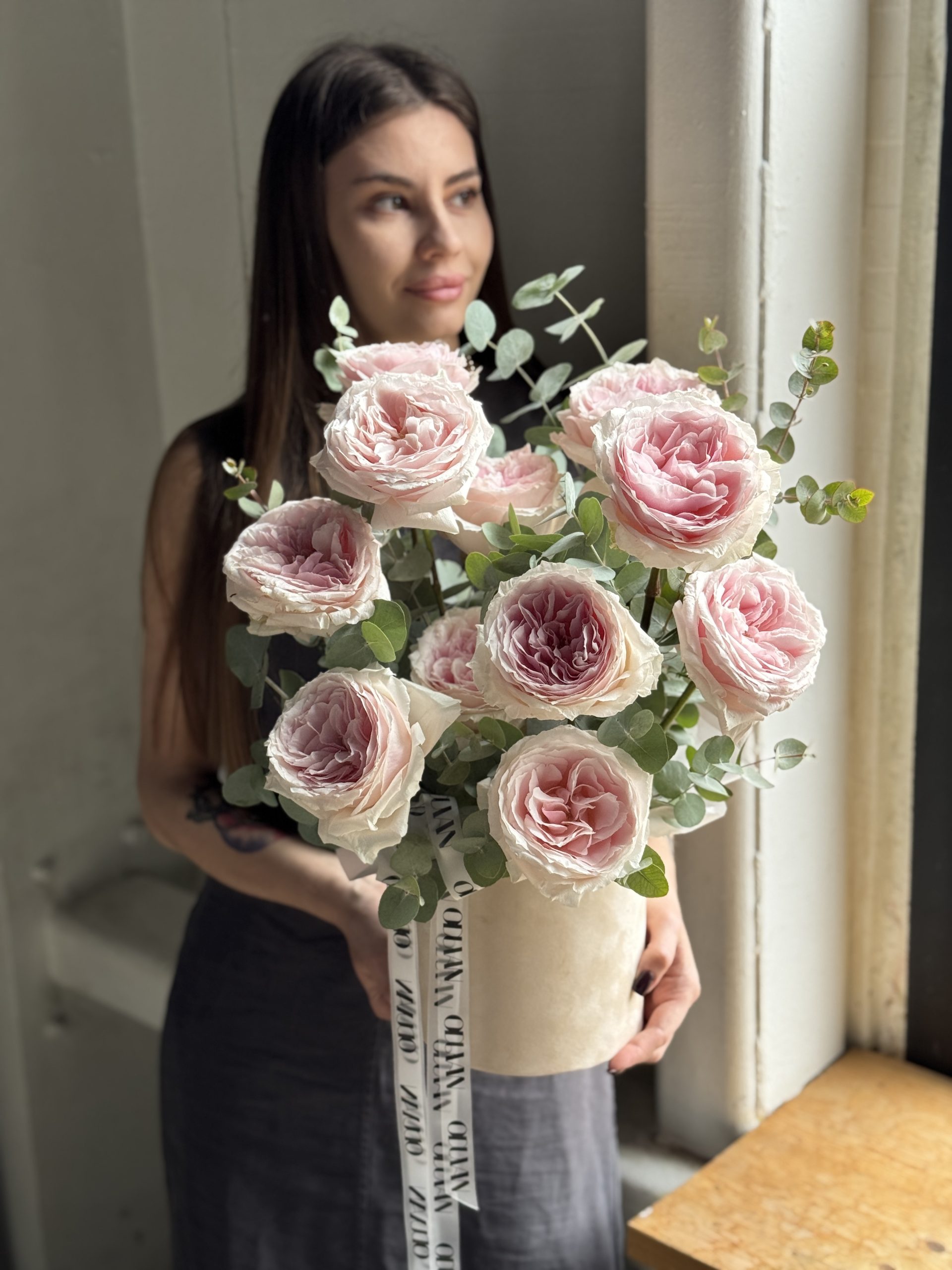 Описание: Композиция в бархатной коробке с пионовидными розами Тсумуги и веточками эвкалипта.