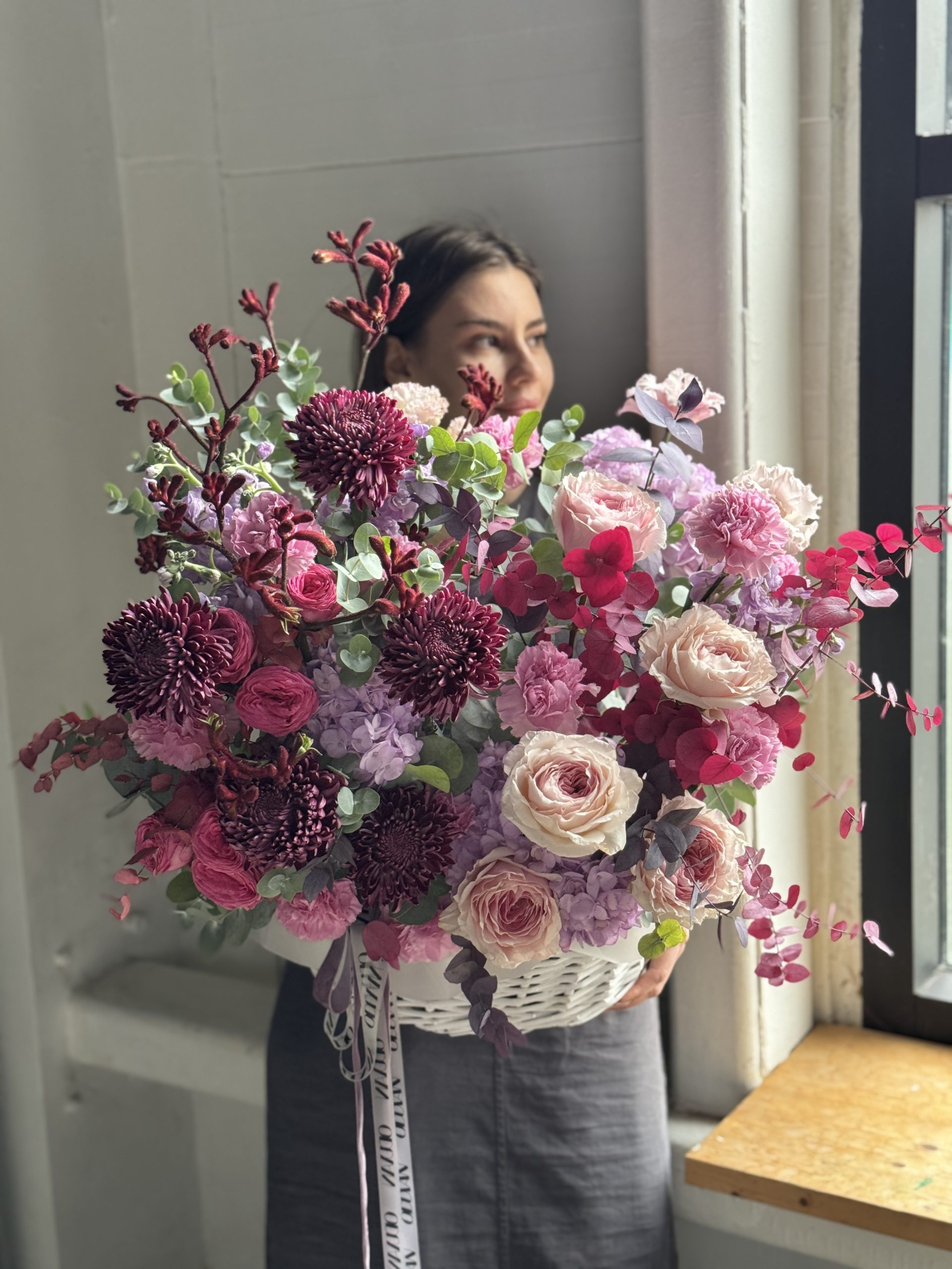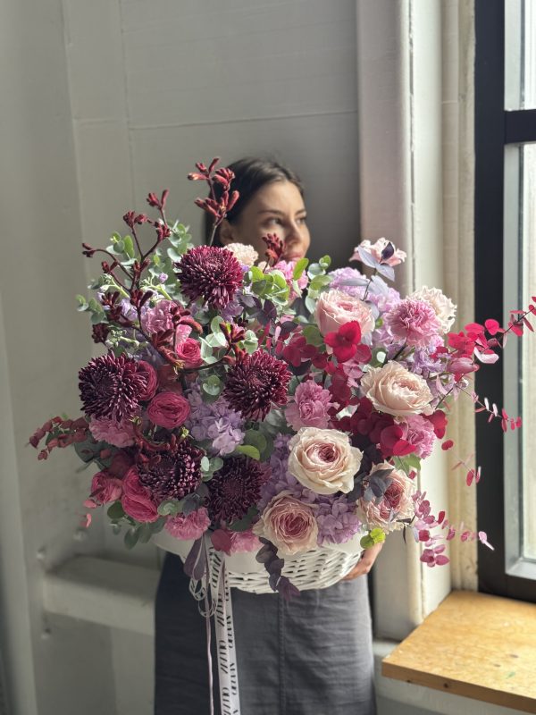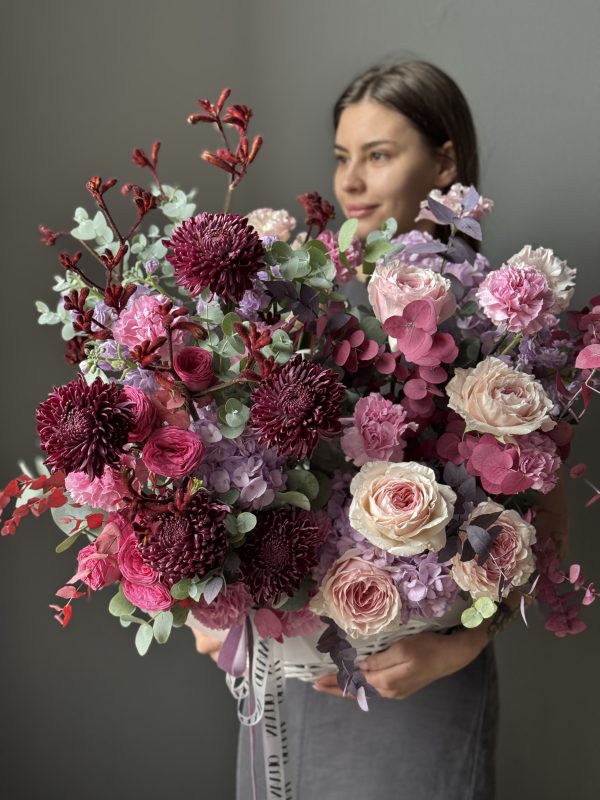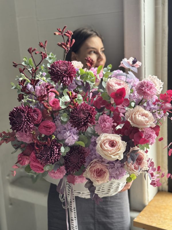 Описание: Композиция в корзине с хризантемами Бигуди, гортензиями, пионовидными розами, диантусами, ароматными маттиолами, веточками анигозантуса, эустомами, кустовыми пионовидными розами и миксом веточек эвкалипта.