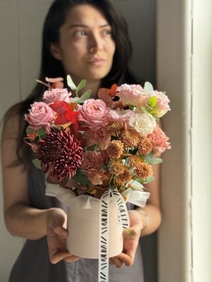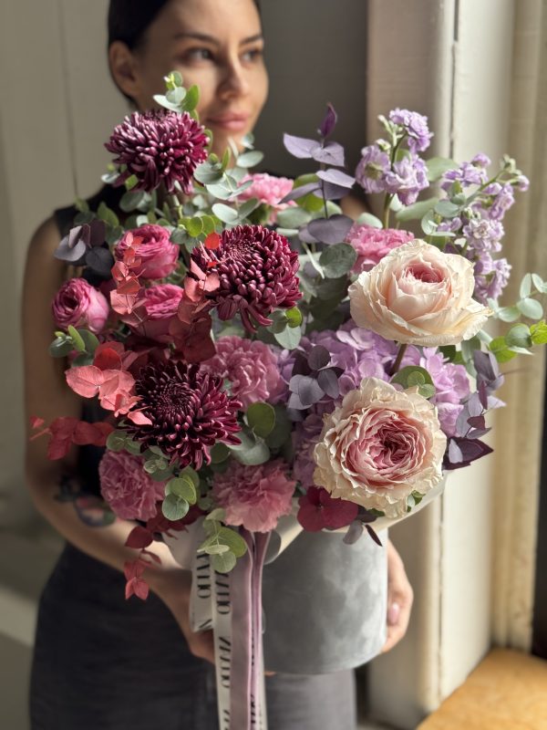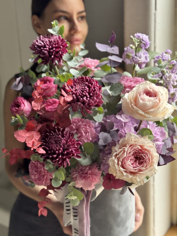 Описание: Композиций в бархатной коробке с гортензией, хризантемами Бигуди, пионовидными розами, диантусами, ароматной маттиолой, кустовой пионовидной розой и миксом веточек эвкалипта.