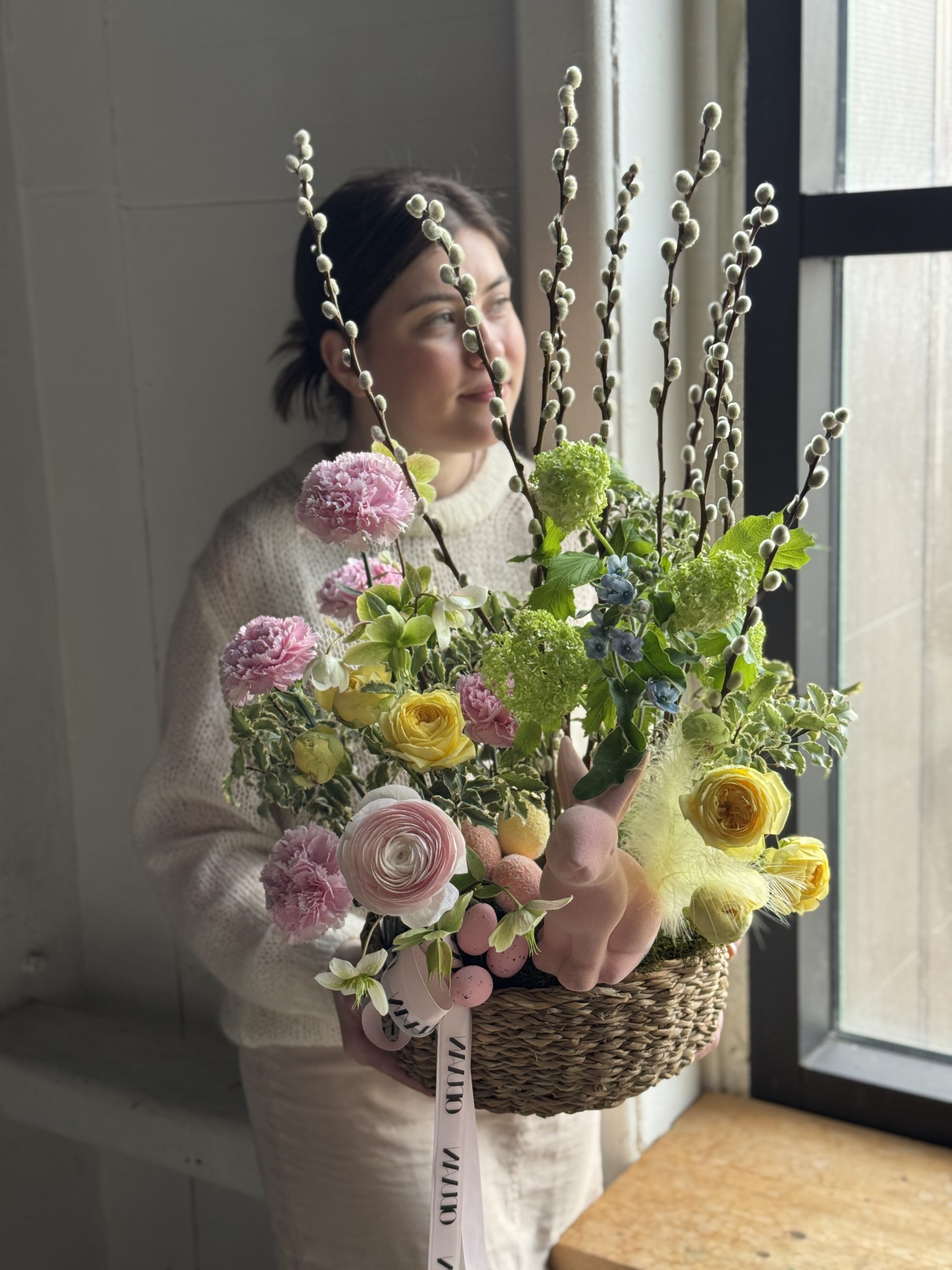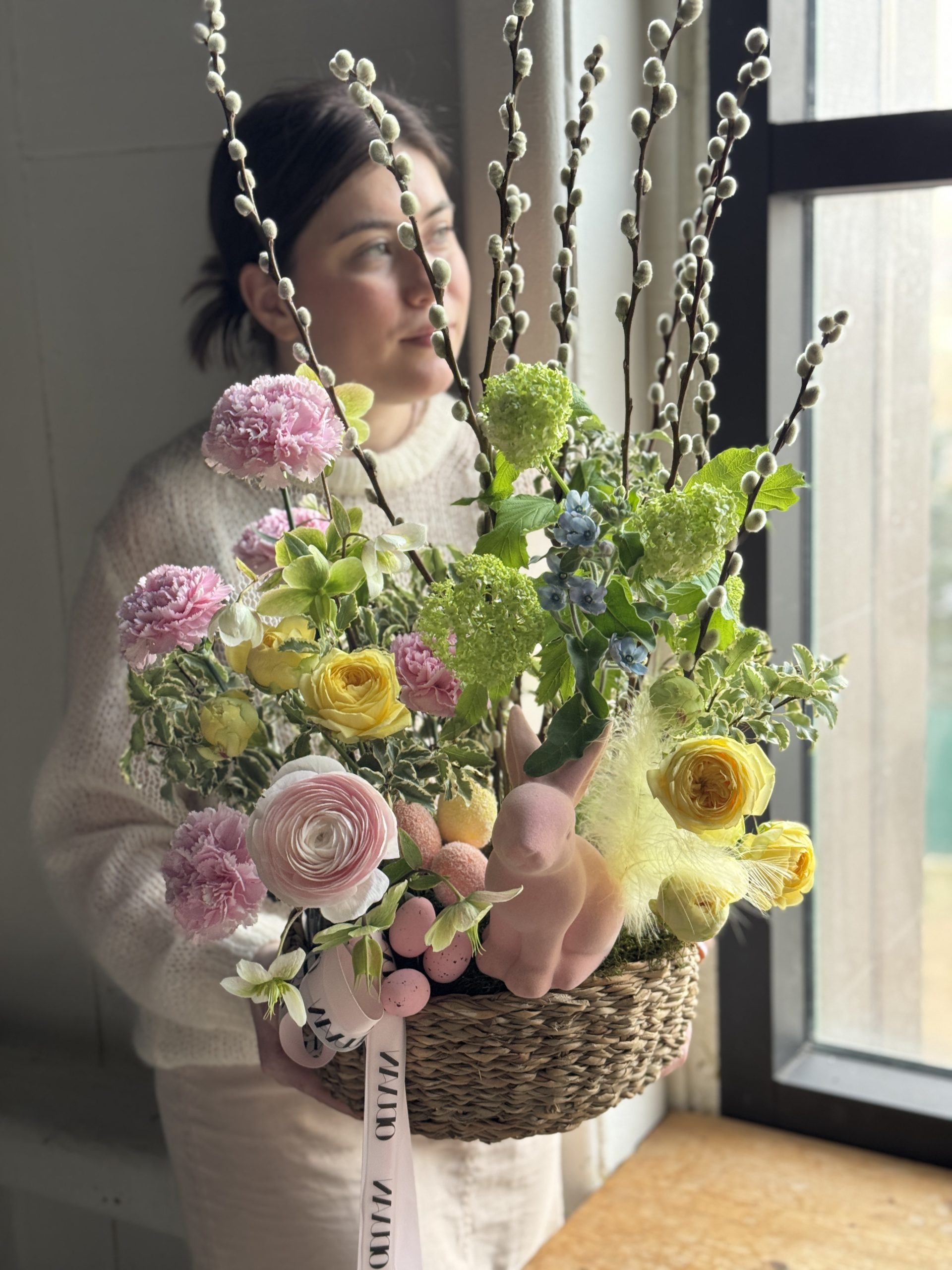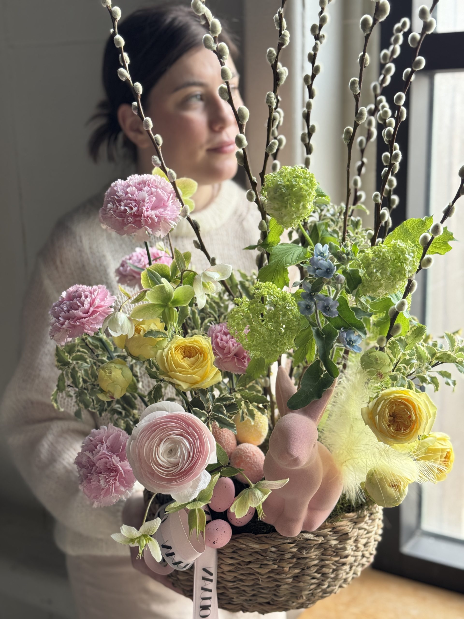 Описание: Композиция в плетеном кашпо с ранункулюсом, кустовыми розами Луна Трендсеттер, твидией, хелеборусом, зеленым вибурнумом, диантусами, вербой и пасхальным декором.