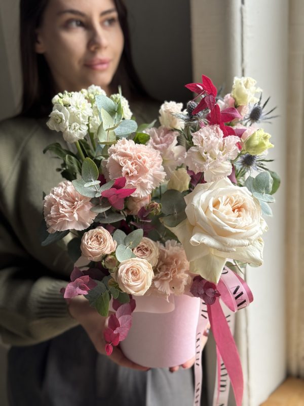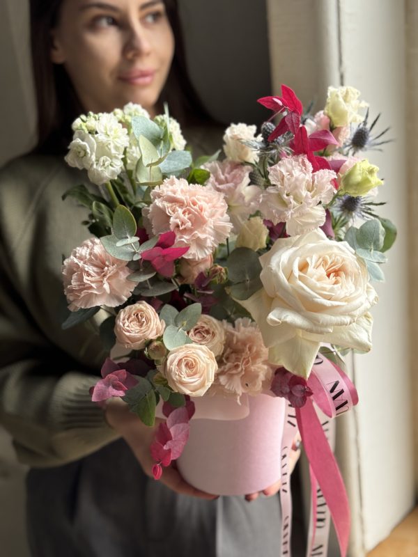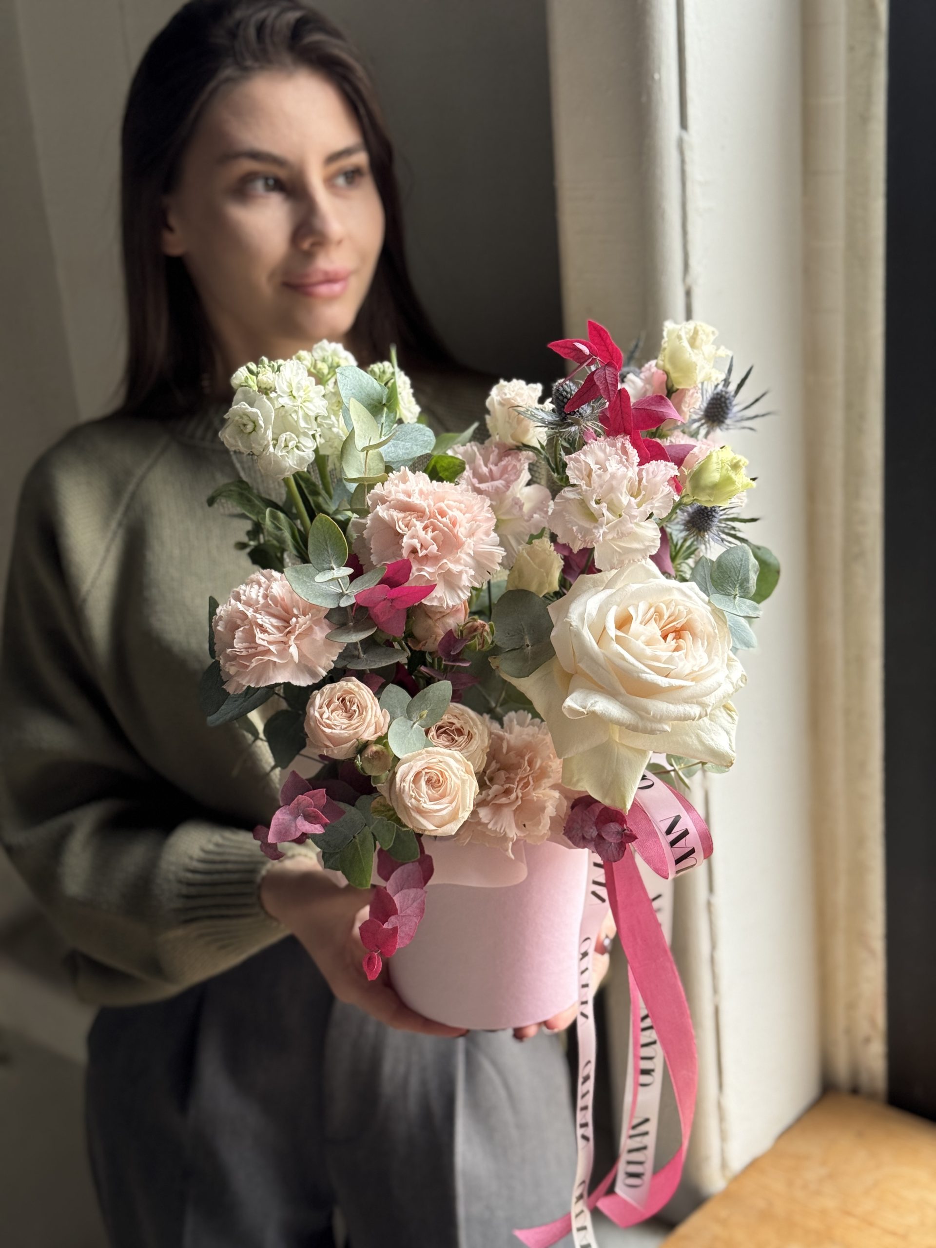 Описание: Композиция в коробке с ароматной розой Вайт Охара, пионовидной кустовой розой Бомбастик, диантусами, кустовой маттиолой, эустомой, эрингиумом и миксом веточек эвкалипта.