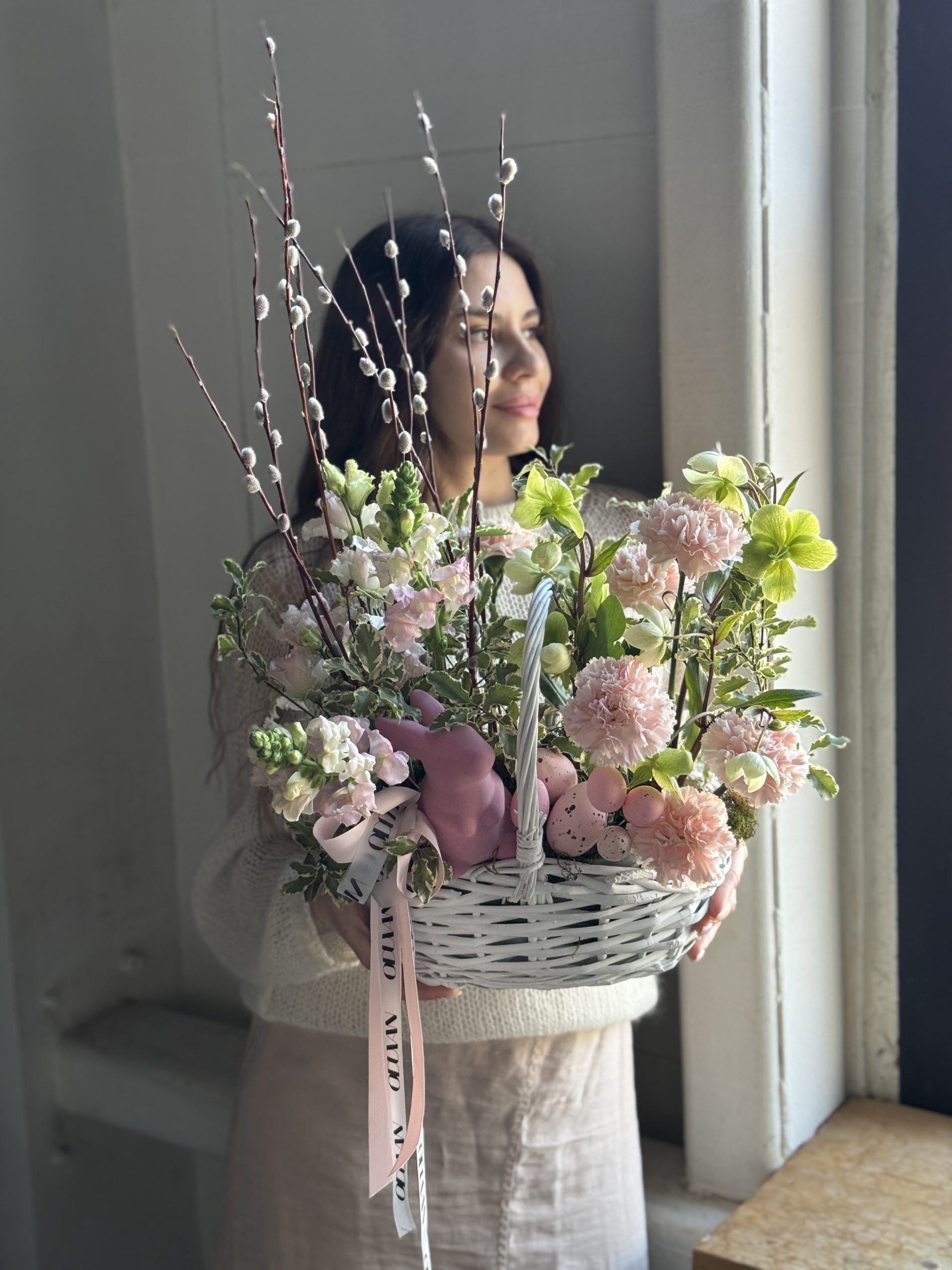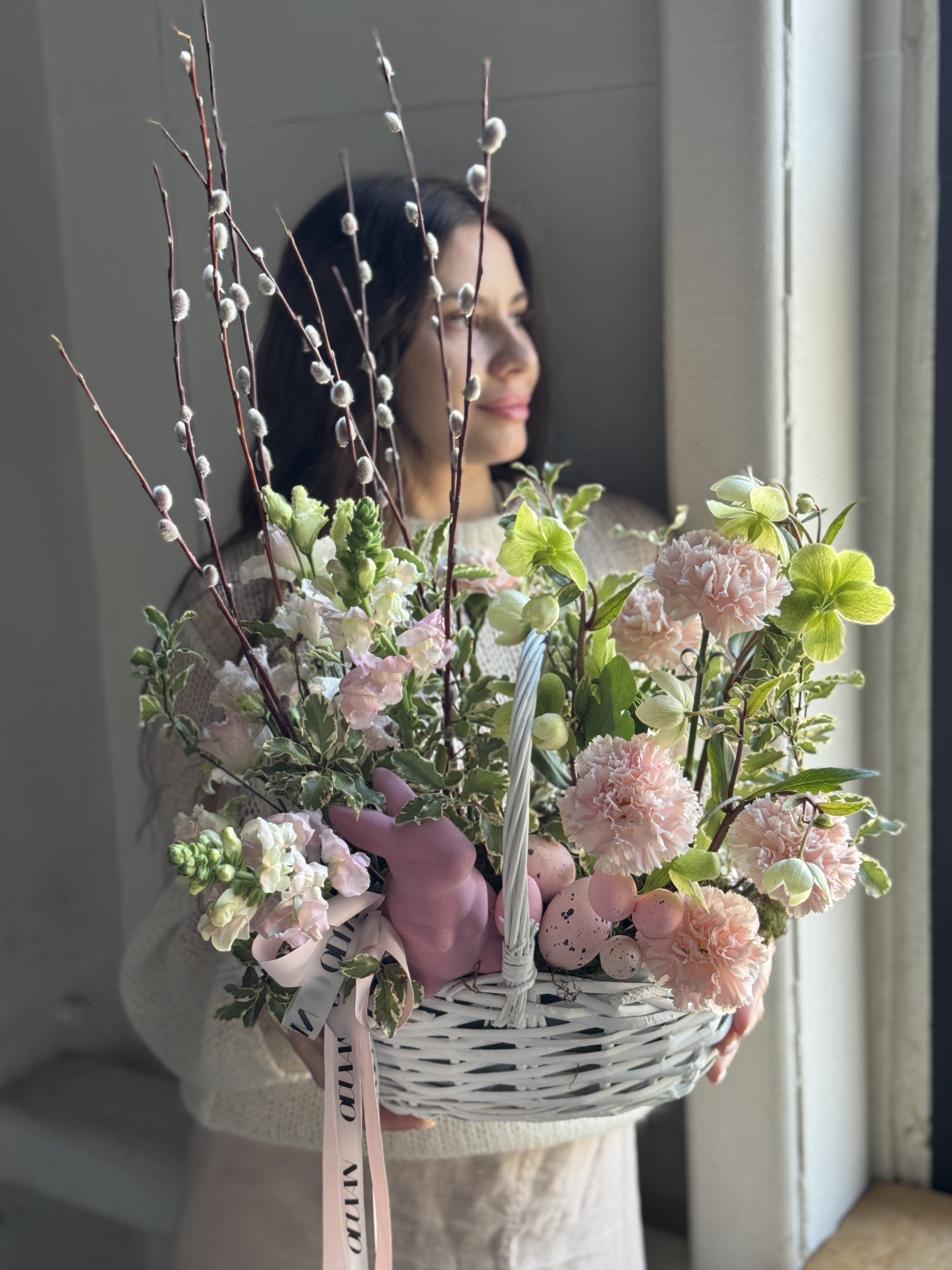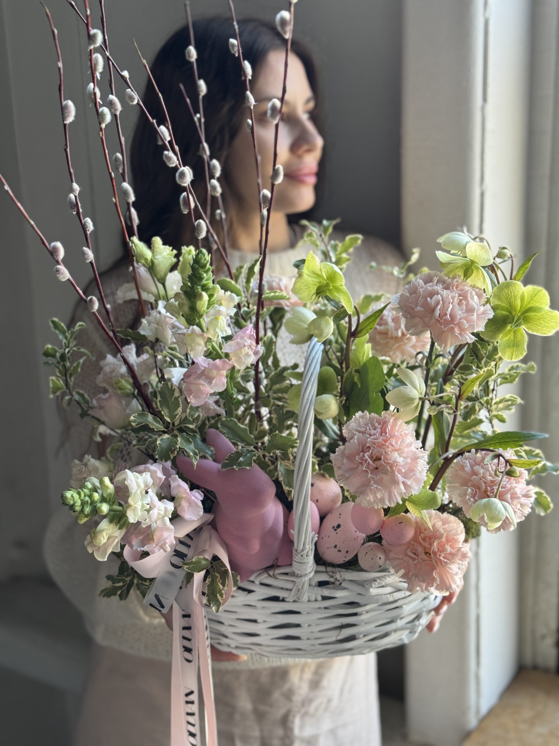Описание: Композиция в корзинке с эустомой, леувенбеками, сортовыми гвоздиками, хелеборусом, веточками вербы и пасхальным декором.