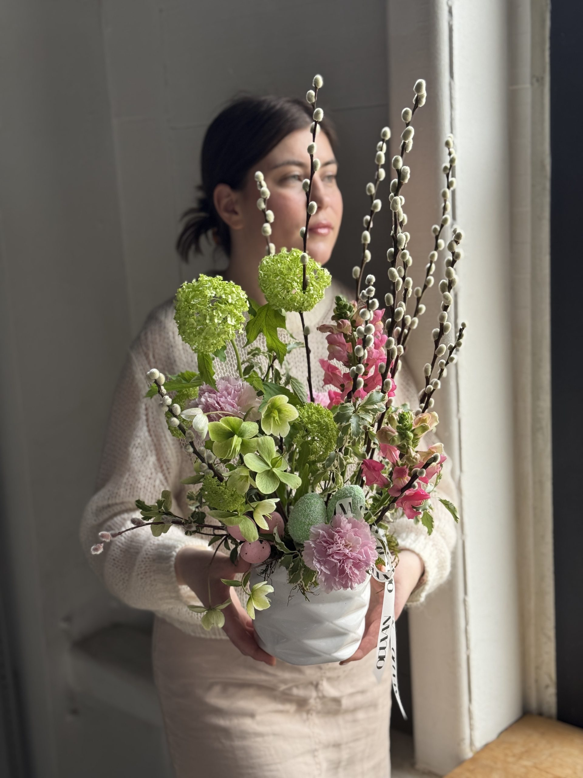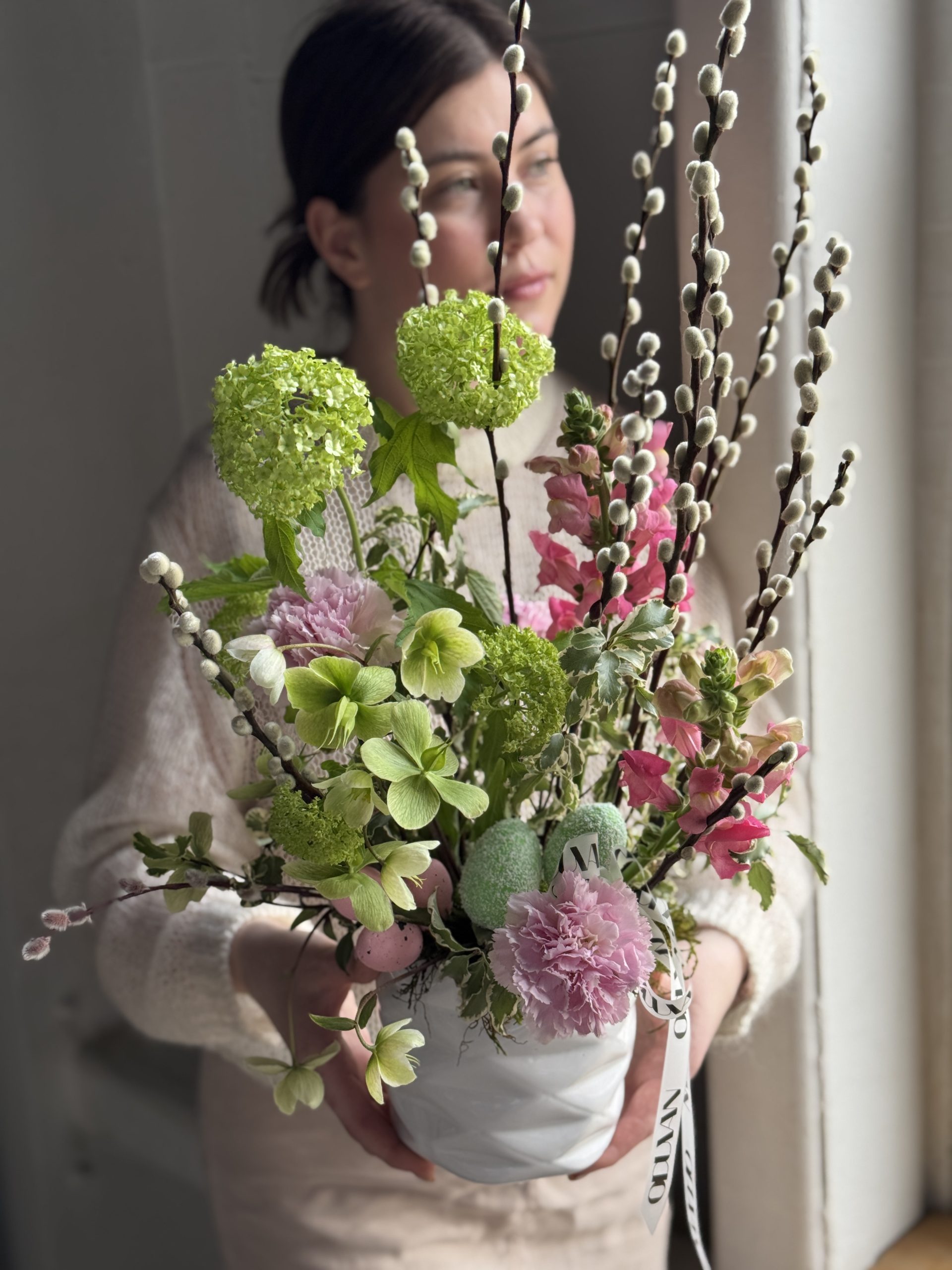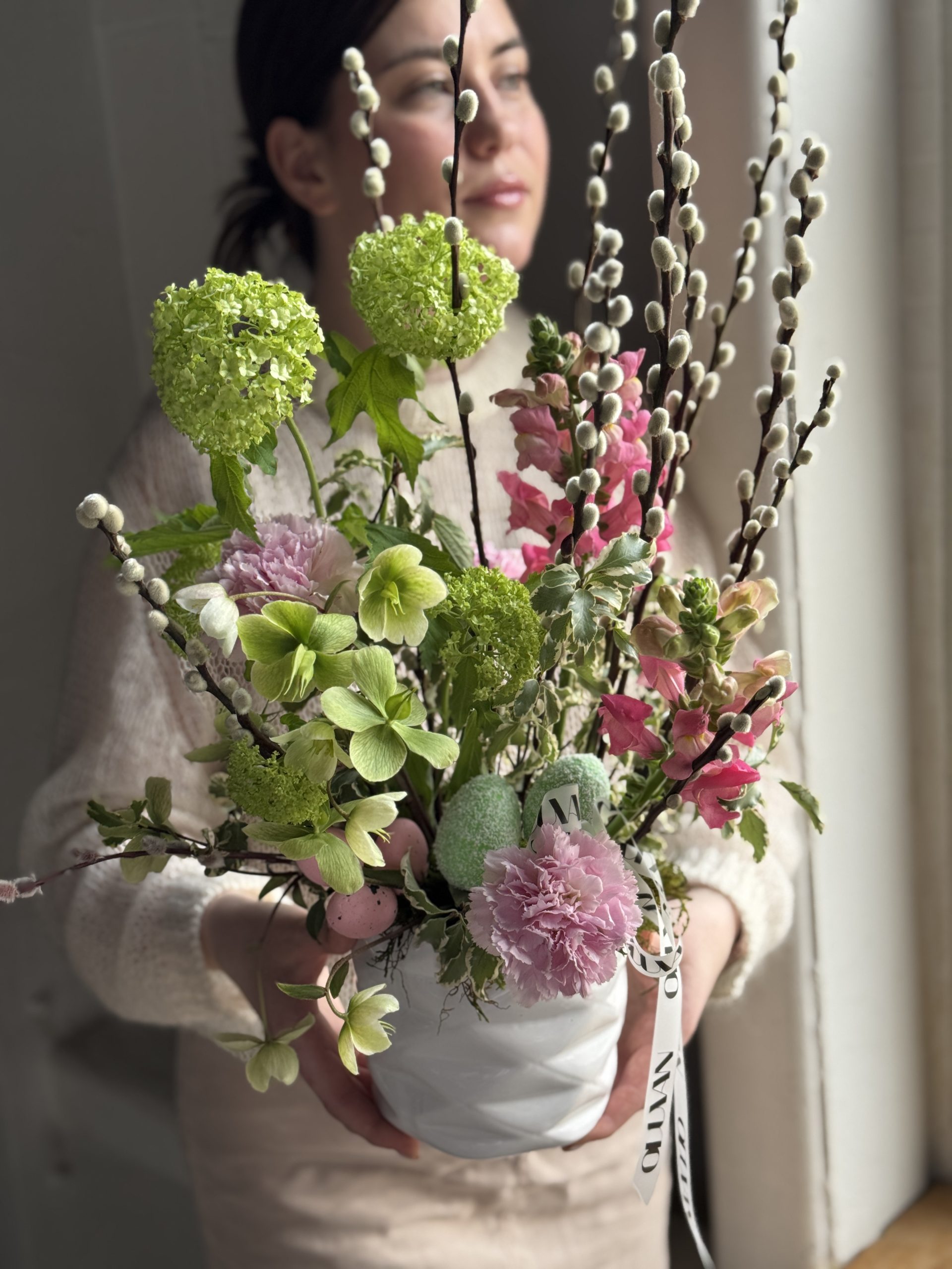 Описание: Композиция в керамическом кашпо с сортовой гвоздикой, хелеборусом, леувенбеками, вибурнумом, веточками вербы, зеленью питтоспорума и пасхальным декором.