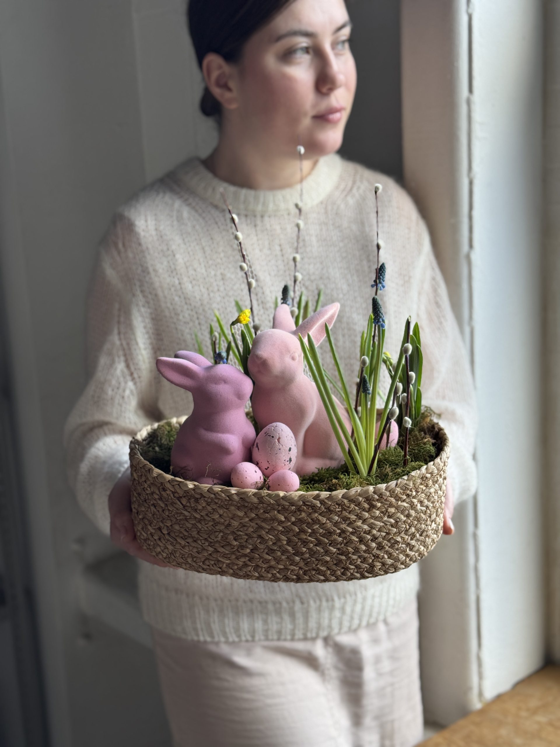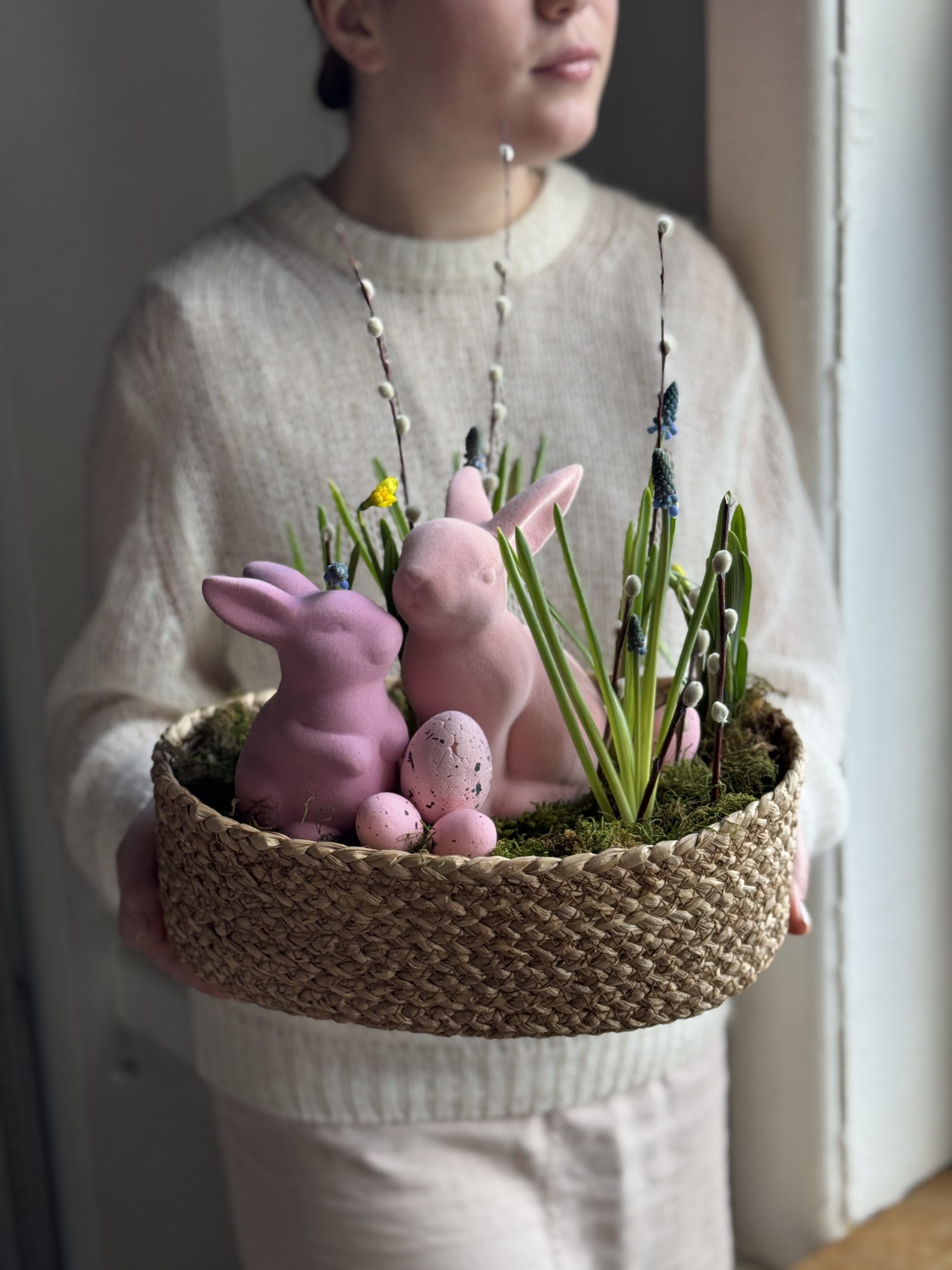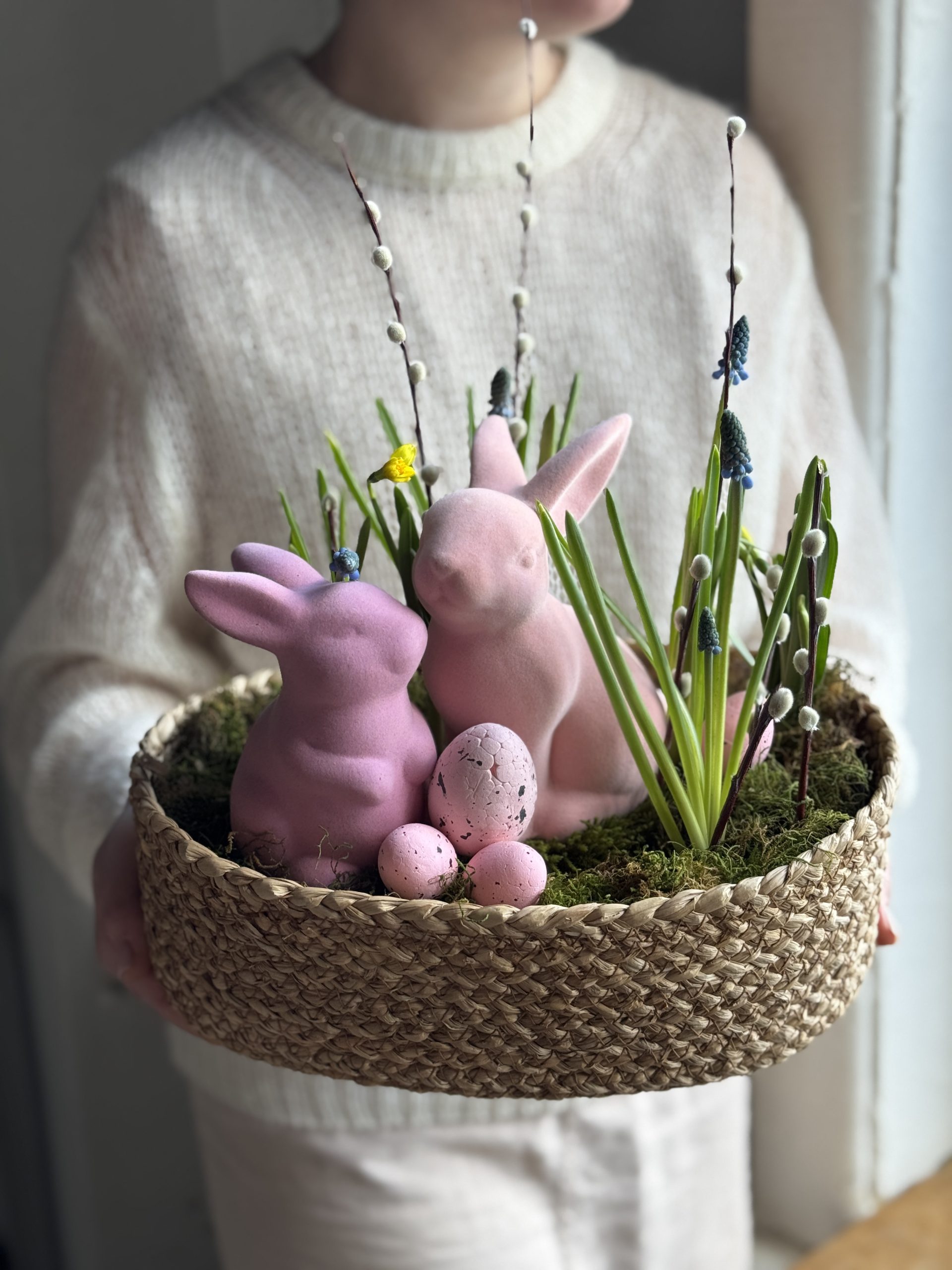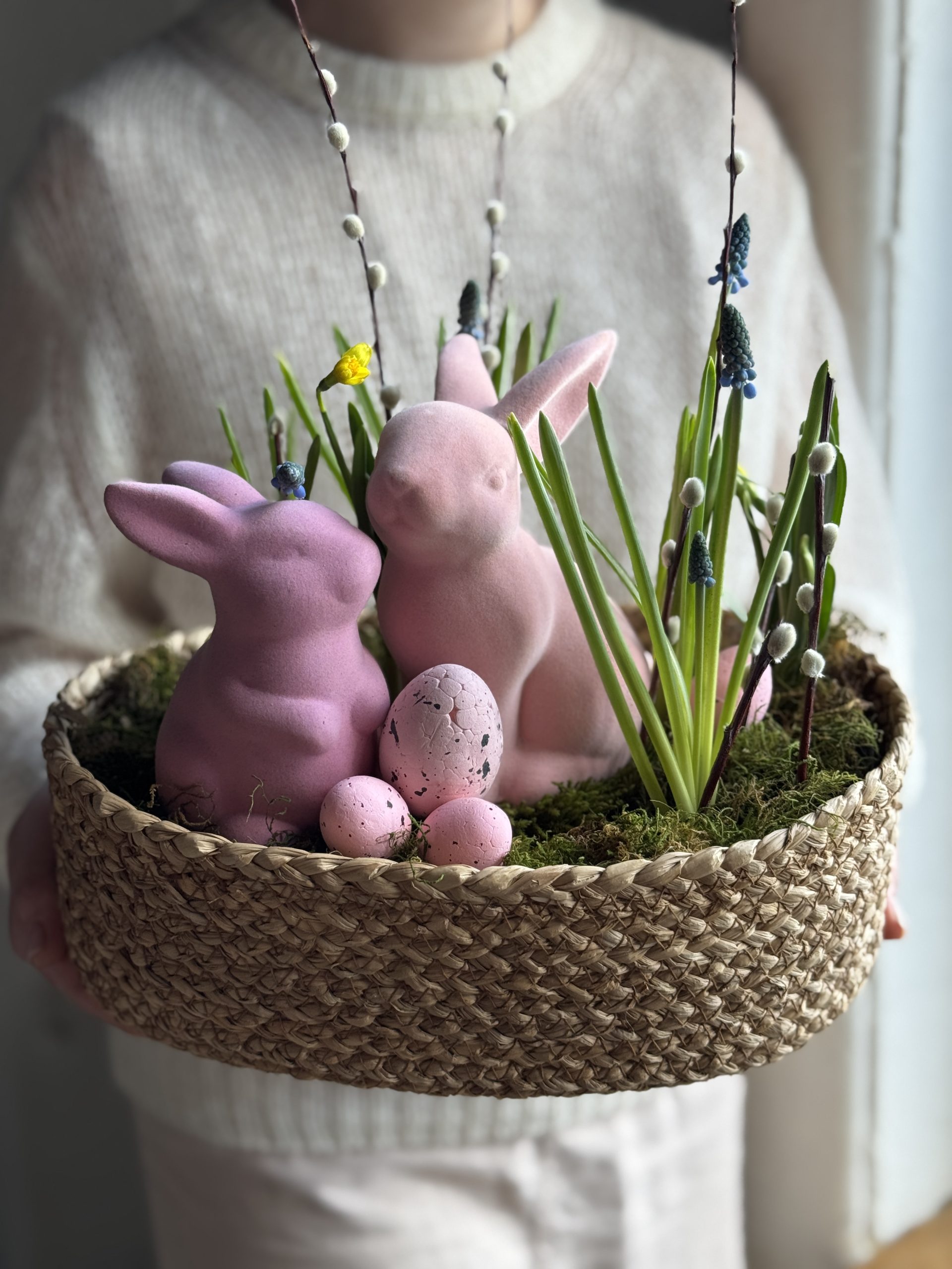 Описание: Композиция в плетеном кашпо с луковицами Мускари, вербой, мхом,нарциссами и пасхальным декором.