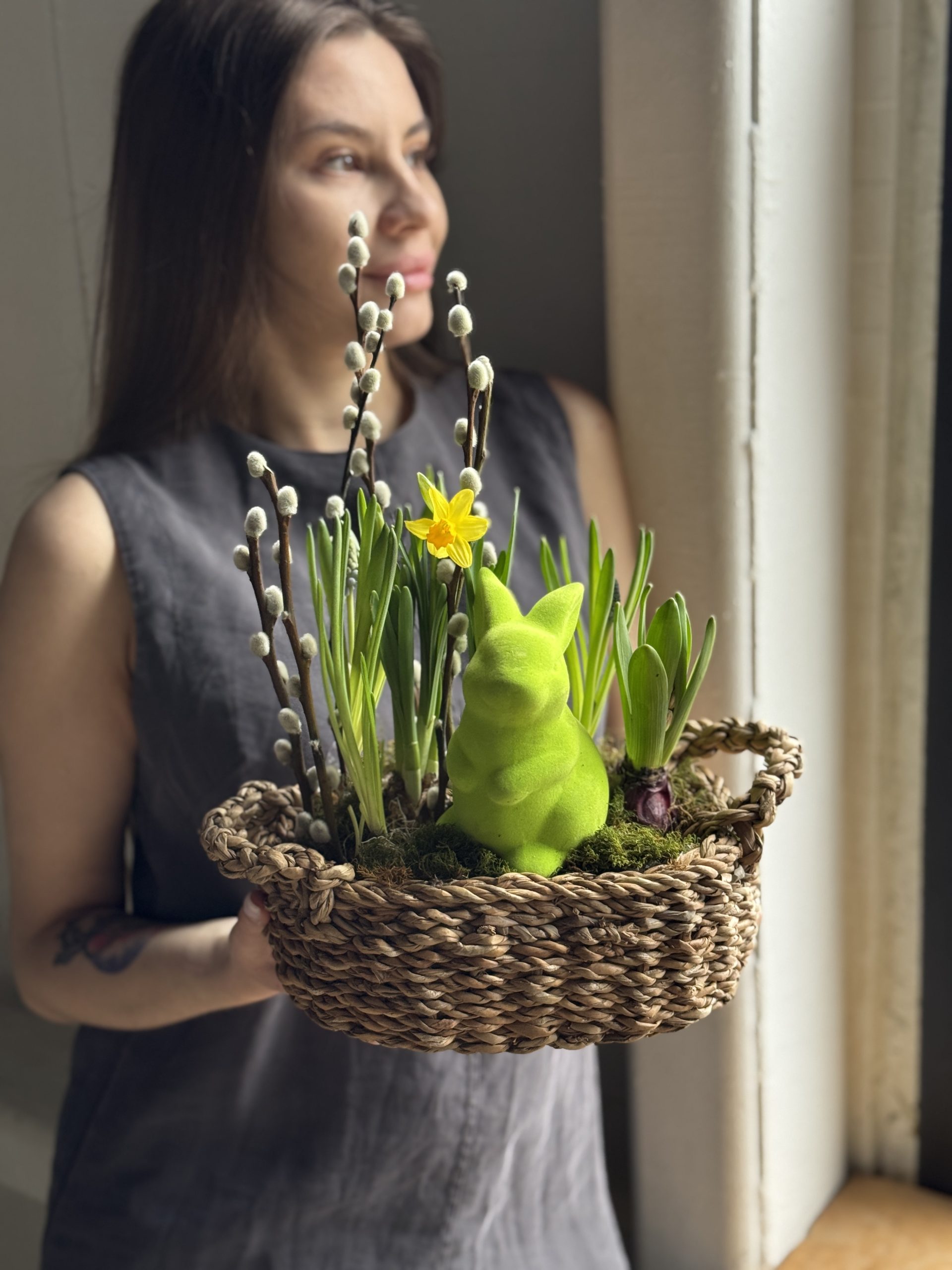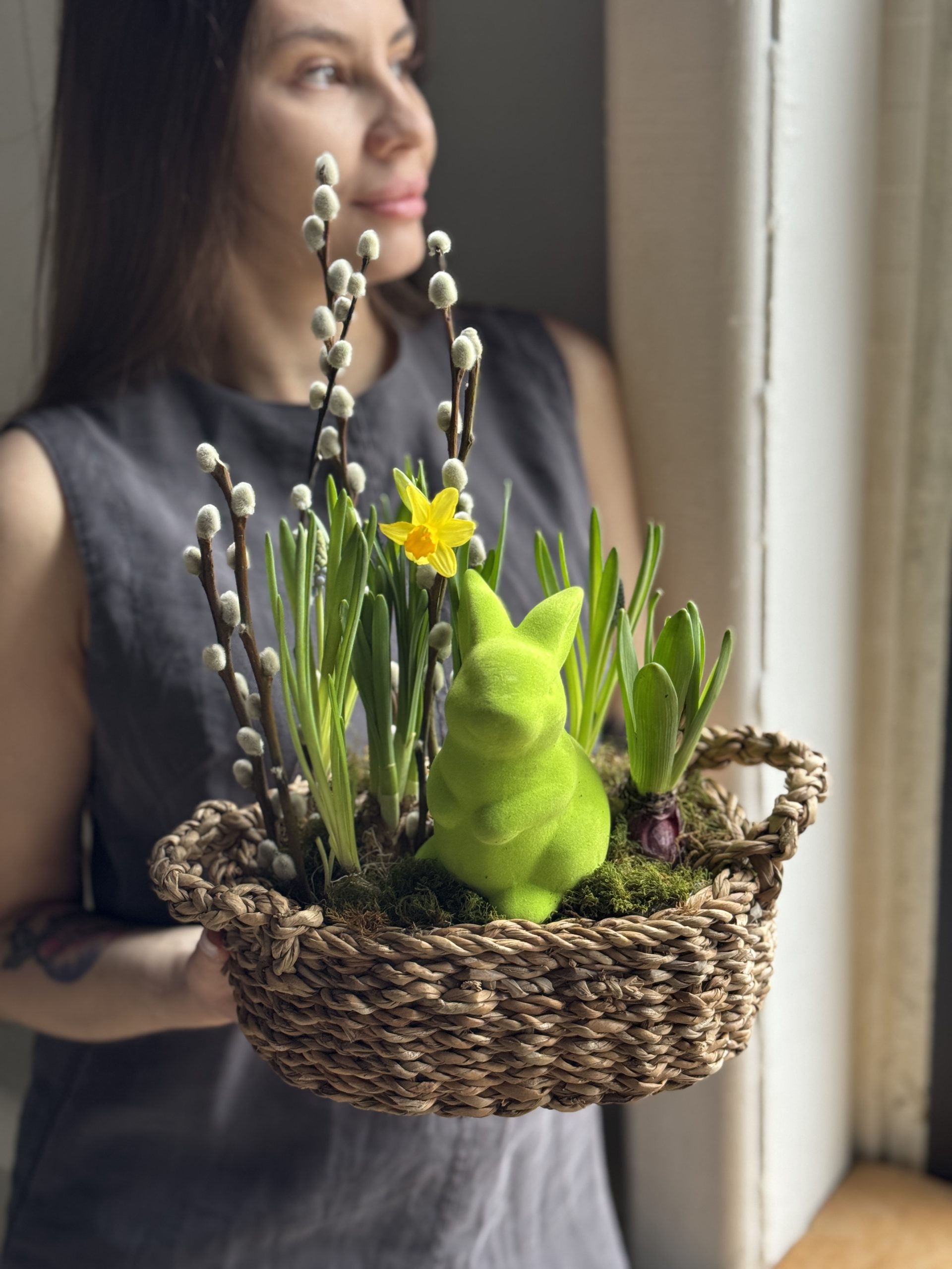 Описание: Композиция размером S в плетеном кашпо с луковицами нарциссов, мускари, гиацинтов, веточками вербы и пасхальным декором.