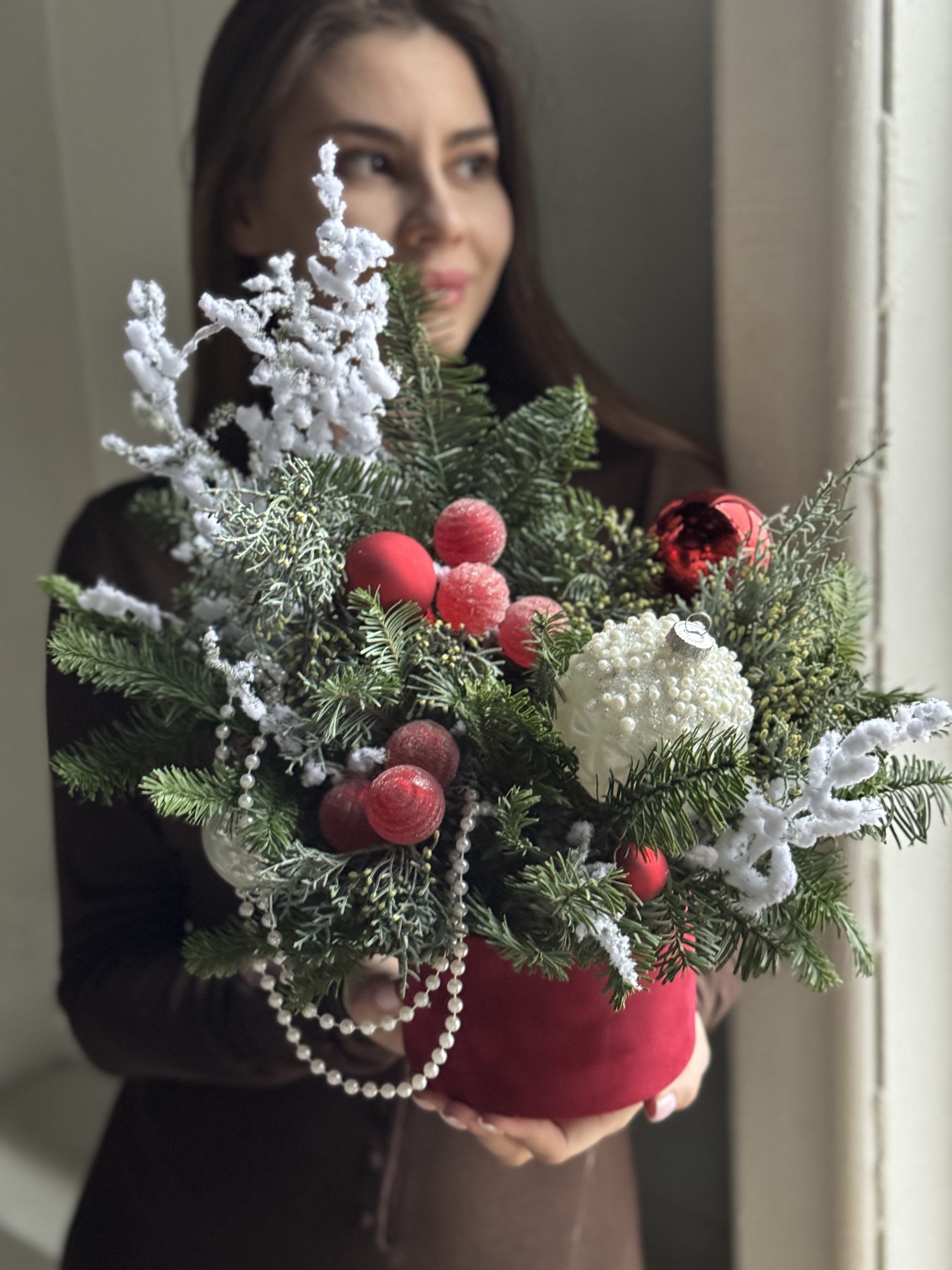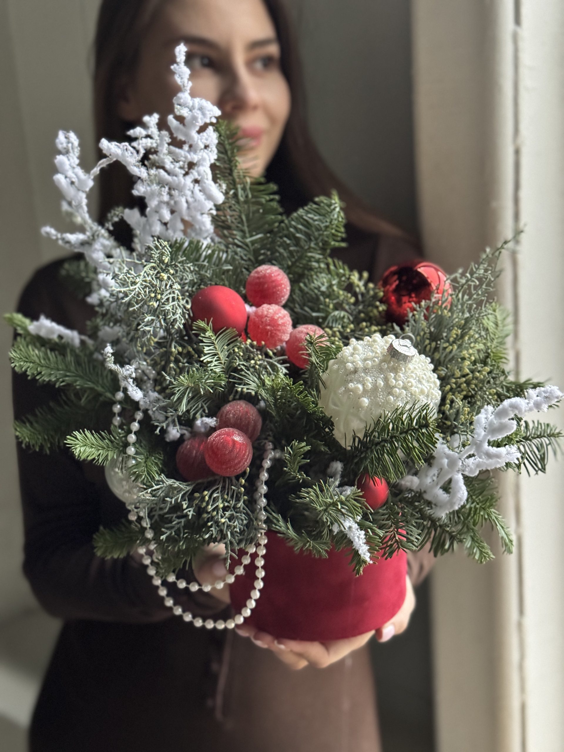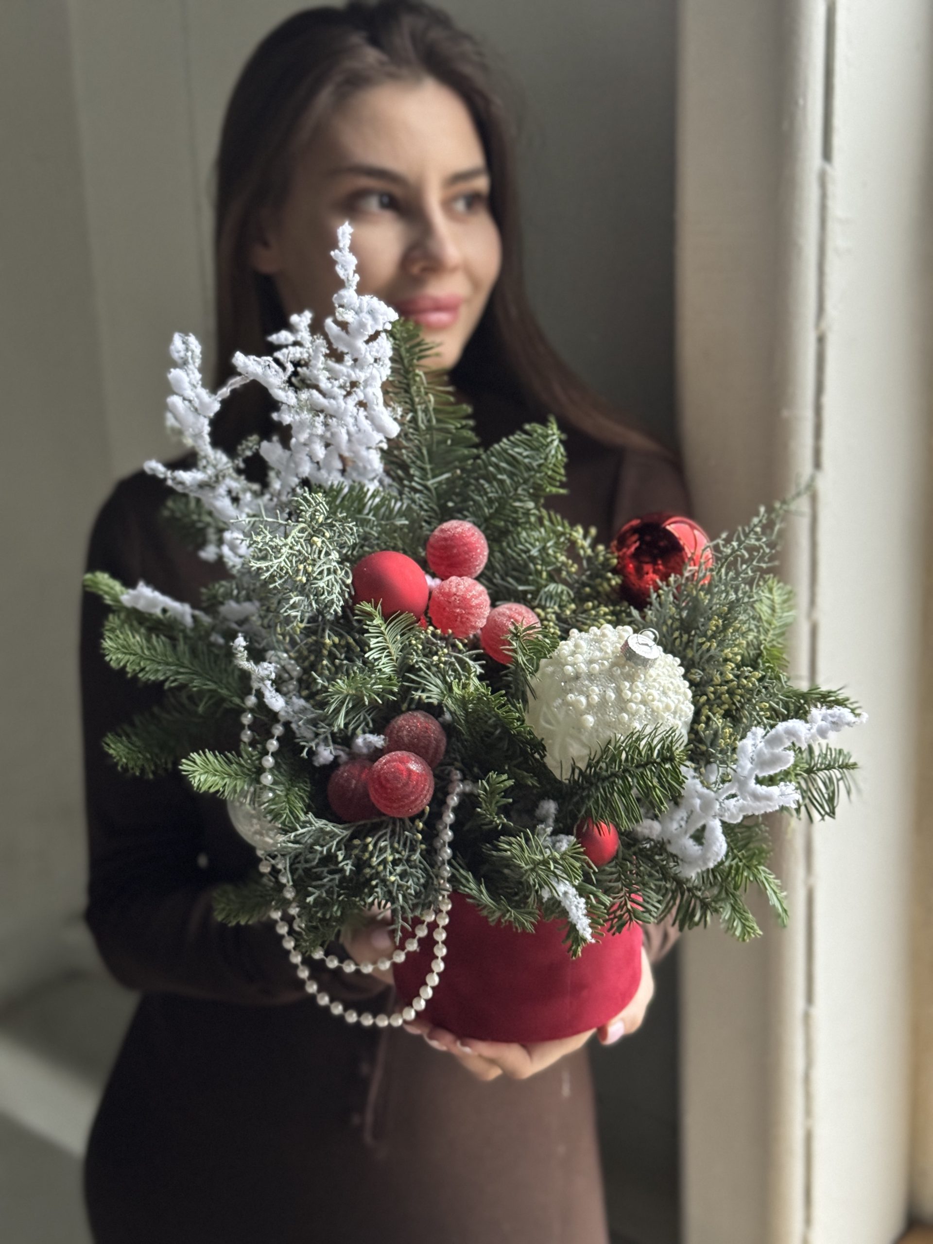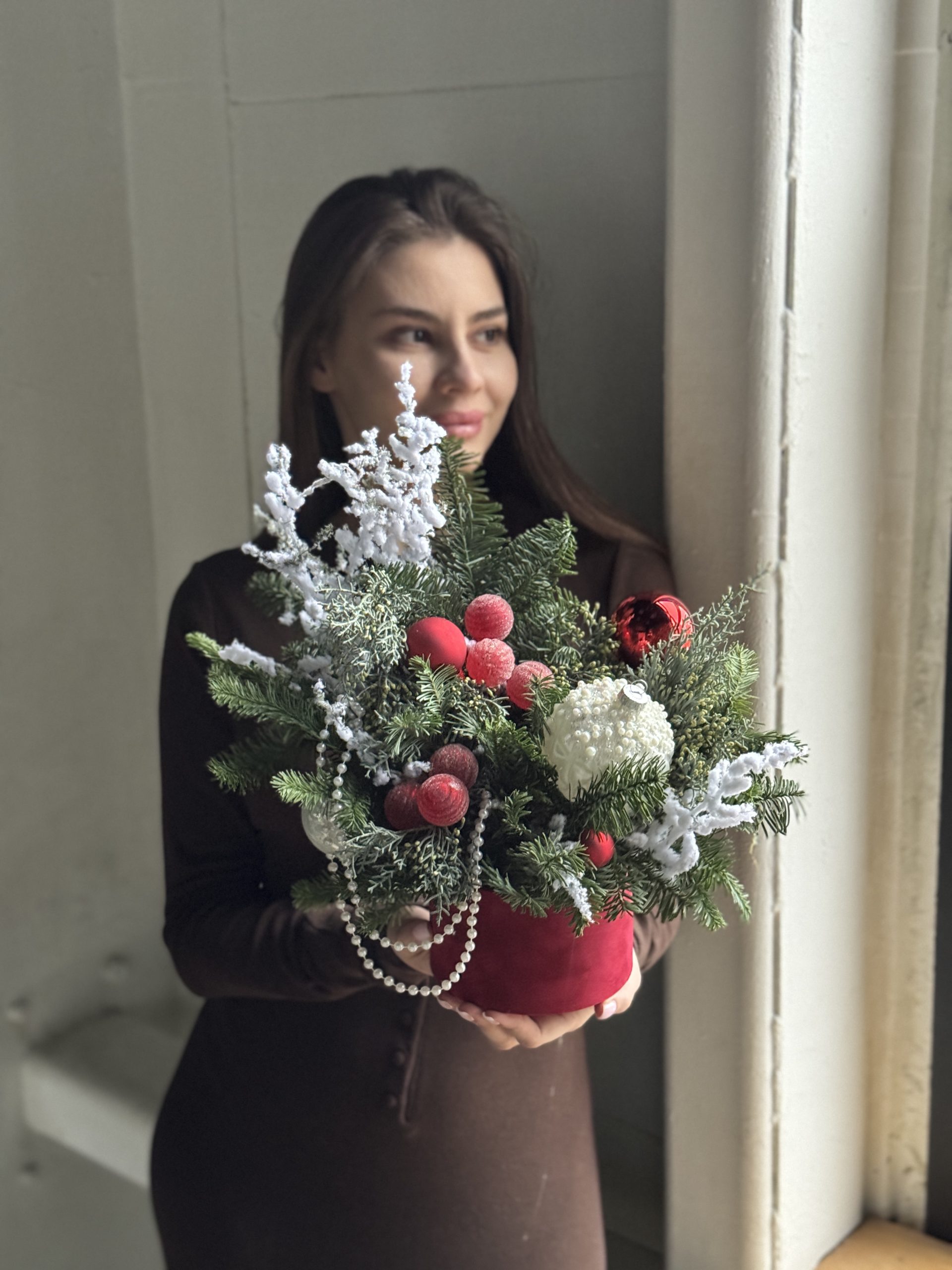 Композиция подготовлена из датской пихты Нобилис, веточек туи, можжевельника на флористической губке в бархатной коробке.