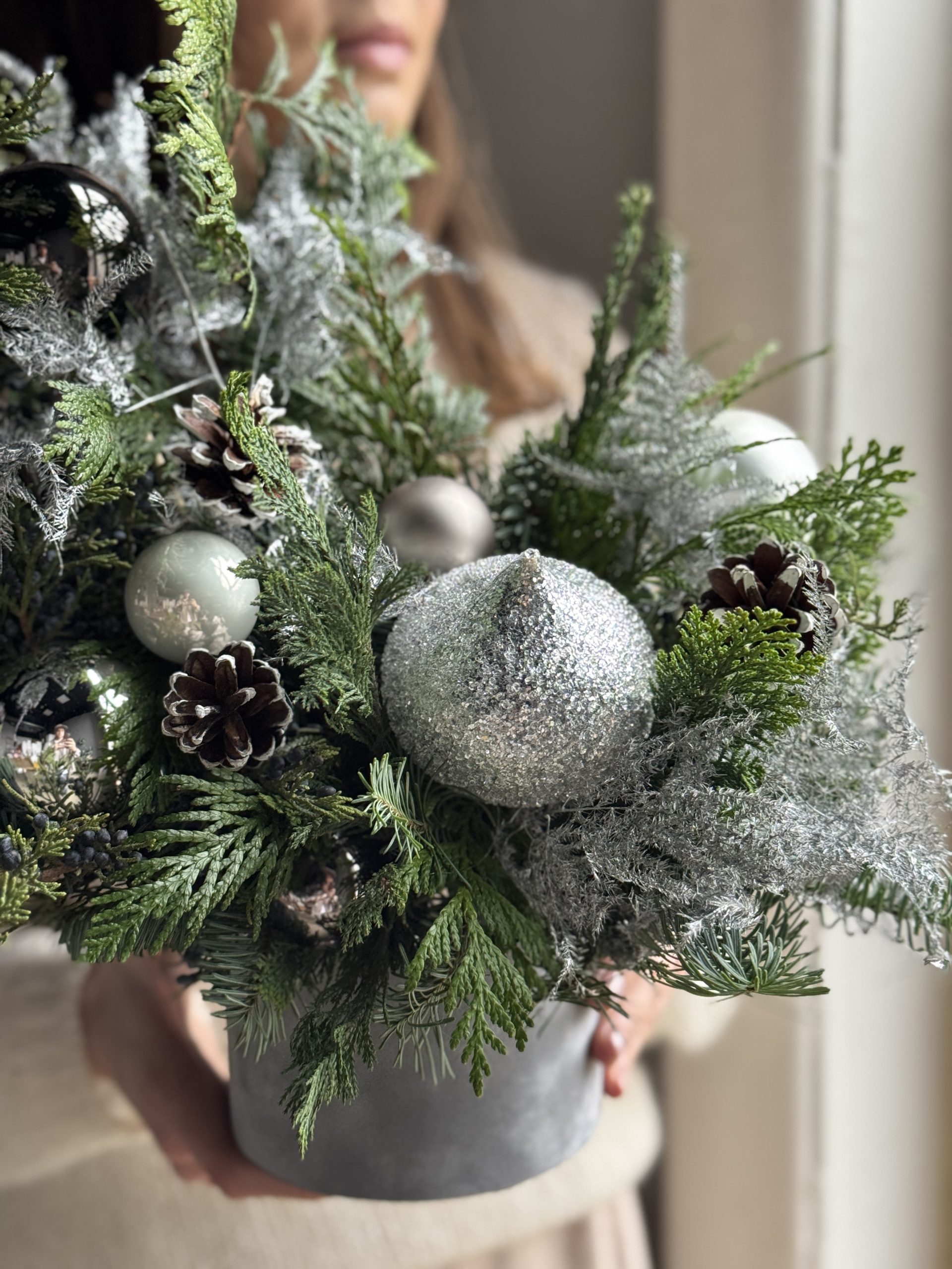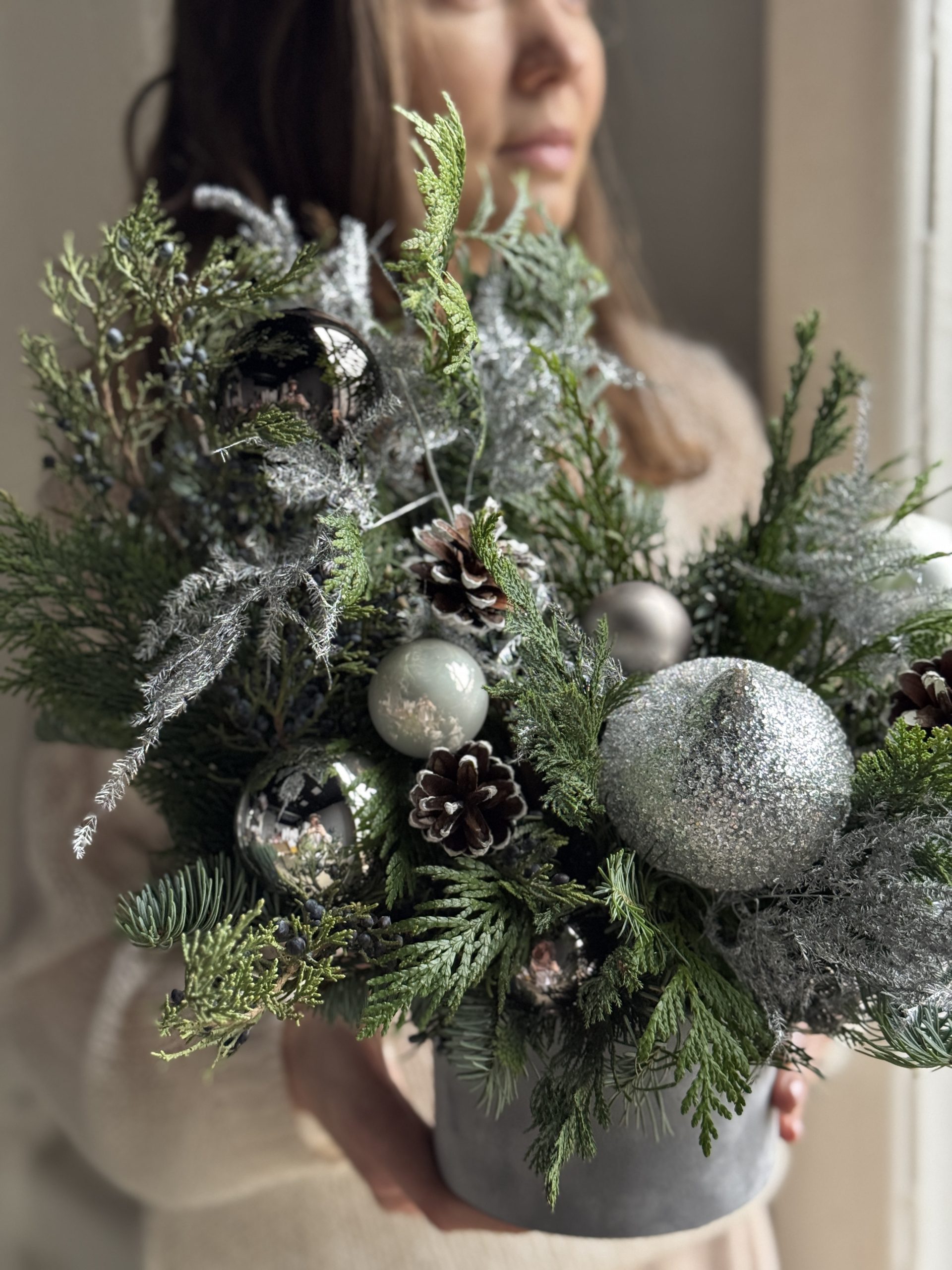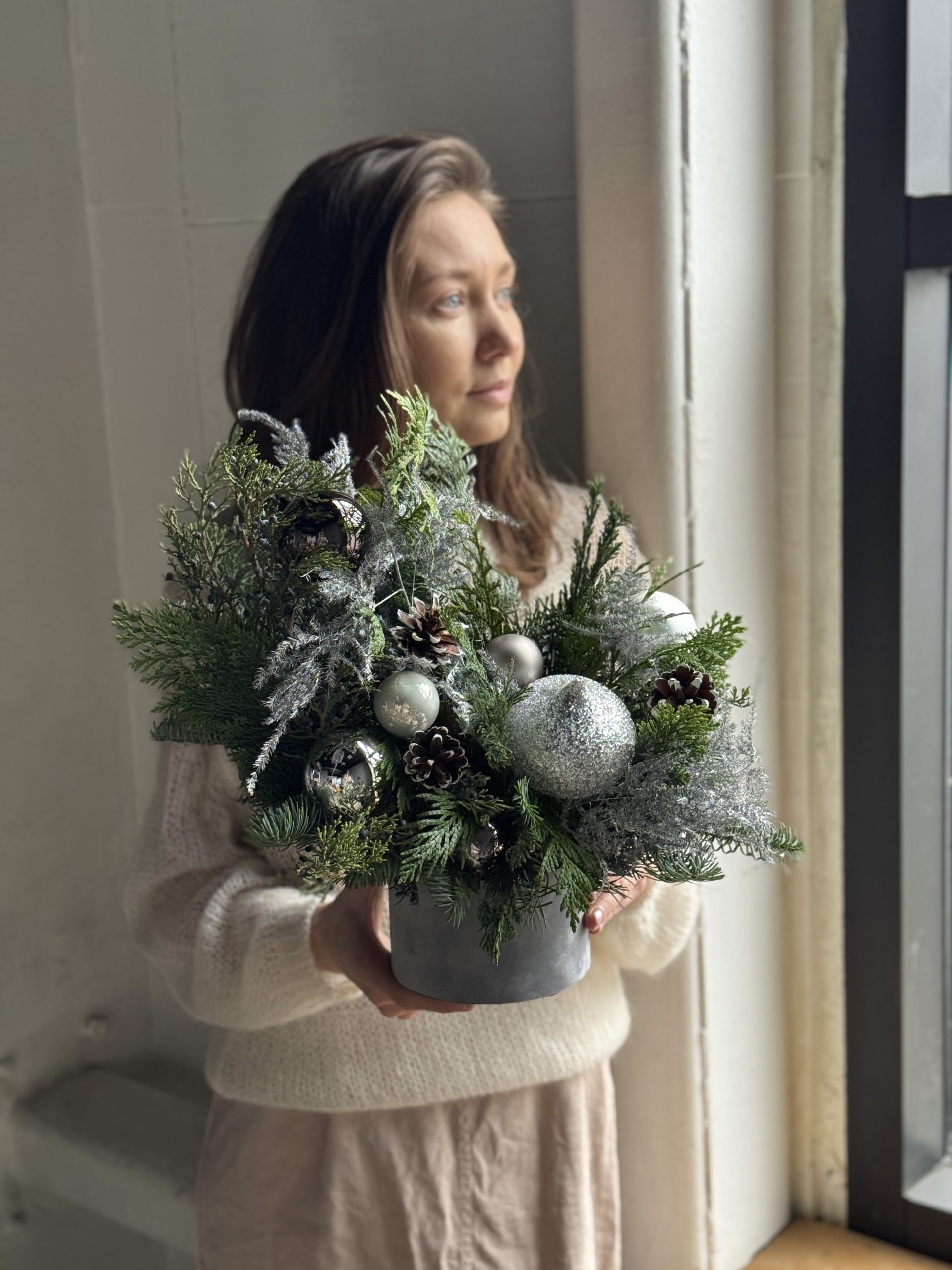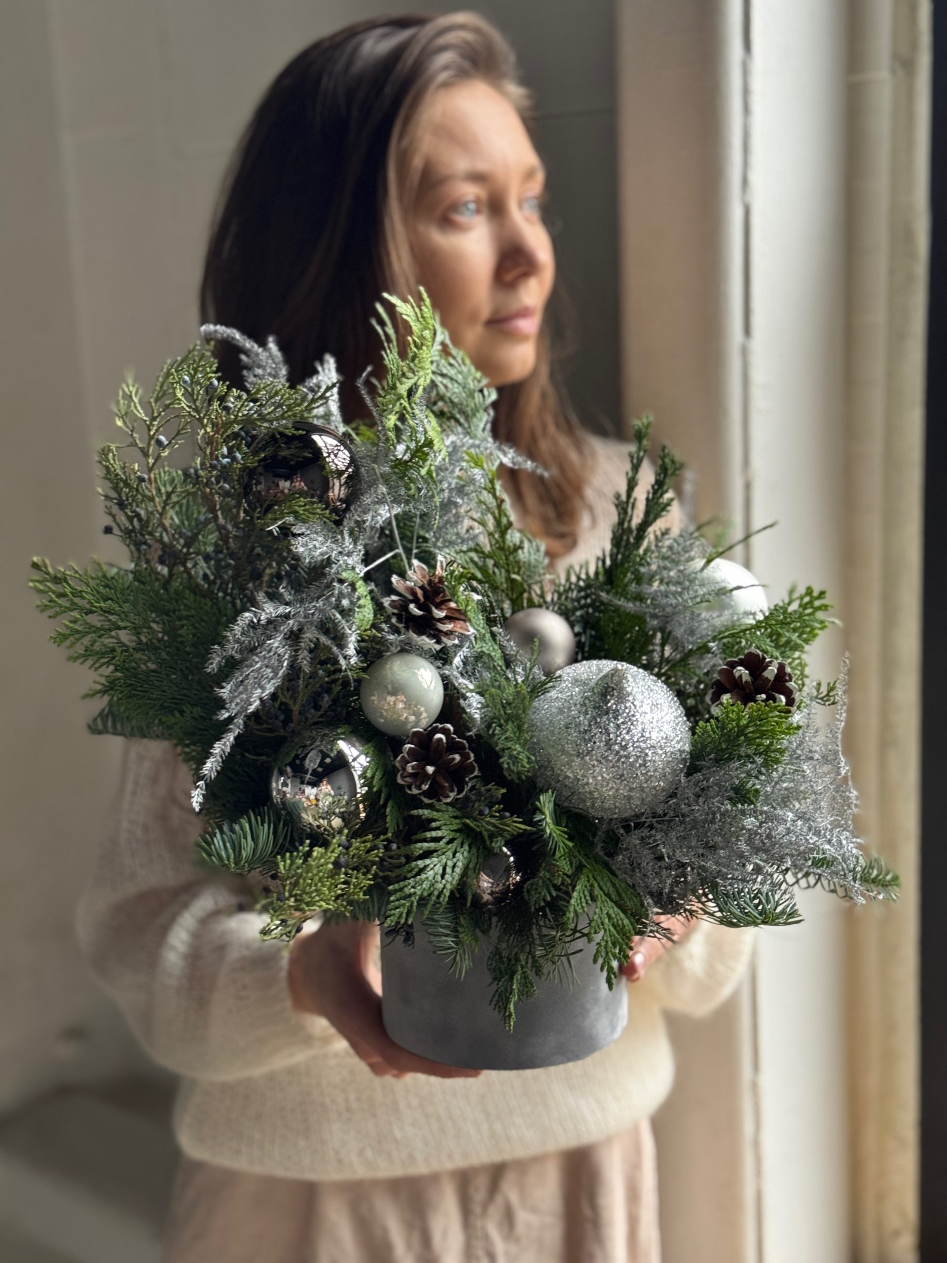 Для поддержания свежего вида хвои подливайте воду в центр композиции раз в 1-2 дня по мере высыхания губки, а также умеренно опрыскивайте пульверизатором.