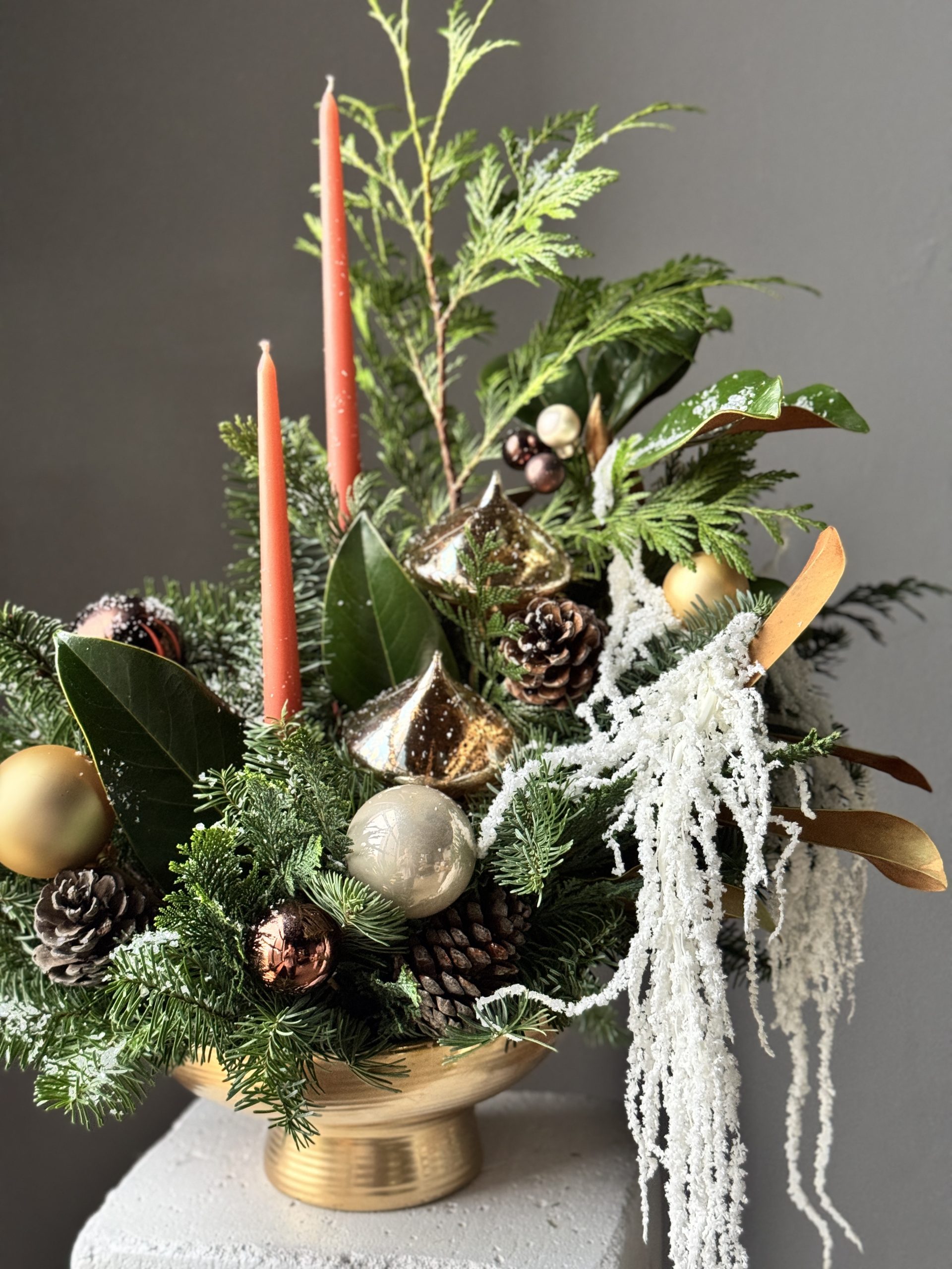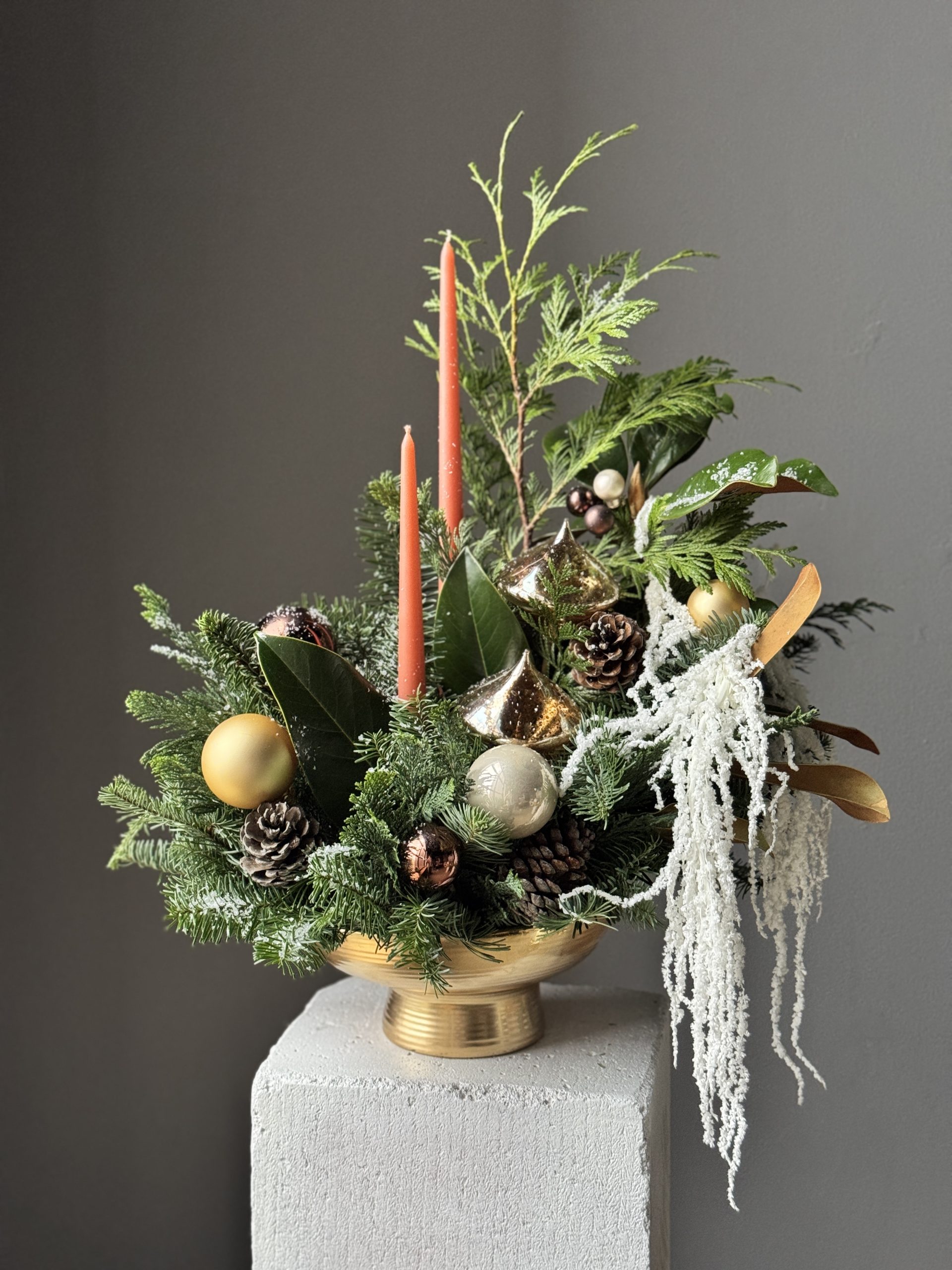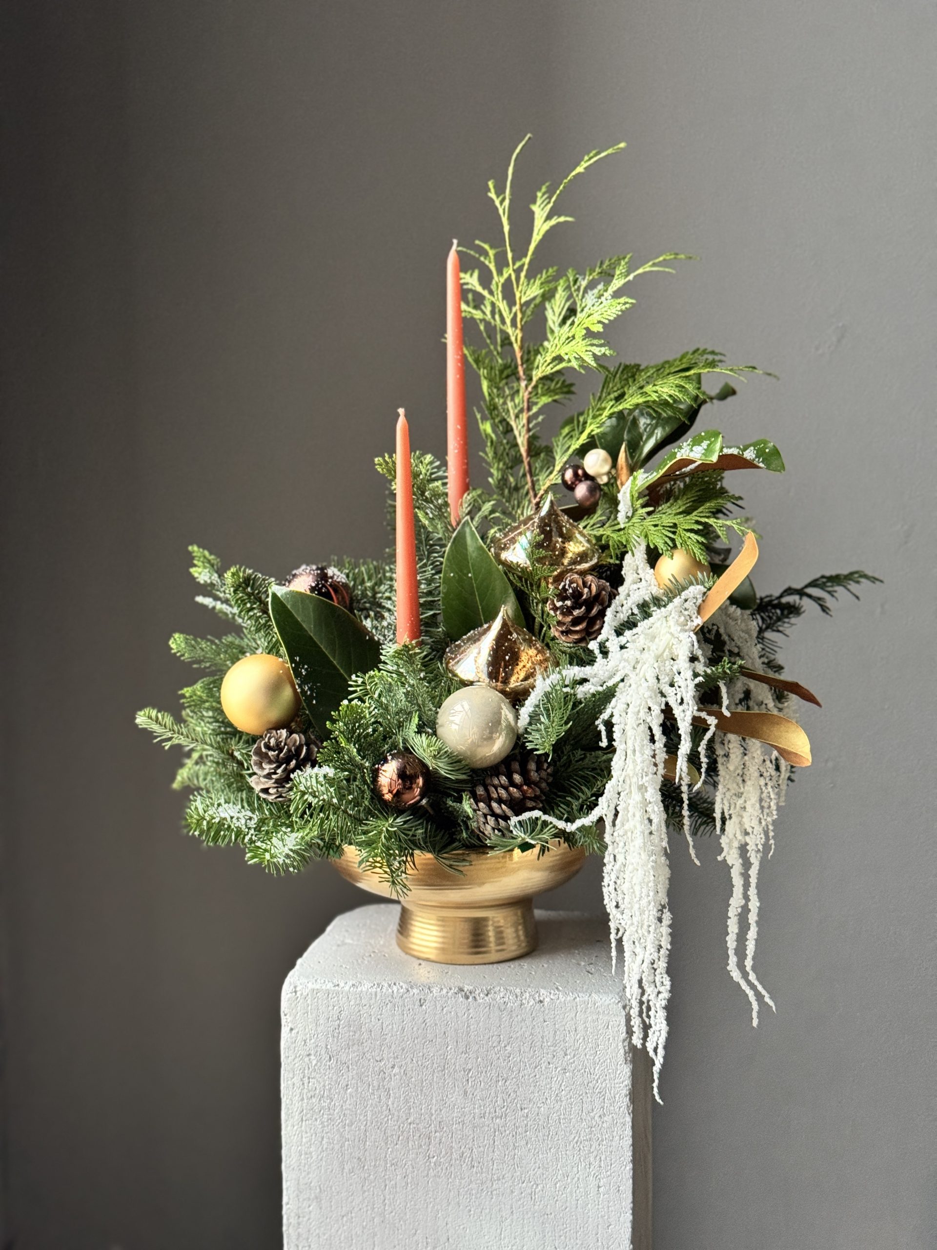 Композиция подготовлена из датской пихты Нобилис, веточек туи, можжевельника, свивающим амарантом и листьями магнолии на флористической губке в керамическом кашпо.