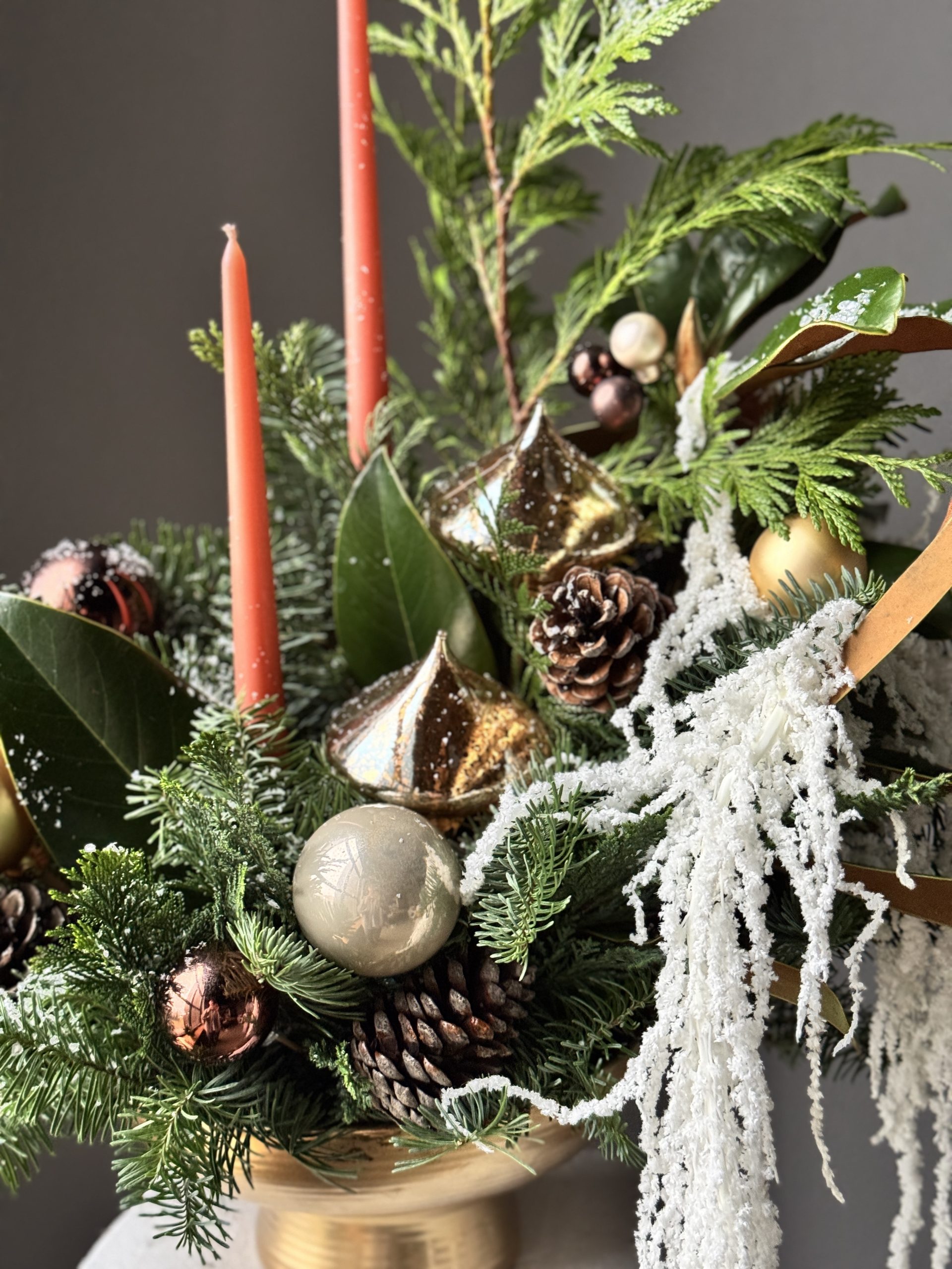 Для поддержания свежего вида хвои подливайте воду в центр композиции раз в 1-2 дня по мере высыхания губки, а также умеренно опрыскивайте пульверизатором.