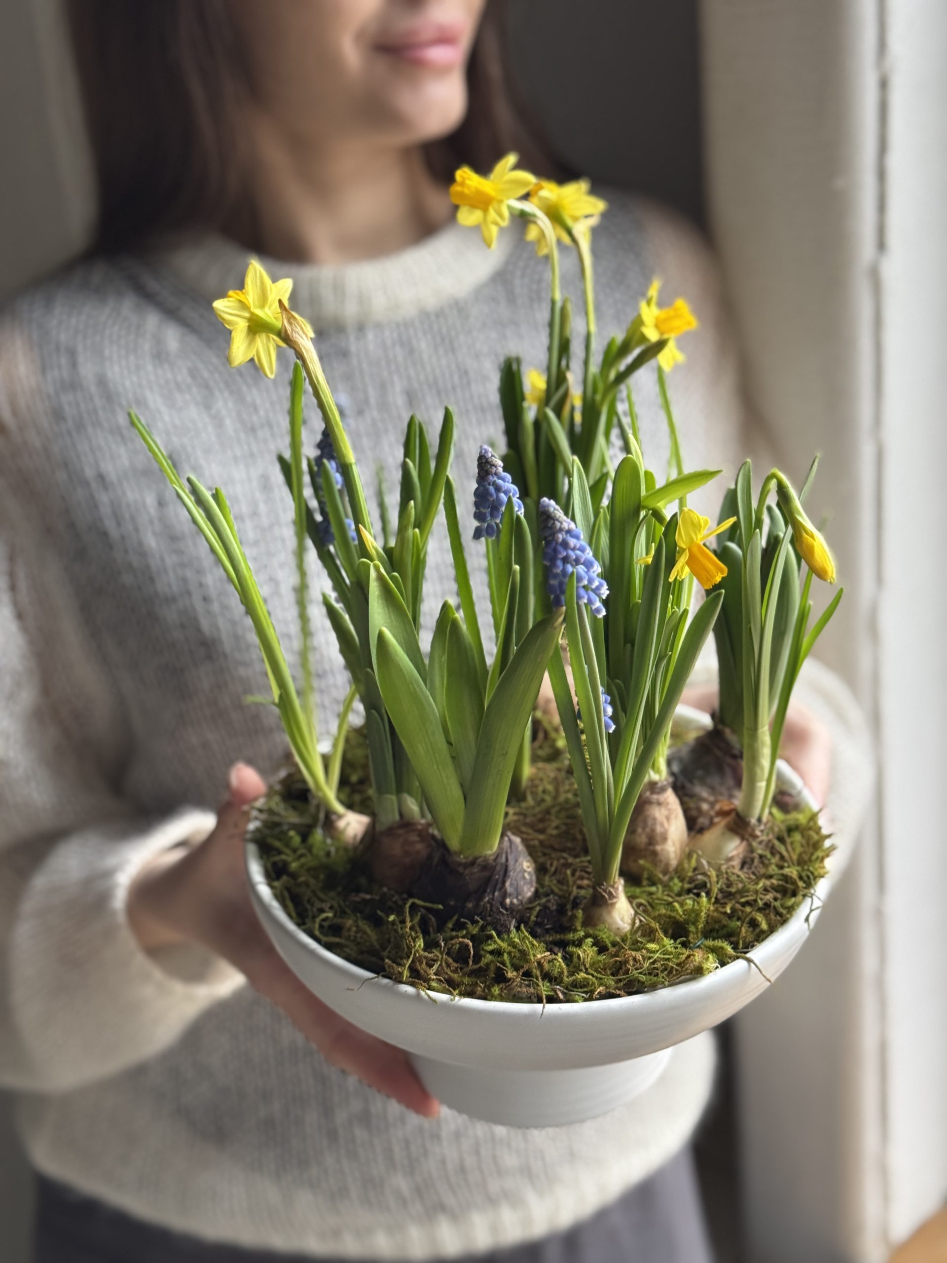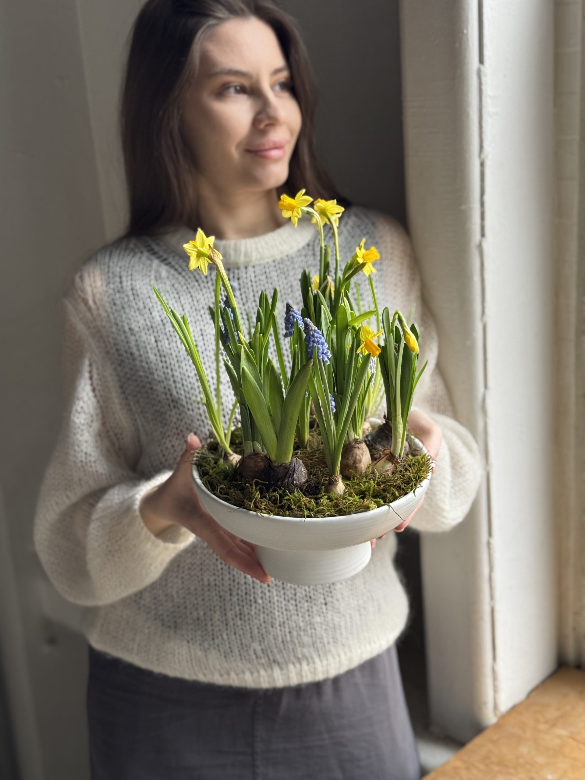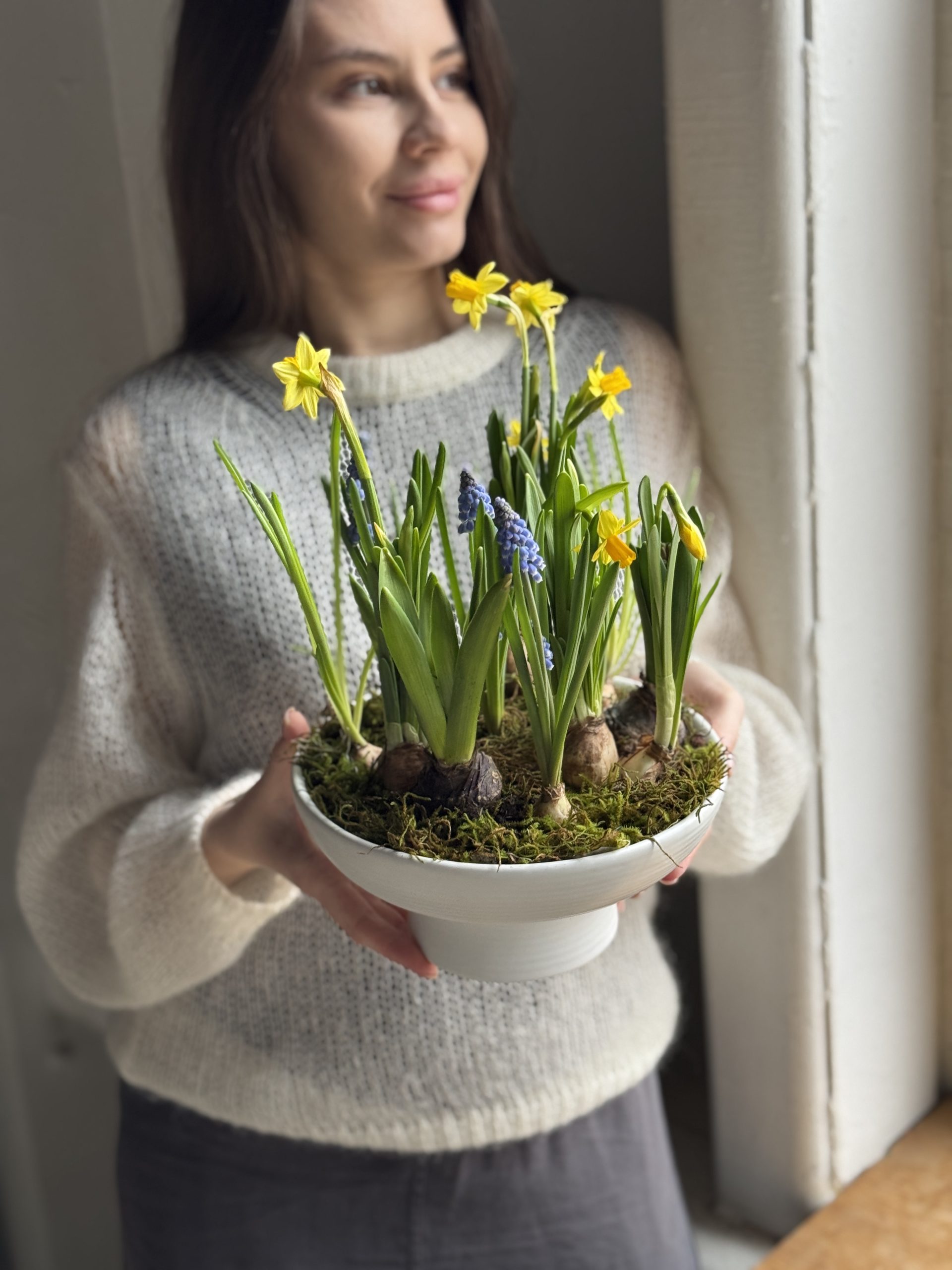 Описание: Композиция в керамическом кашпо с луковицами нарцисса, мускари и гиацинтов.