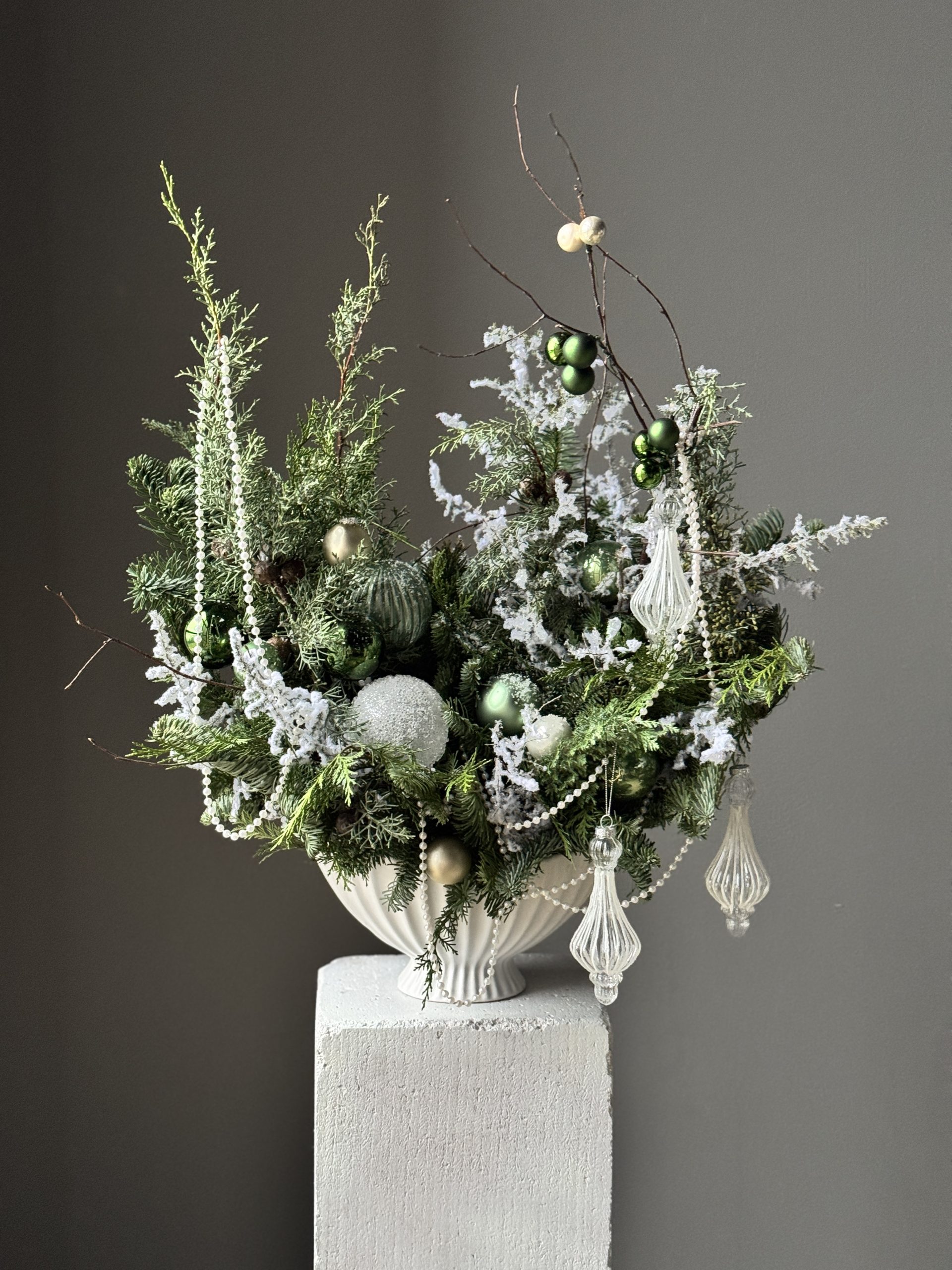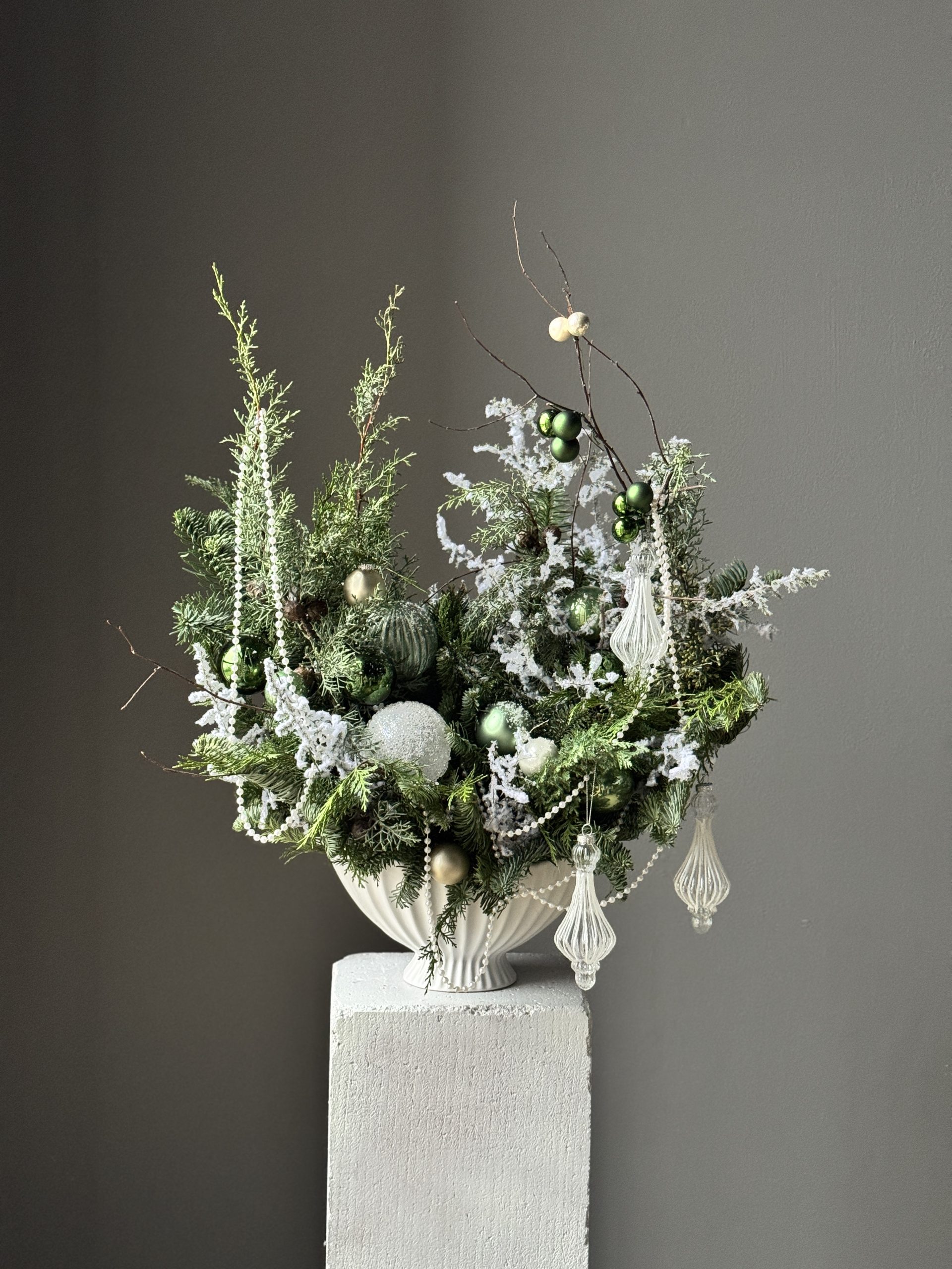 Композиция подготовлена из датской пихты Нобилис, веточек туи, кипариса, можжевельника, заснеженным аспарагусом на флористической губке в керамическом кашпо.