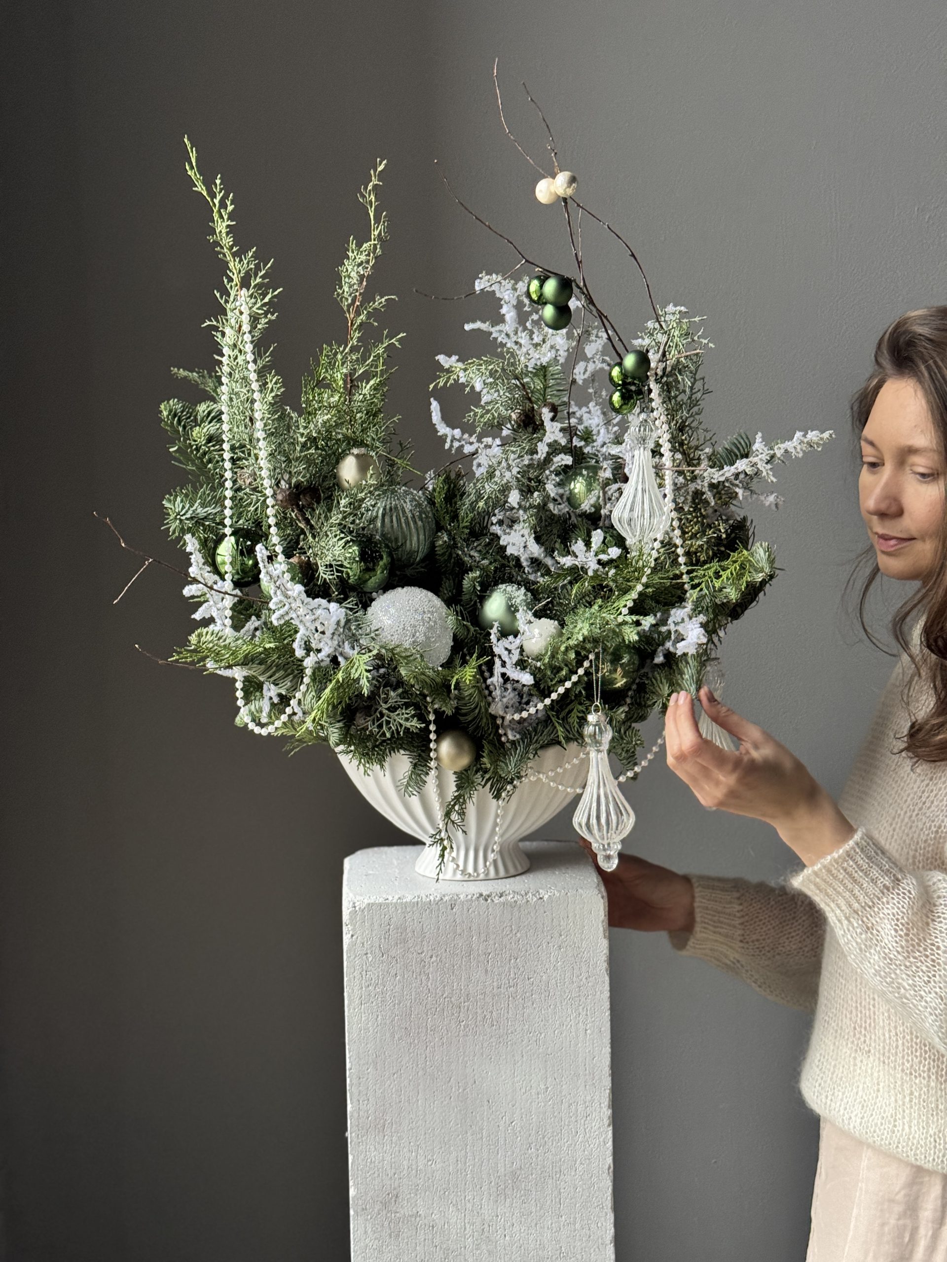 Для поддержания свежего вида хвои подливайте воду в центр композиции раз в 1-2 дня по мере высыхания губки, а также умеренно опрыскивайте пульверизатором.
