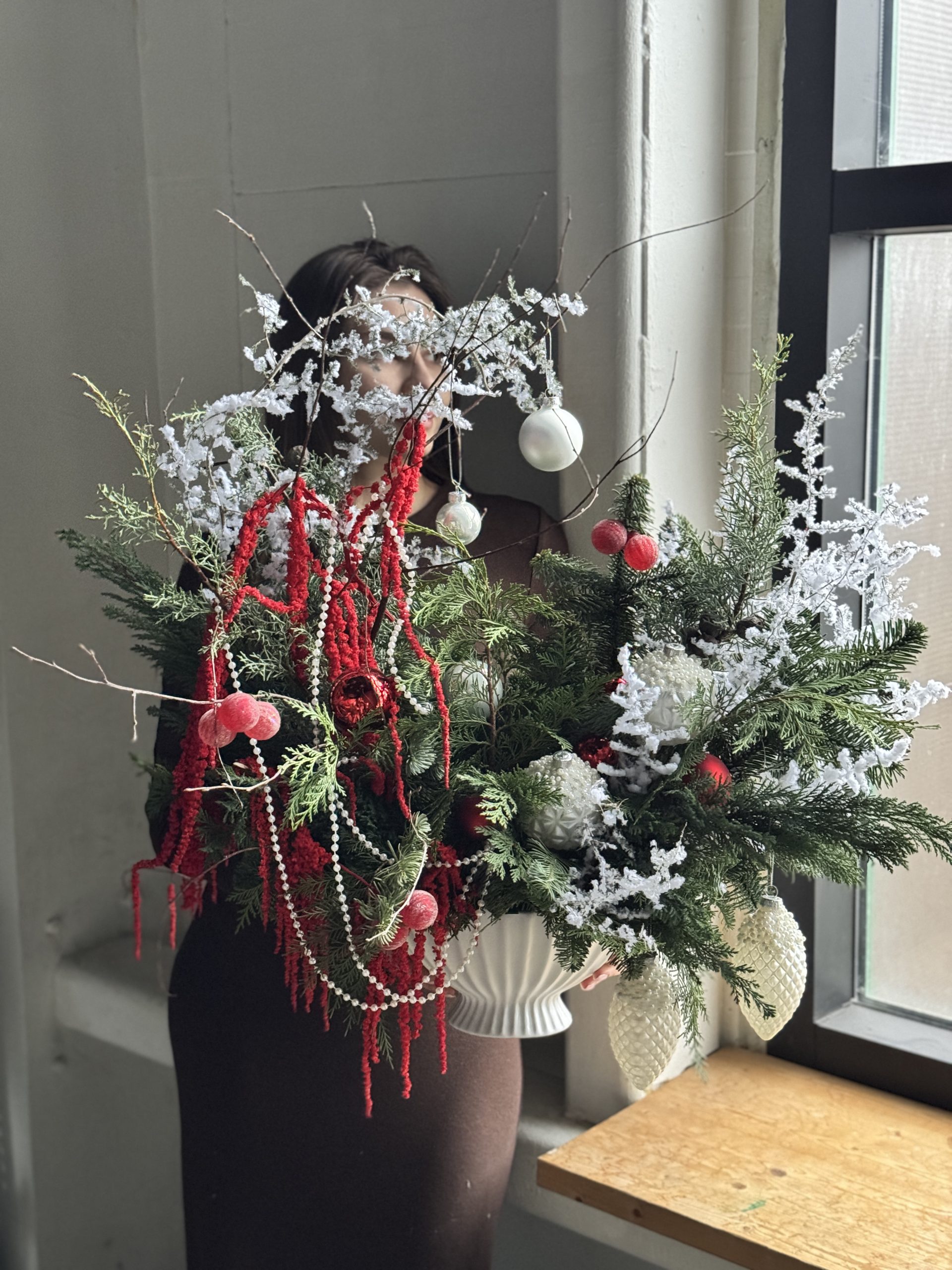 Для поддержания свежего вида хвои подливайте воду в центр композиции раз в 1-2 дня по мере высыхания губки, а также умеренно опрыскивайте пульверизатором.