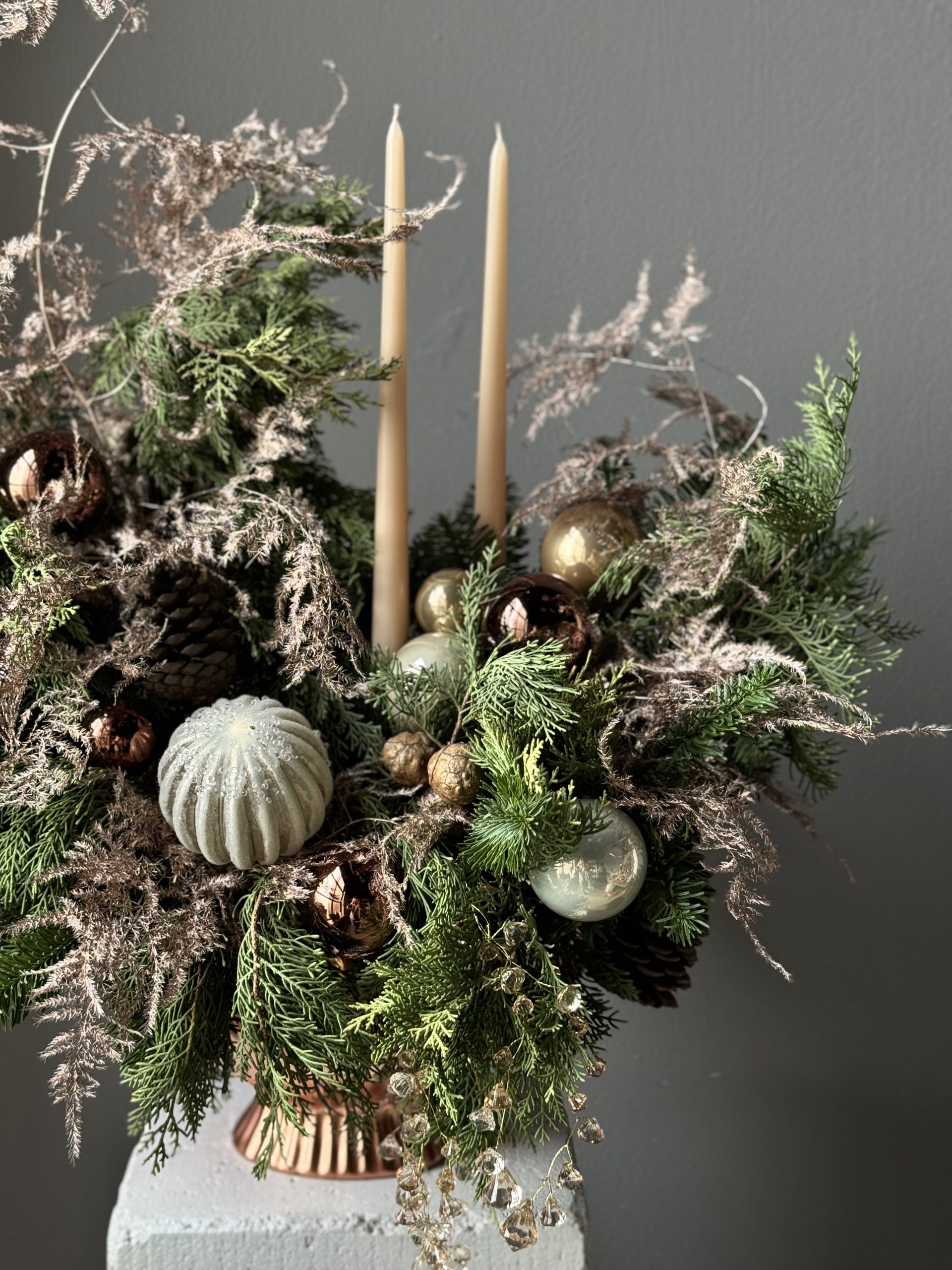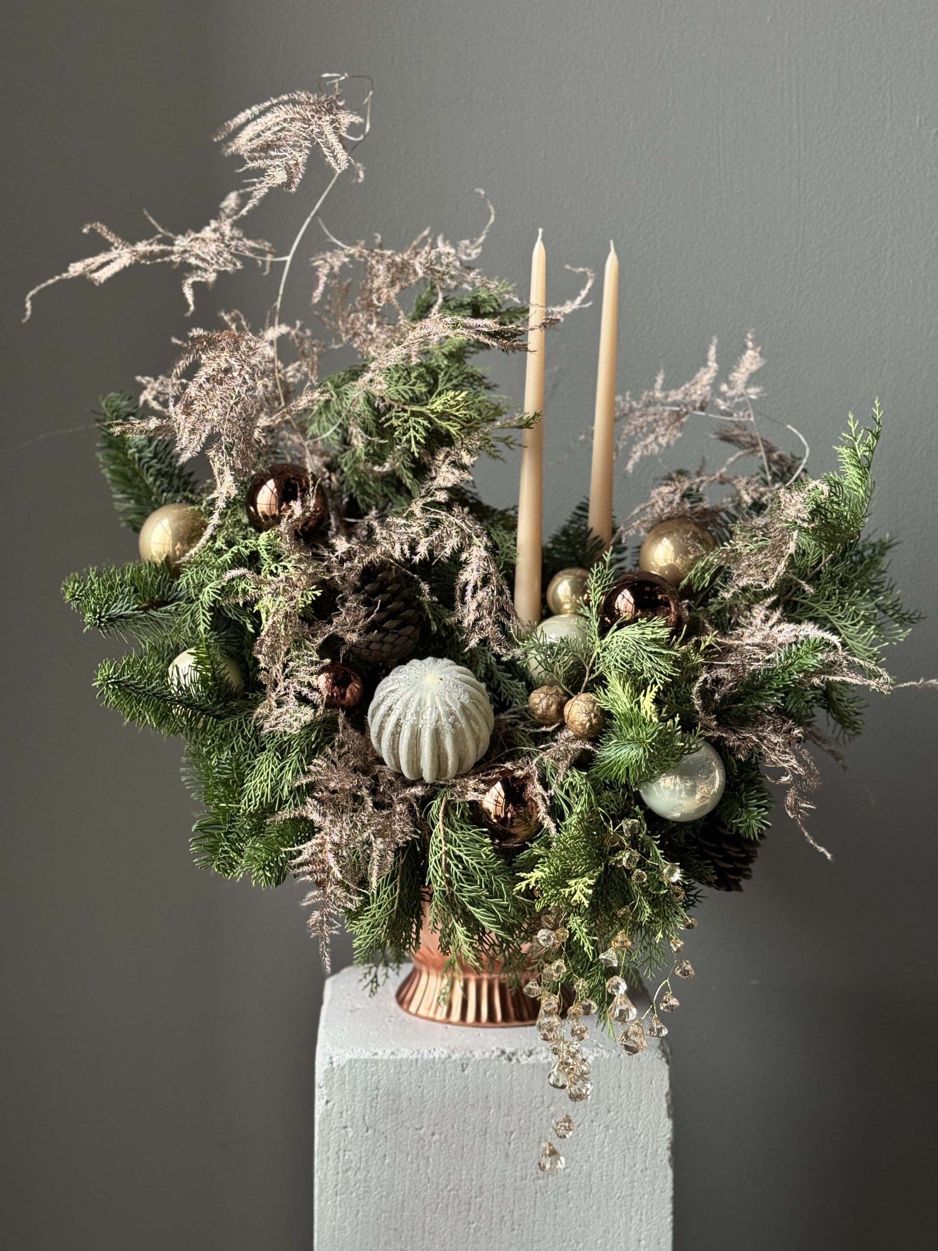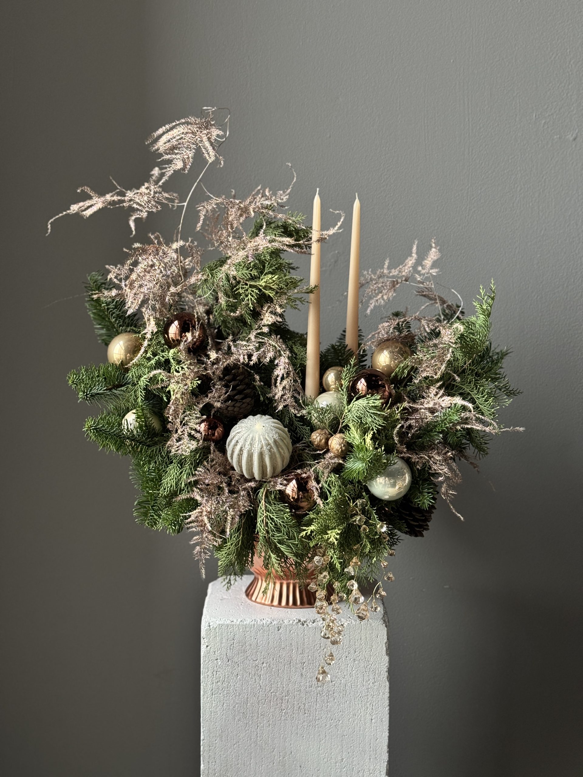 В составе конусные свечи, стеклянные шары и природные декоративные материалы.