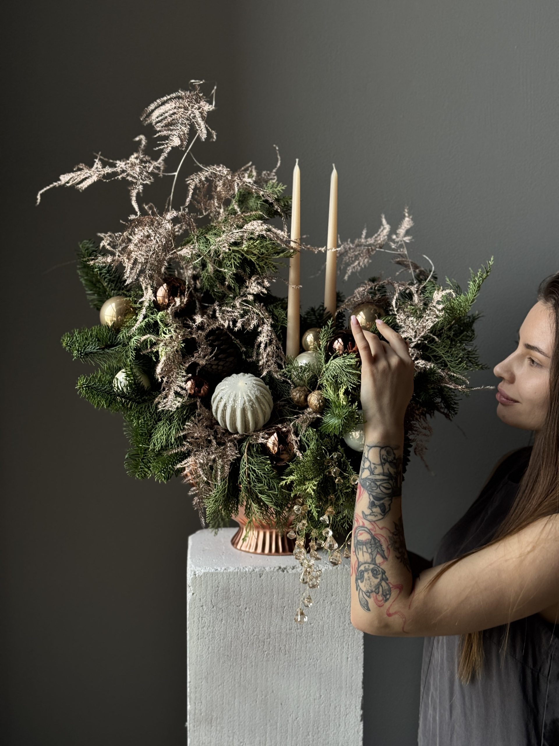 Для поддержания свежего вида хвои подливайте воду в центр композиции раз в 1-2 дня по мере высыхания губки, а также умеренно опрыскивайте пульверизатором.