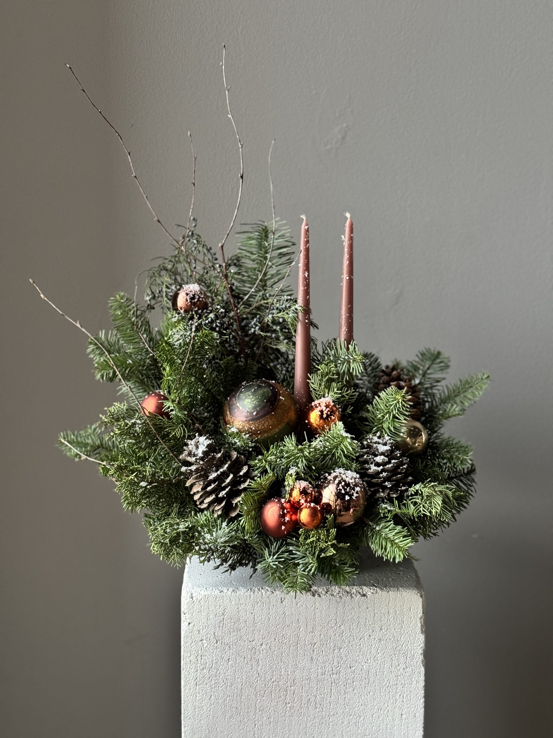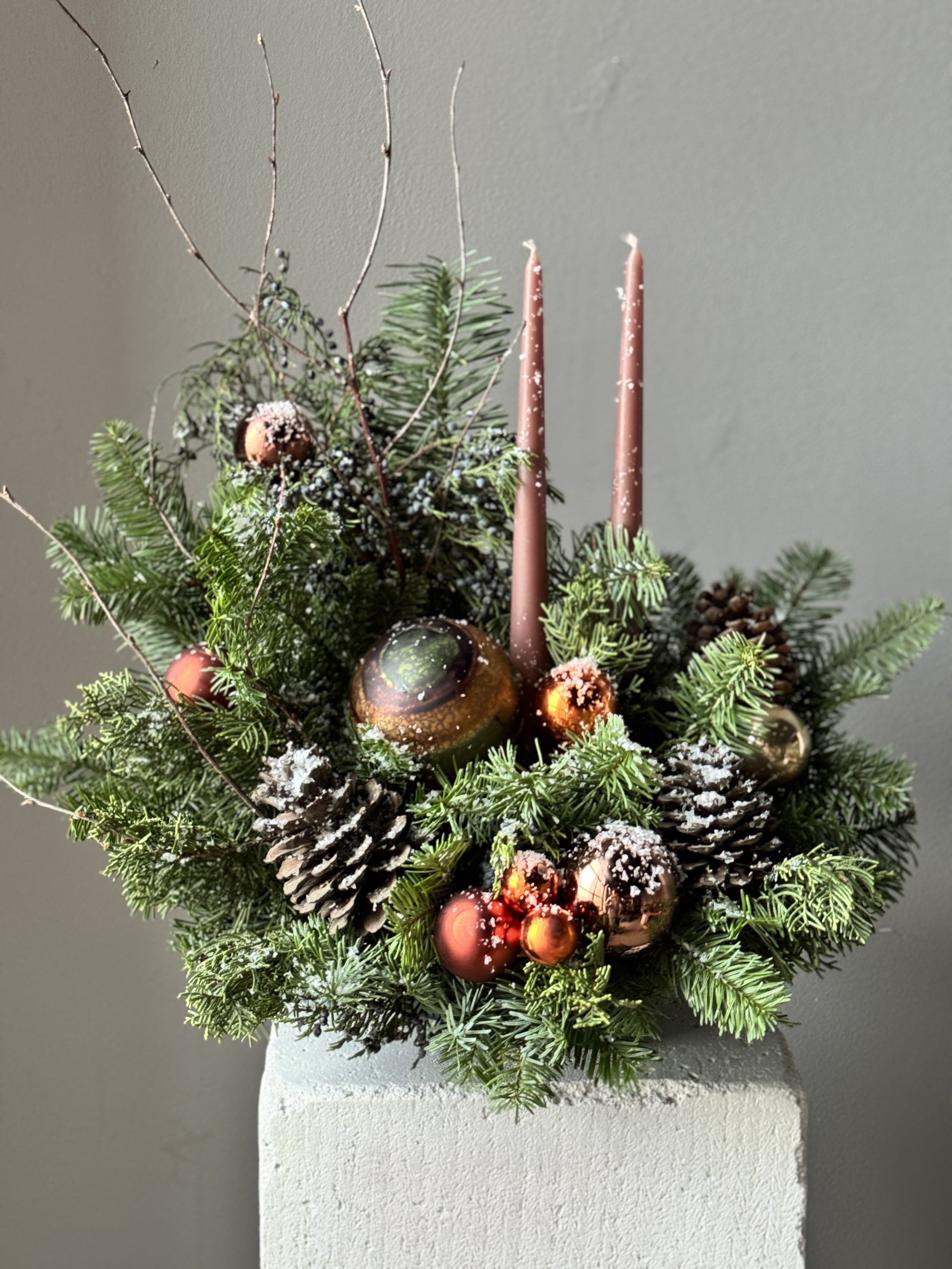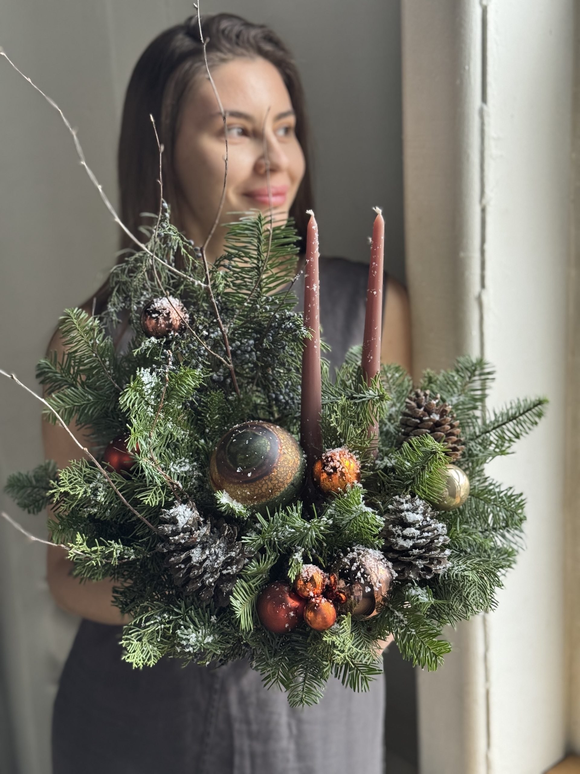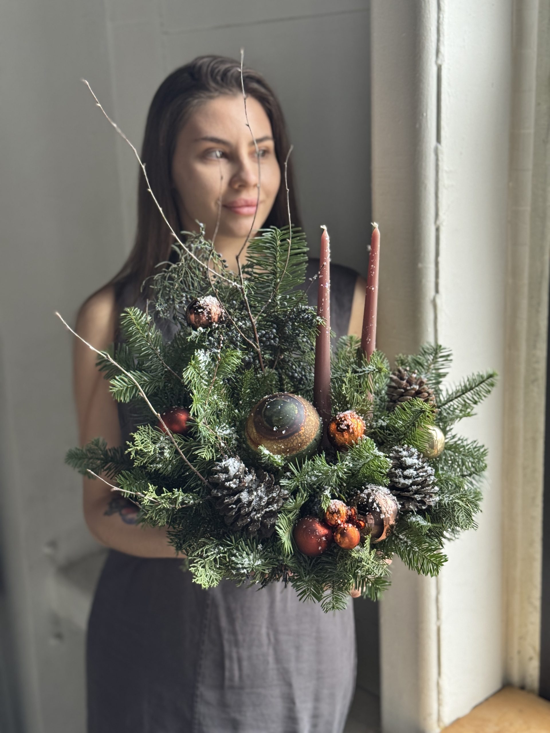 В составе конусные свечи, стеклянные шары и природные декоративные материалы.