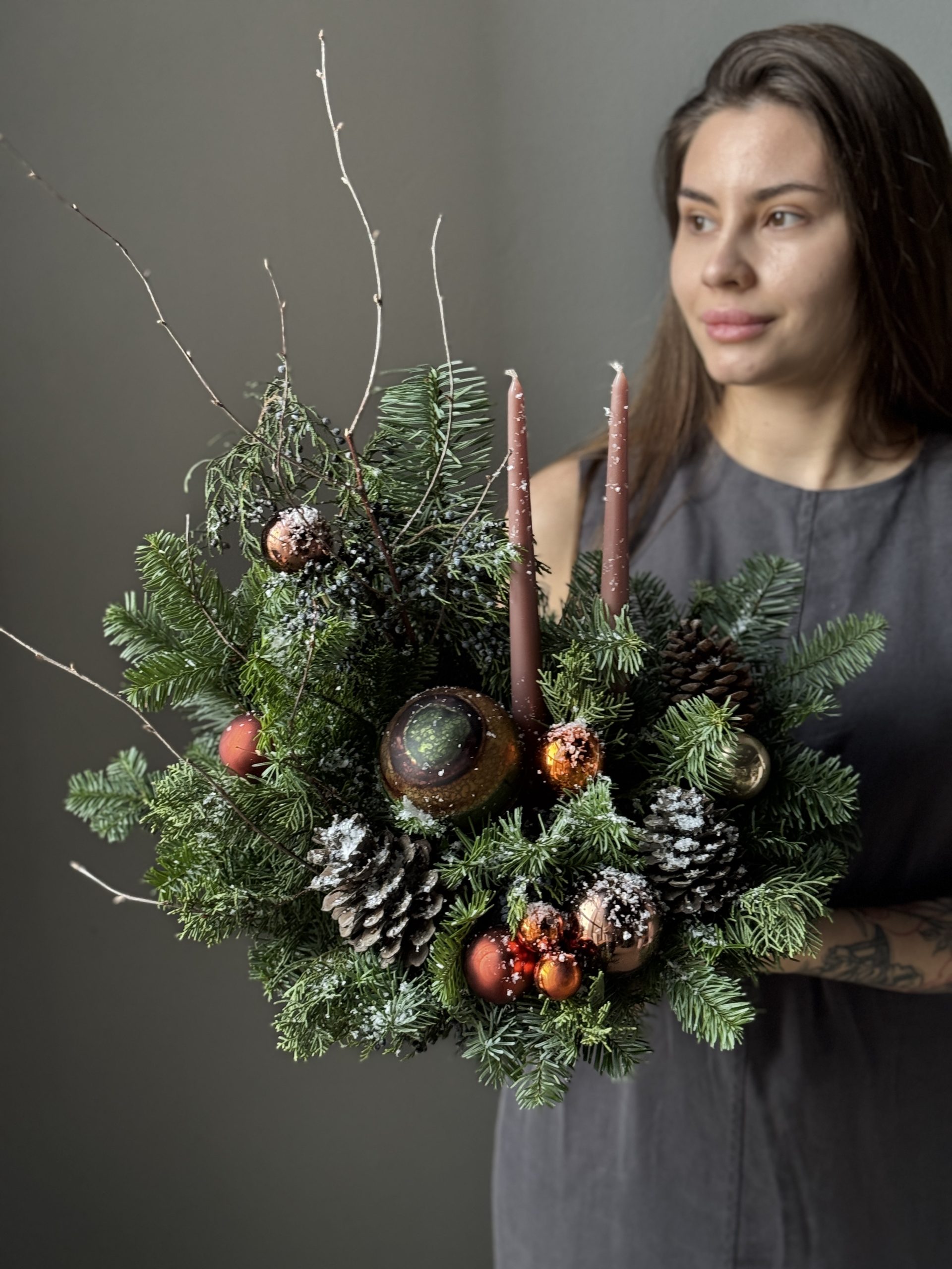 Для поддержания свежего вида хвои подливайте воду в центр композиции раз в 1-2 дня по мере высыхания губки, а также умеренно опрыскивайте пульверизатором.