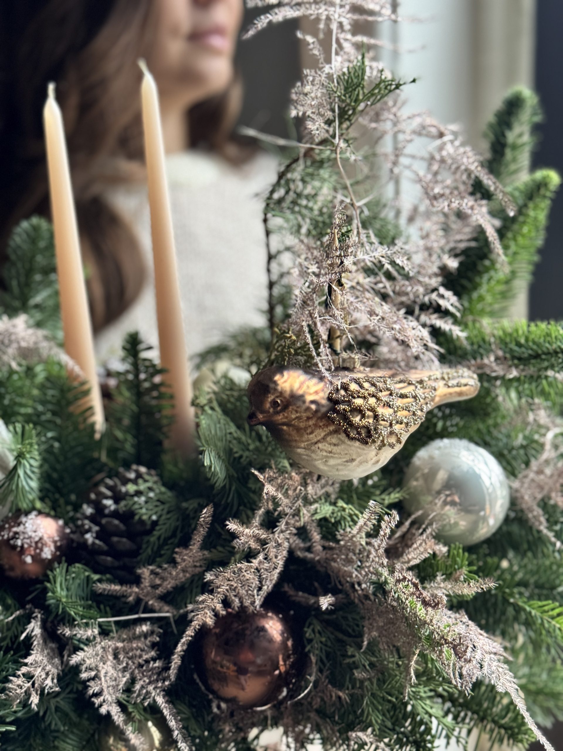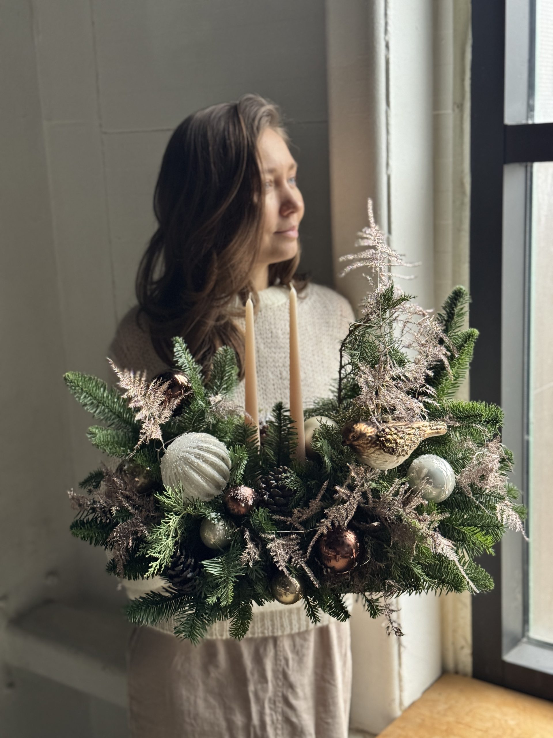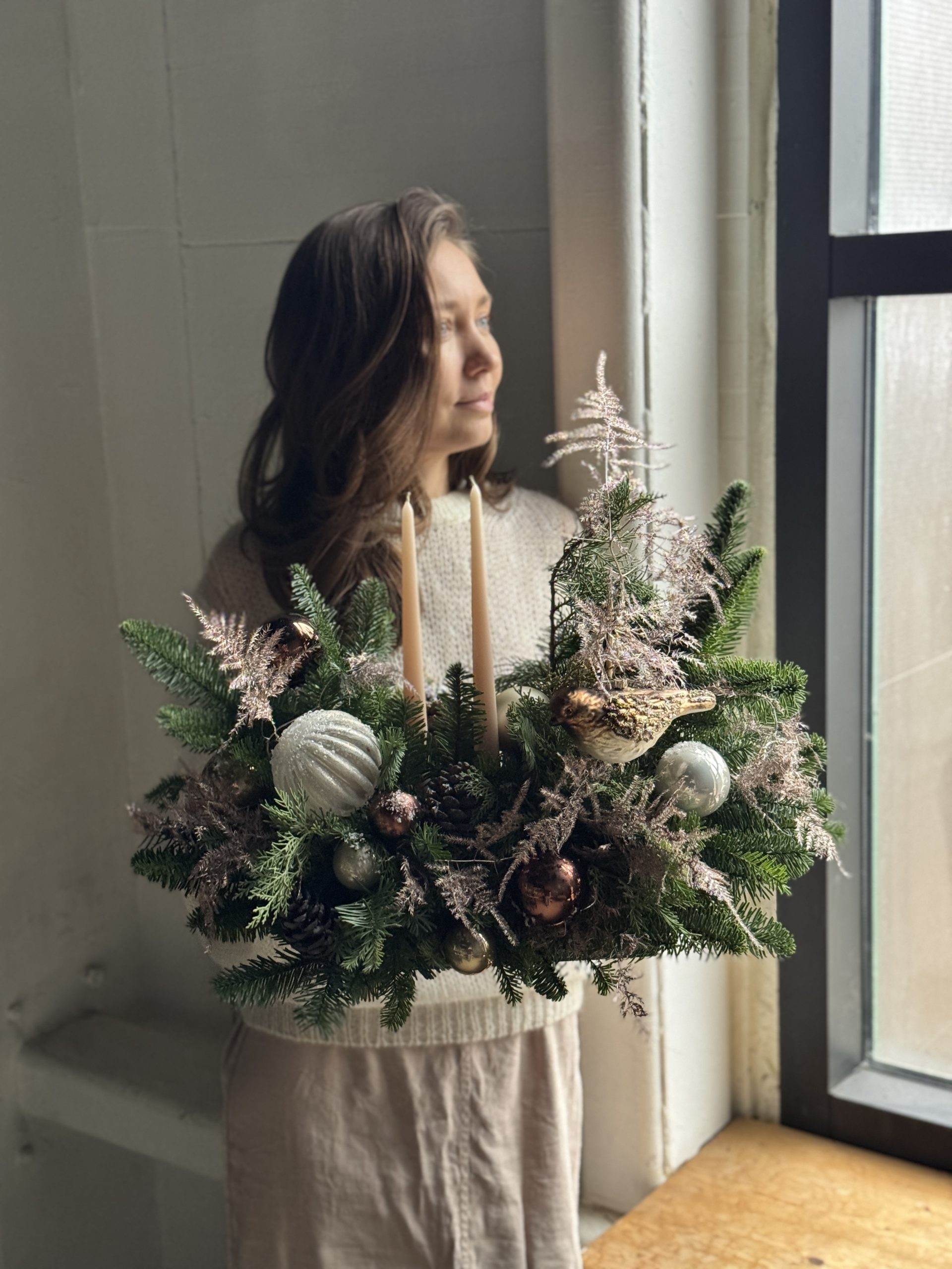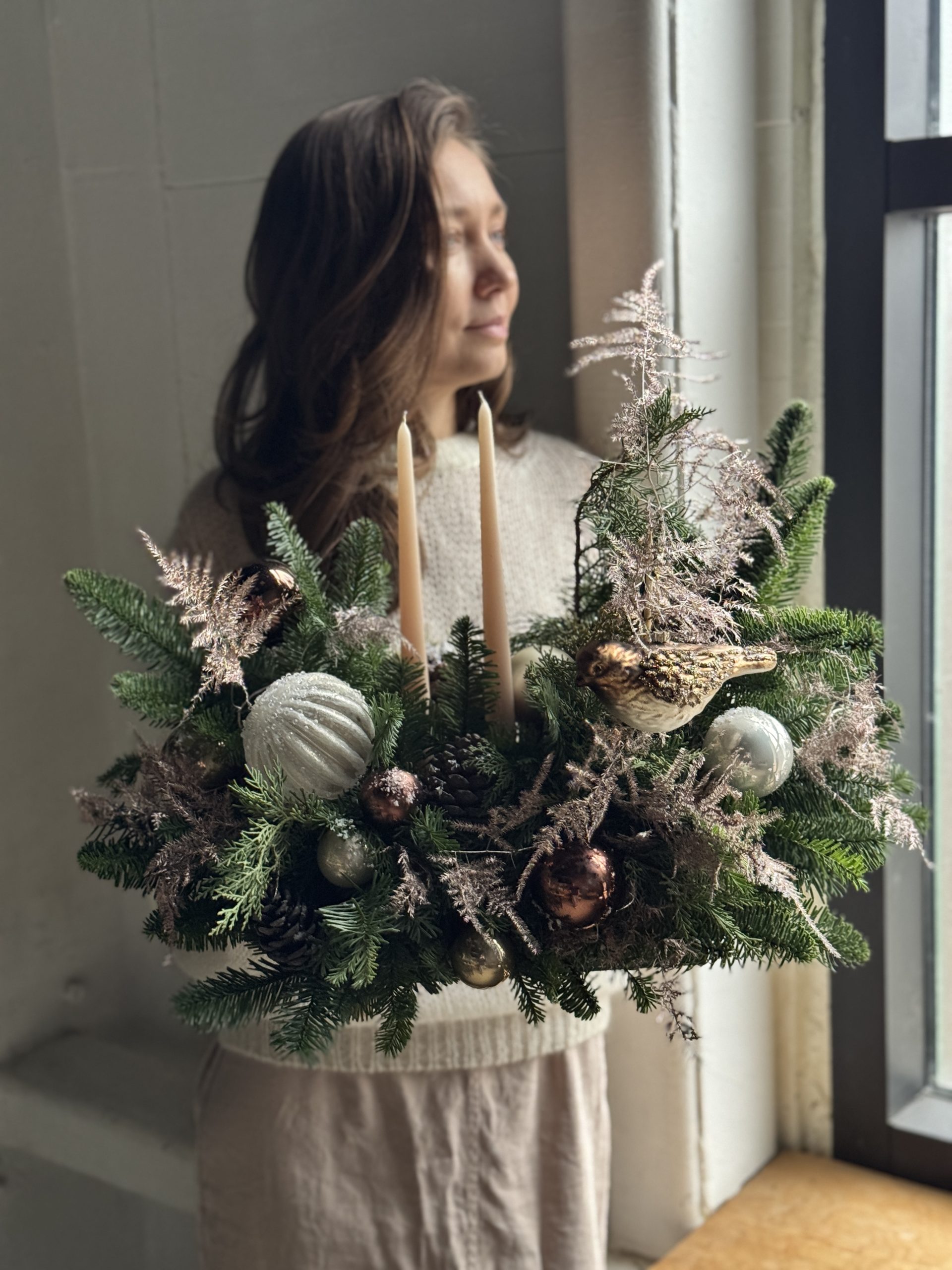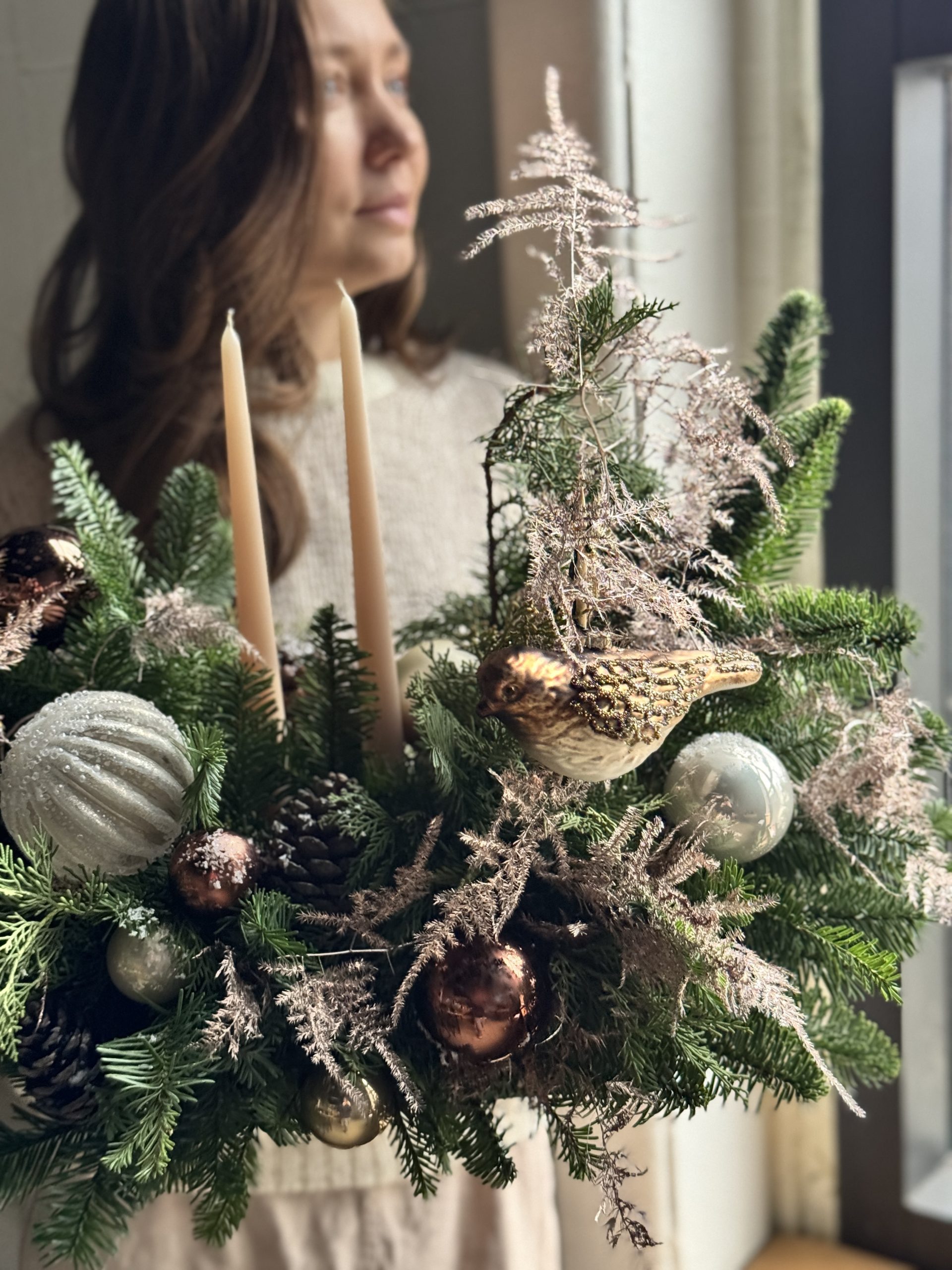 Для поддержания свежего вида хвои подливайте воду в центр композиции раз в 1-2 дня по мере высыхания губки, а также умеренно опрыскивайте пульверизатором.