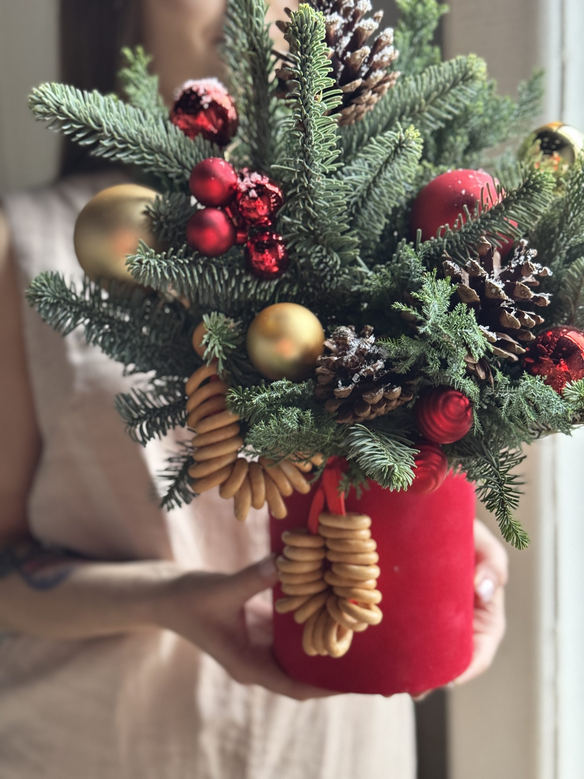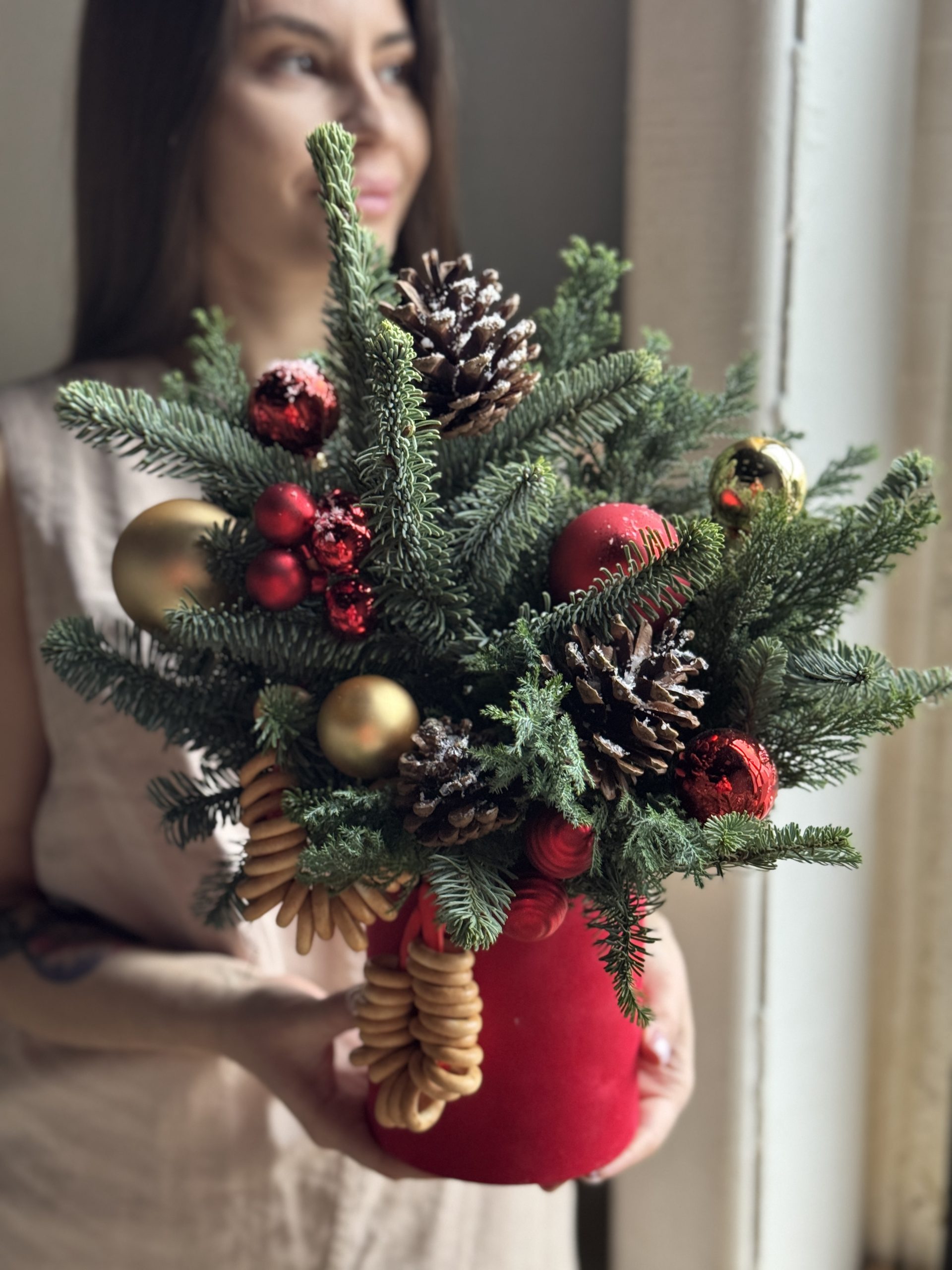 Для поддержания свежего вида хвои подливайте воду в центр композиции раз в 1-2 дня по мере высыхания губки, а также умеренно опрыскивайте пульверизатором.