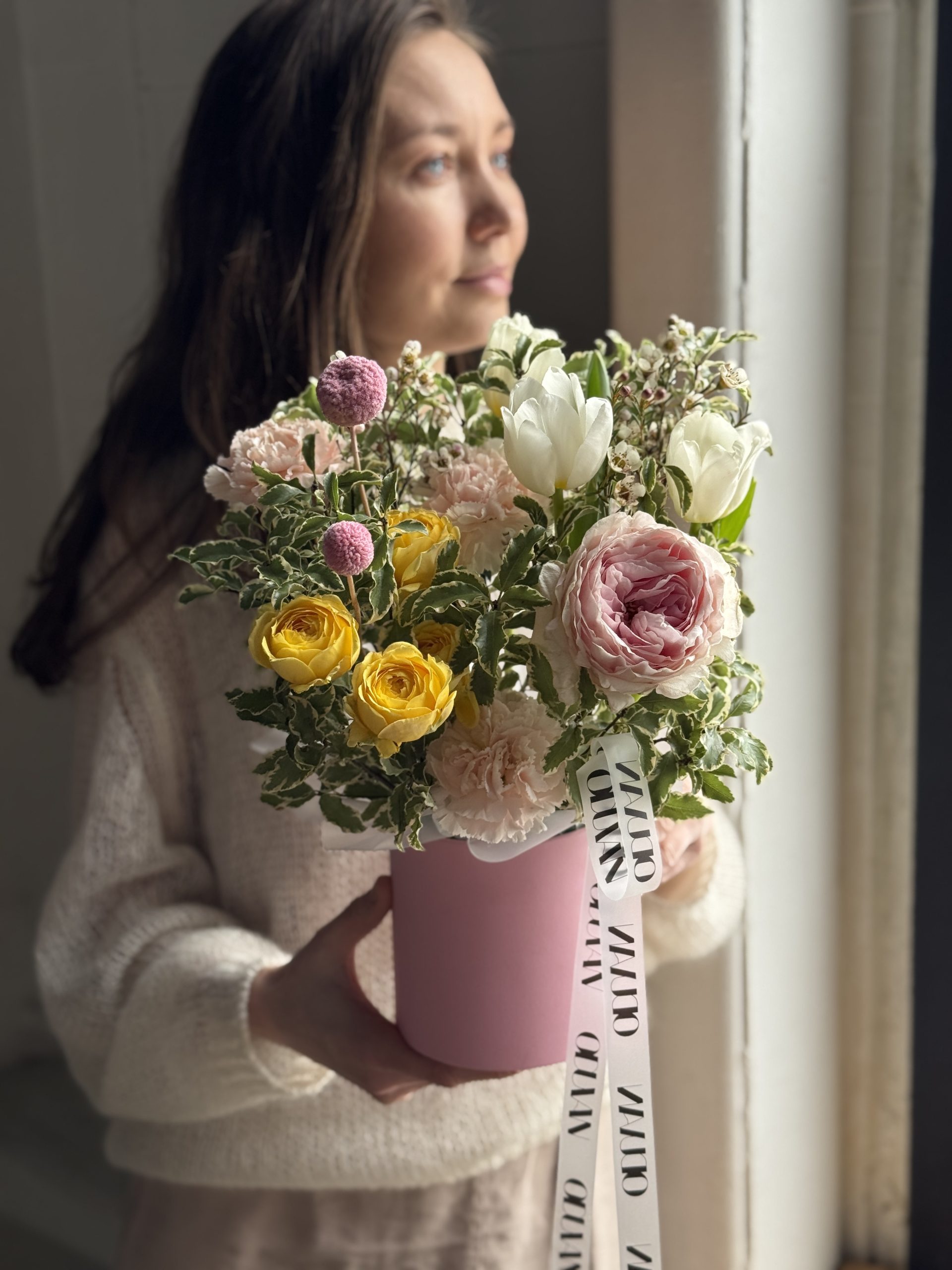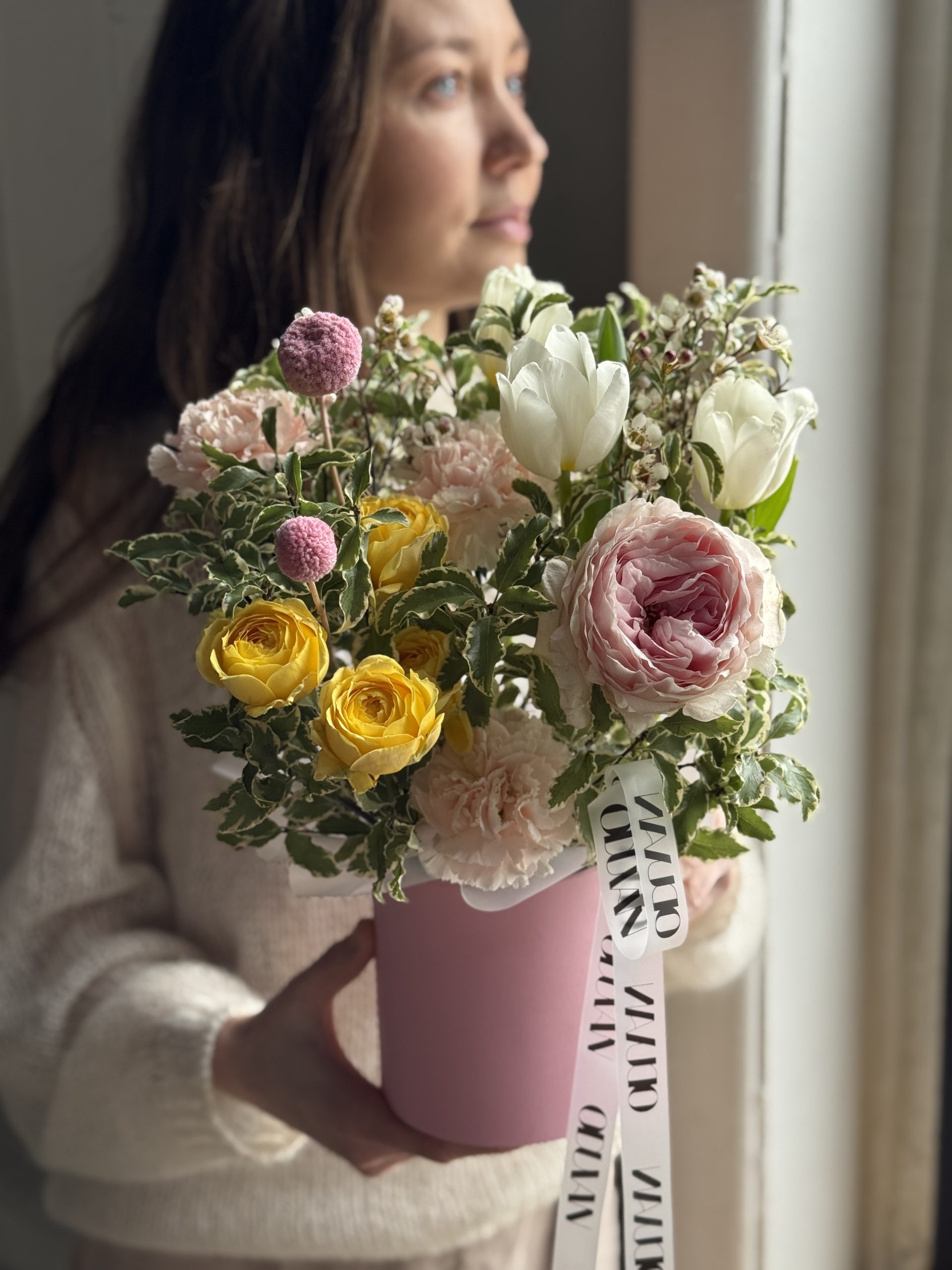Описание: Композиция в коробке с садовой розой, кустовой розой Луна Трендсеттер, хамелациумом, диантусами, классическими тюльпанами и листьями питтоспорума.