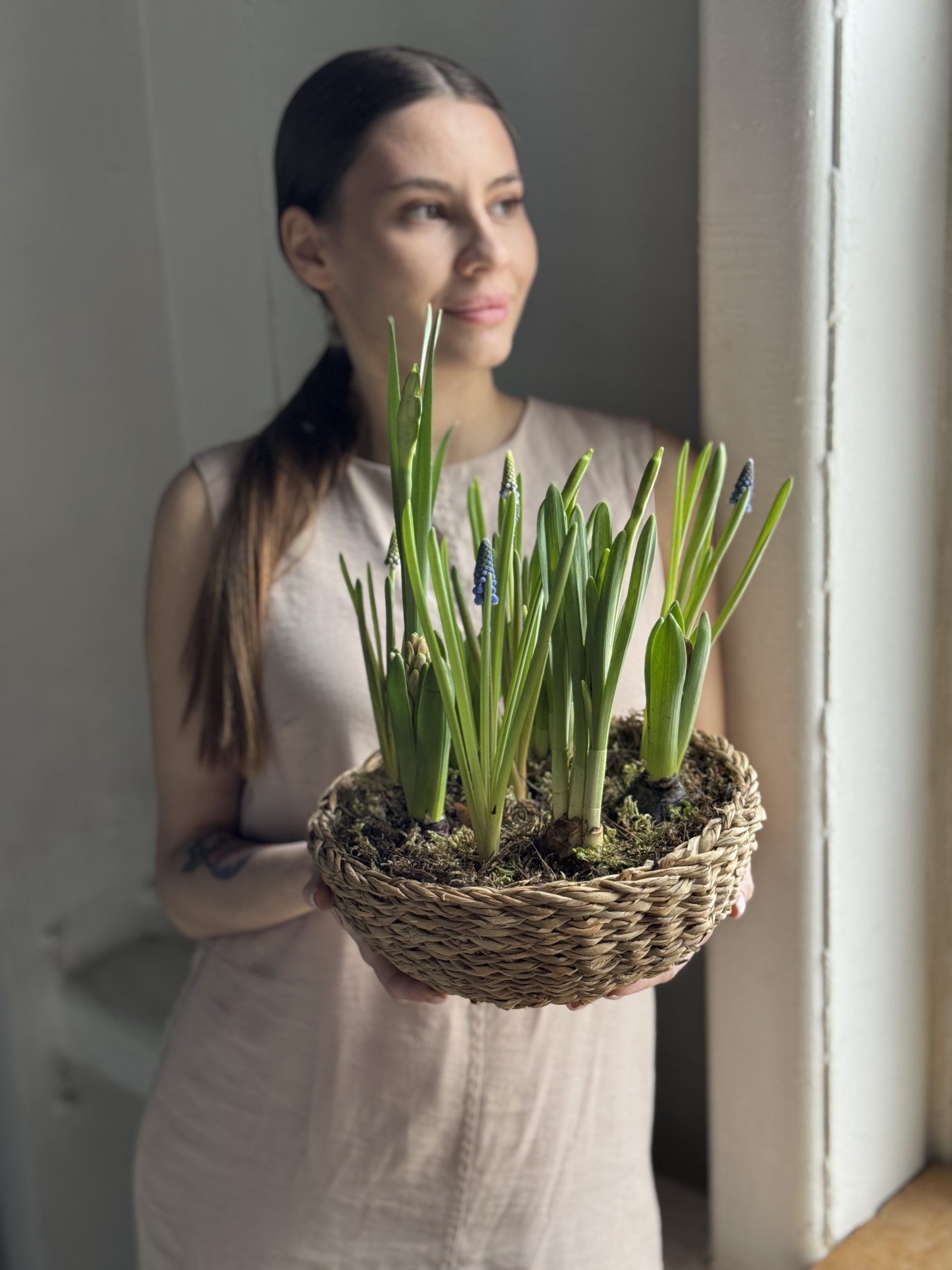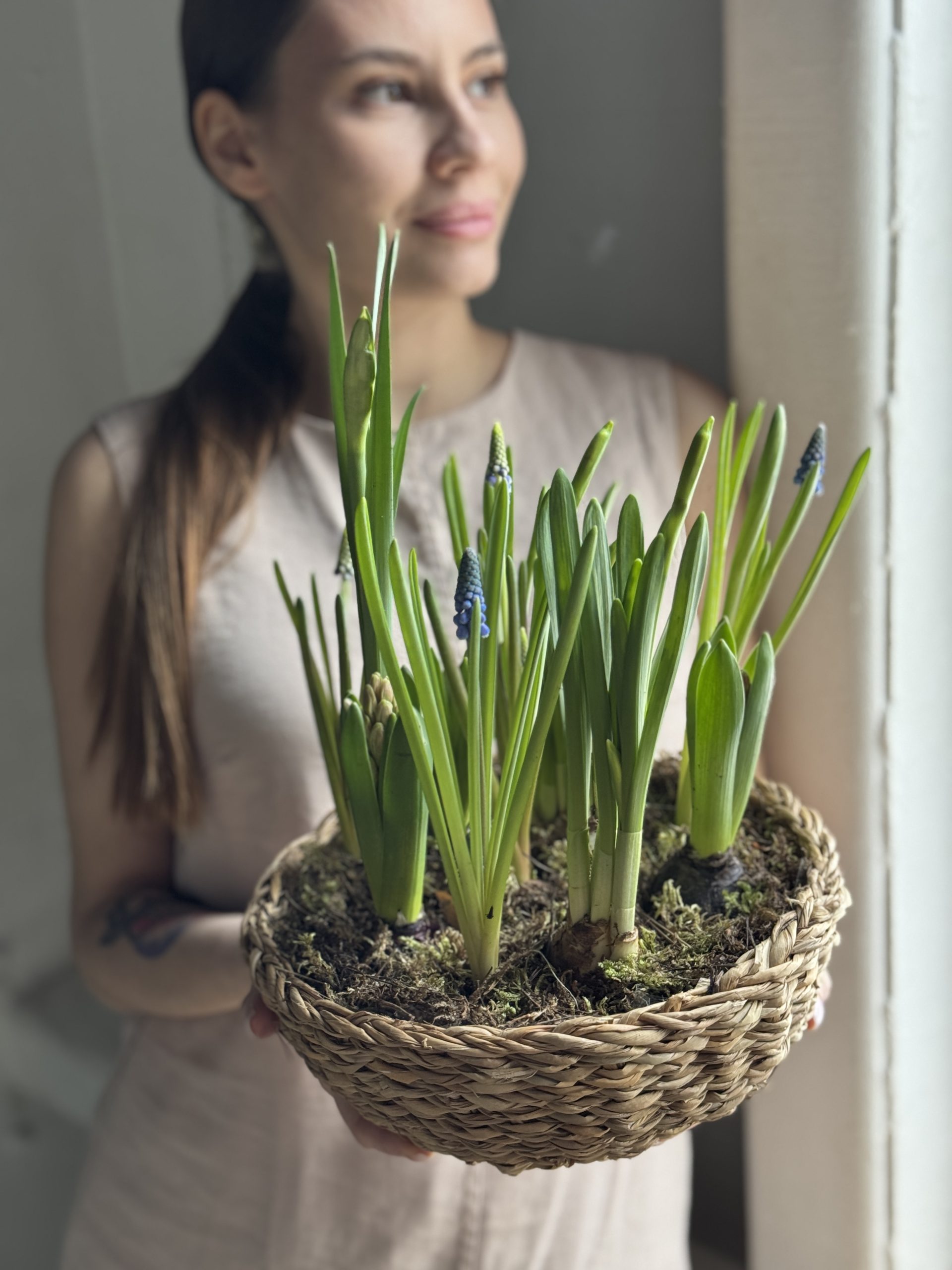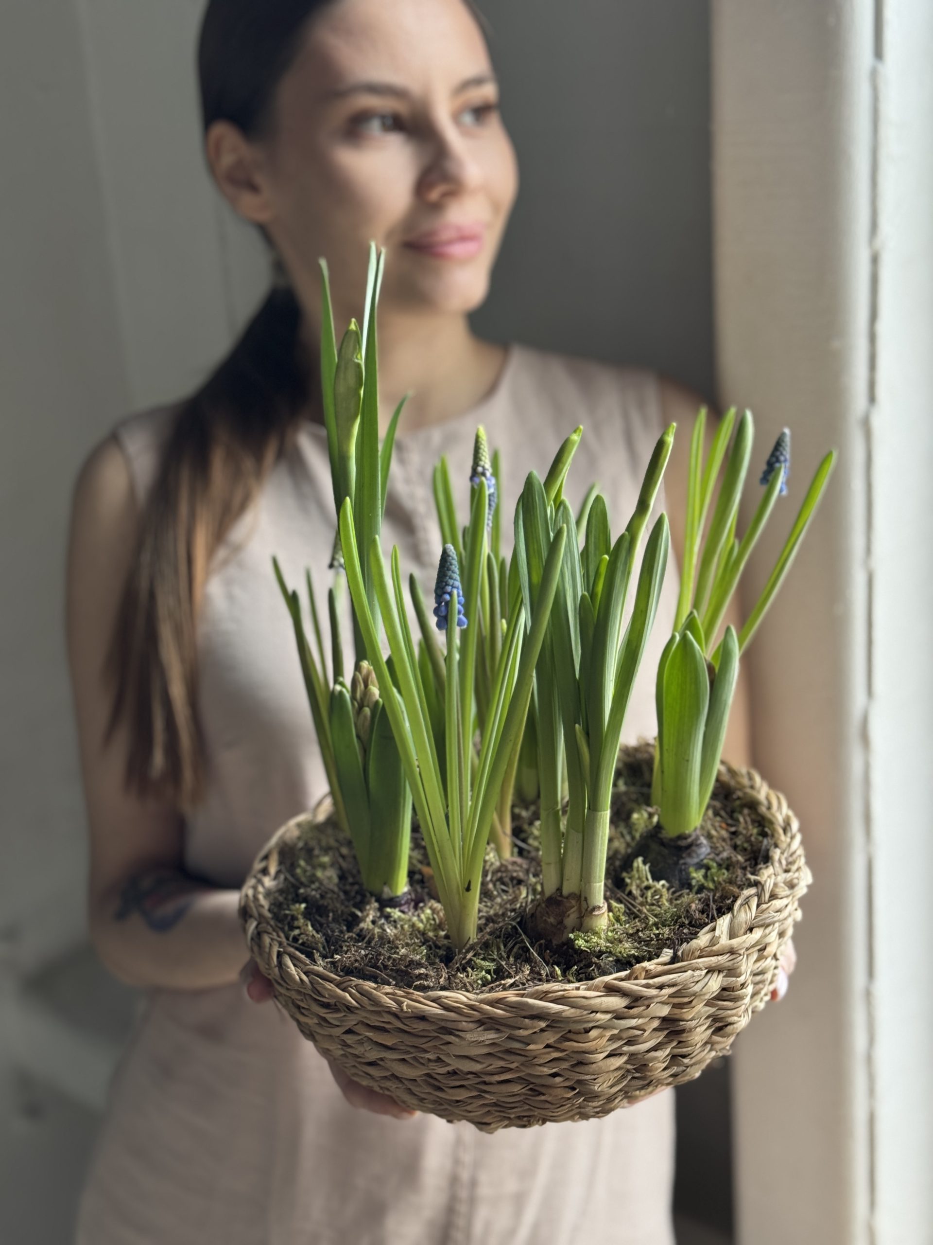 Описание: Композиция размером М в плетеном кашпо с луковицами нарциссов, мускари и гиацинтов.