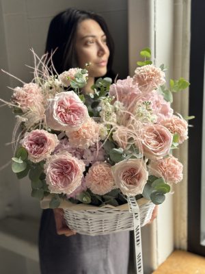 Описание: Композиция в корзине с ранункулюсами, диантусами, эустомами, кустовыми маттиолами, розами Вайт Охара, гортензией, кустовыми розами Мисти Баблз, амарантусом, веточками стифы и эвкалипта.