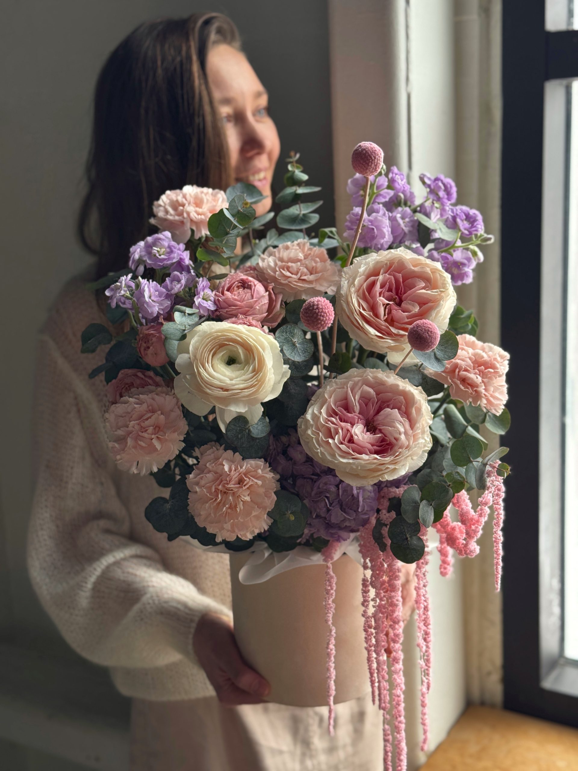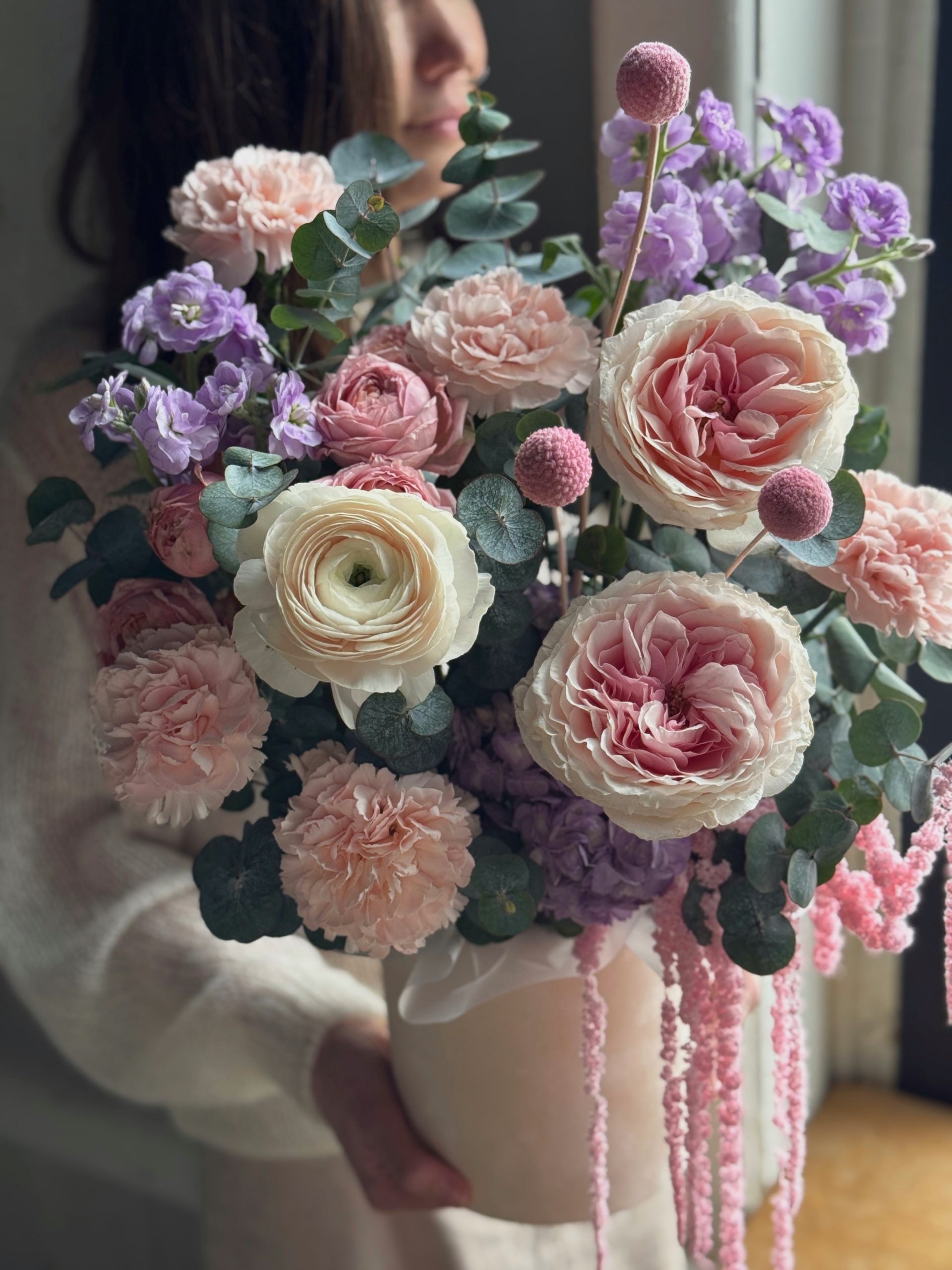 Описание: Букет с гортензией, ранункулюсом, пионовидными розами Тсумуги, ароматными маттиолами, кустовой розой Джульетта, диантусами, краспедиями, свисающим амарантом и веточками эвкалипта.