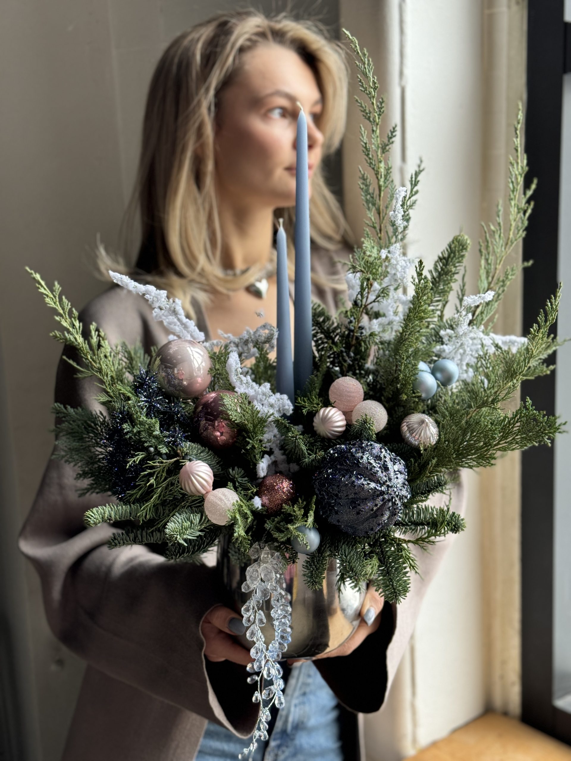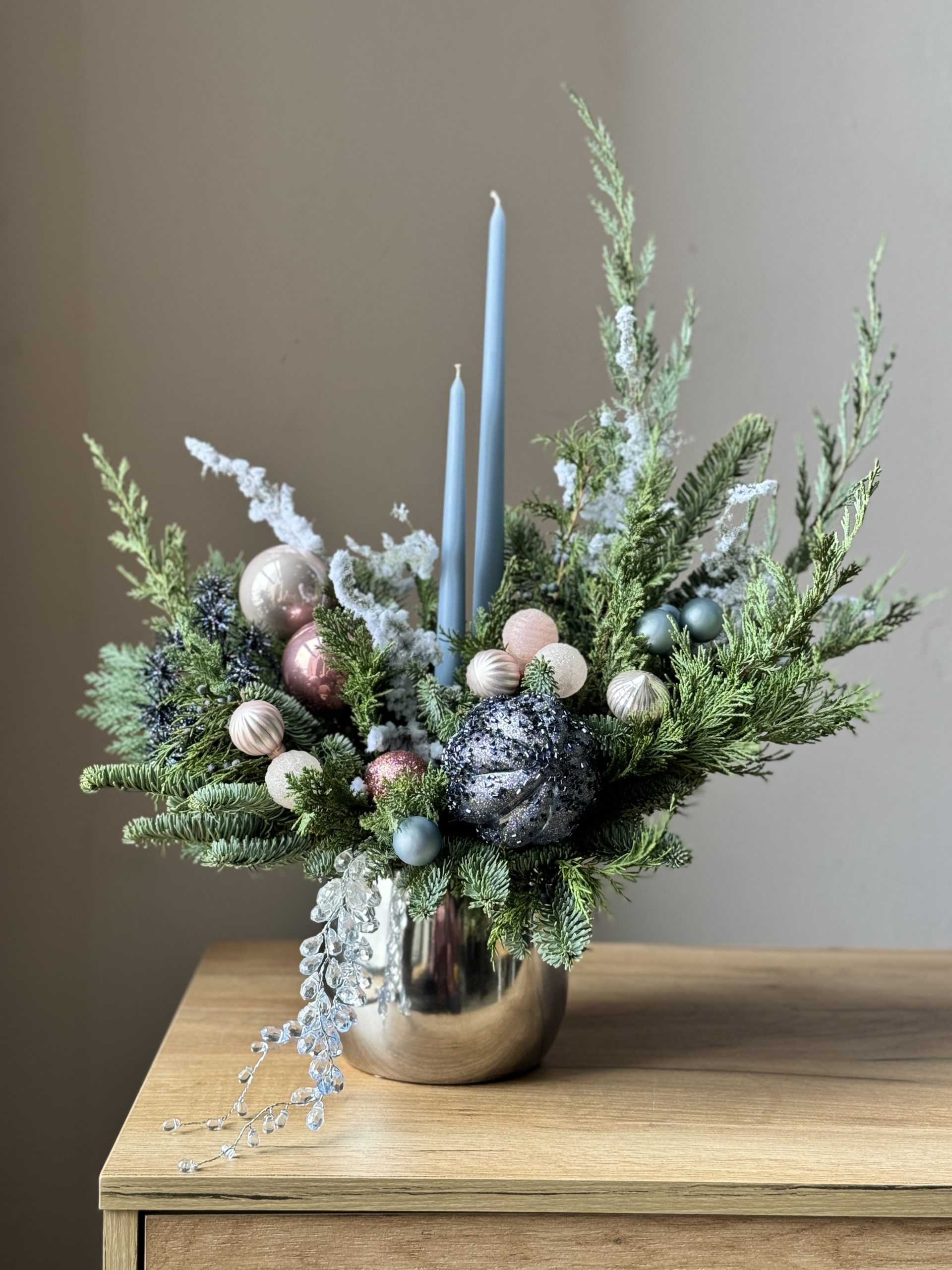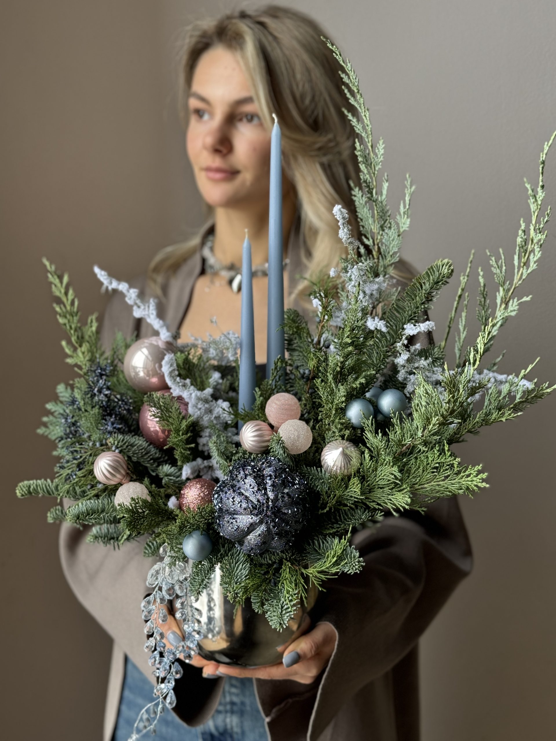 В составе конусные свечи, стеклянные шары и природные декоративные материалы.