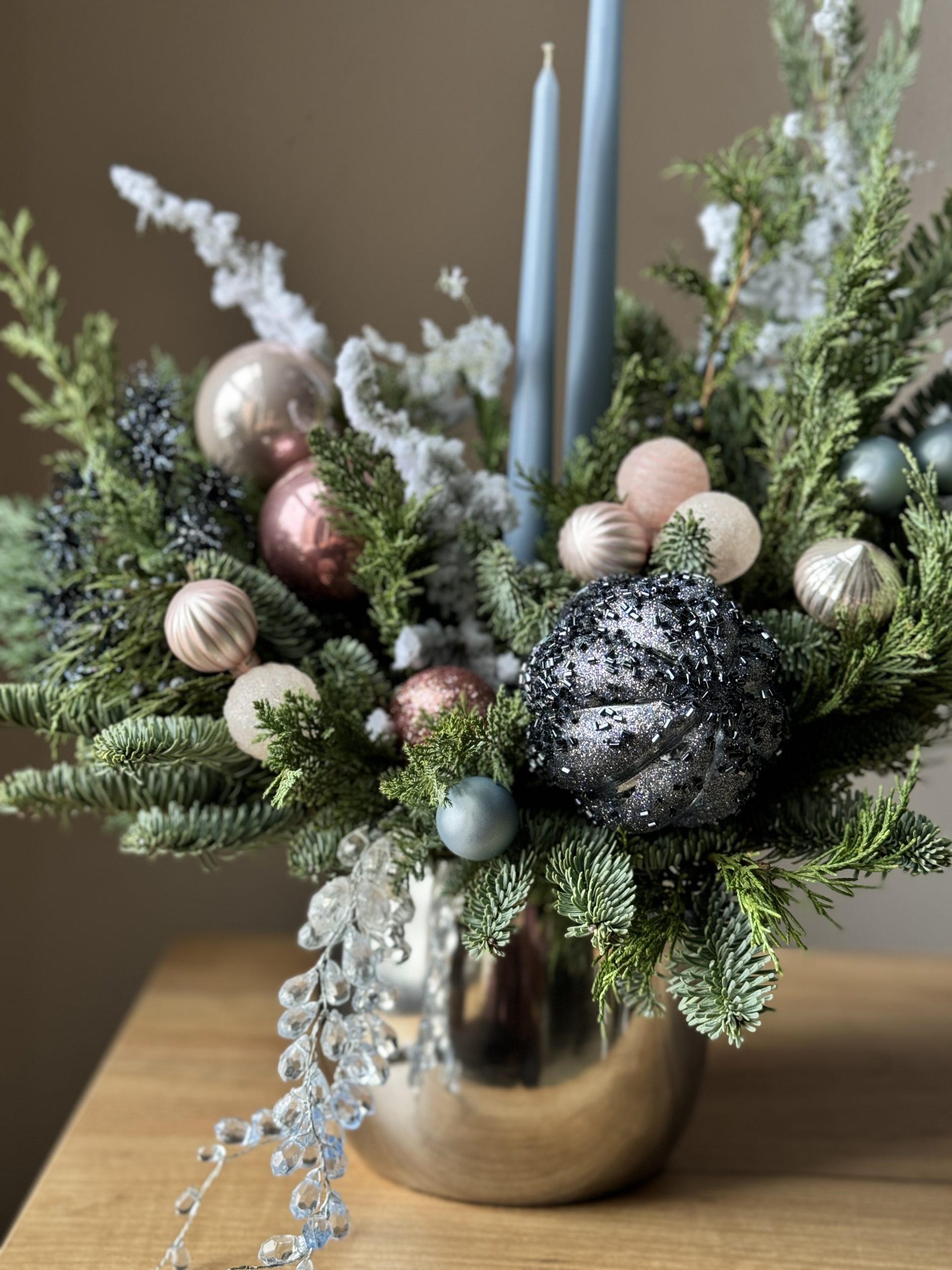 Для поддержания свежего вида хвои подливайте воду в центр композиции раз в 1-2 дня по мере высыхания губки, а также умеренно опрыскивайте пульверизатором.