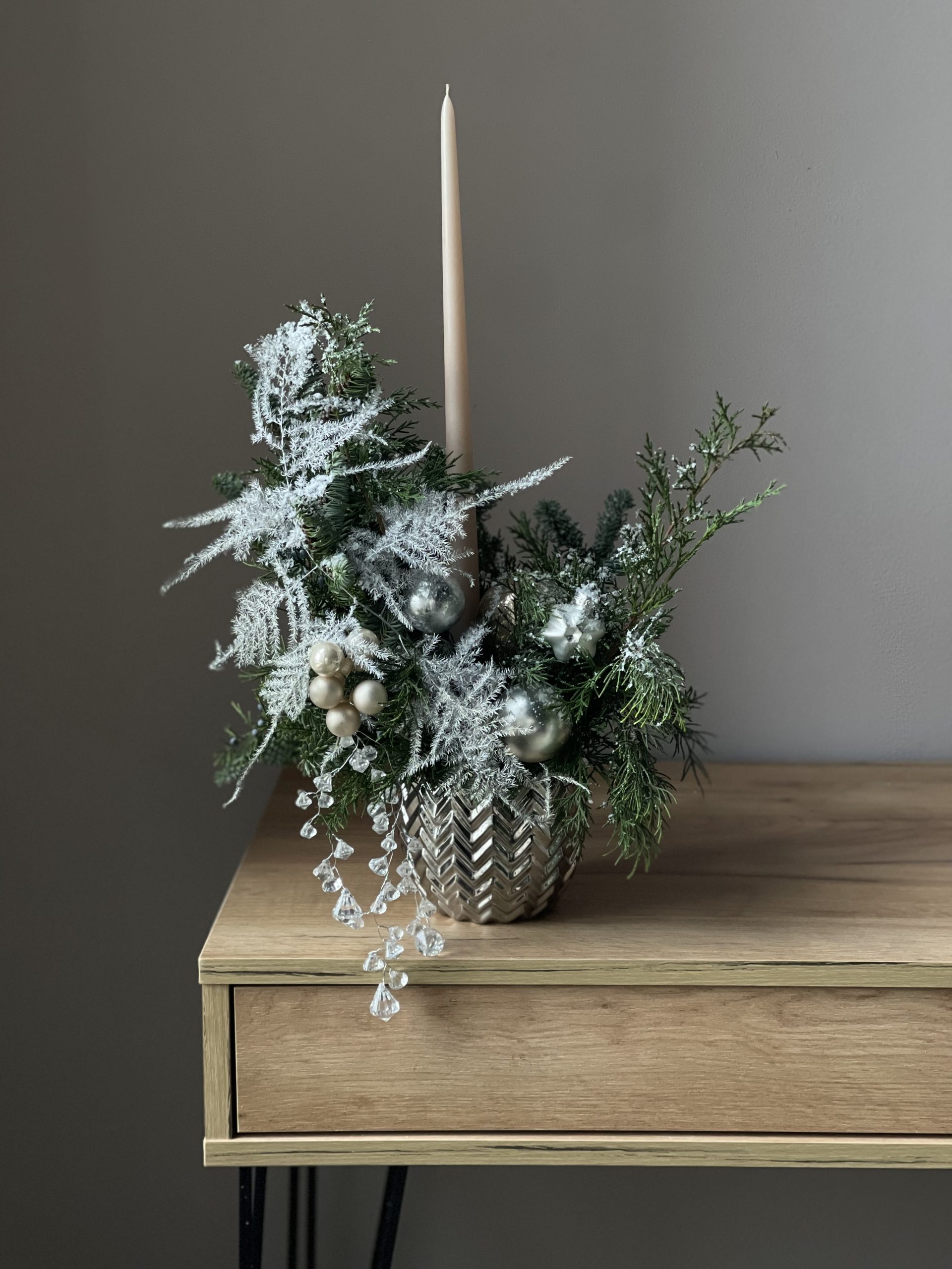 В составе конусные свечи, стеклянные шары и природные декоративные материалы.