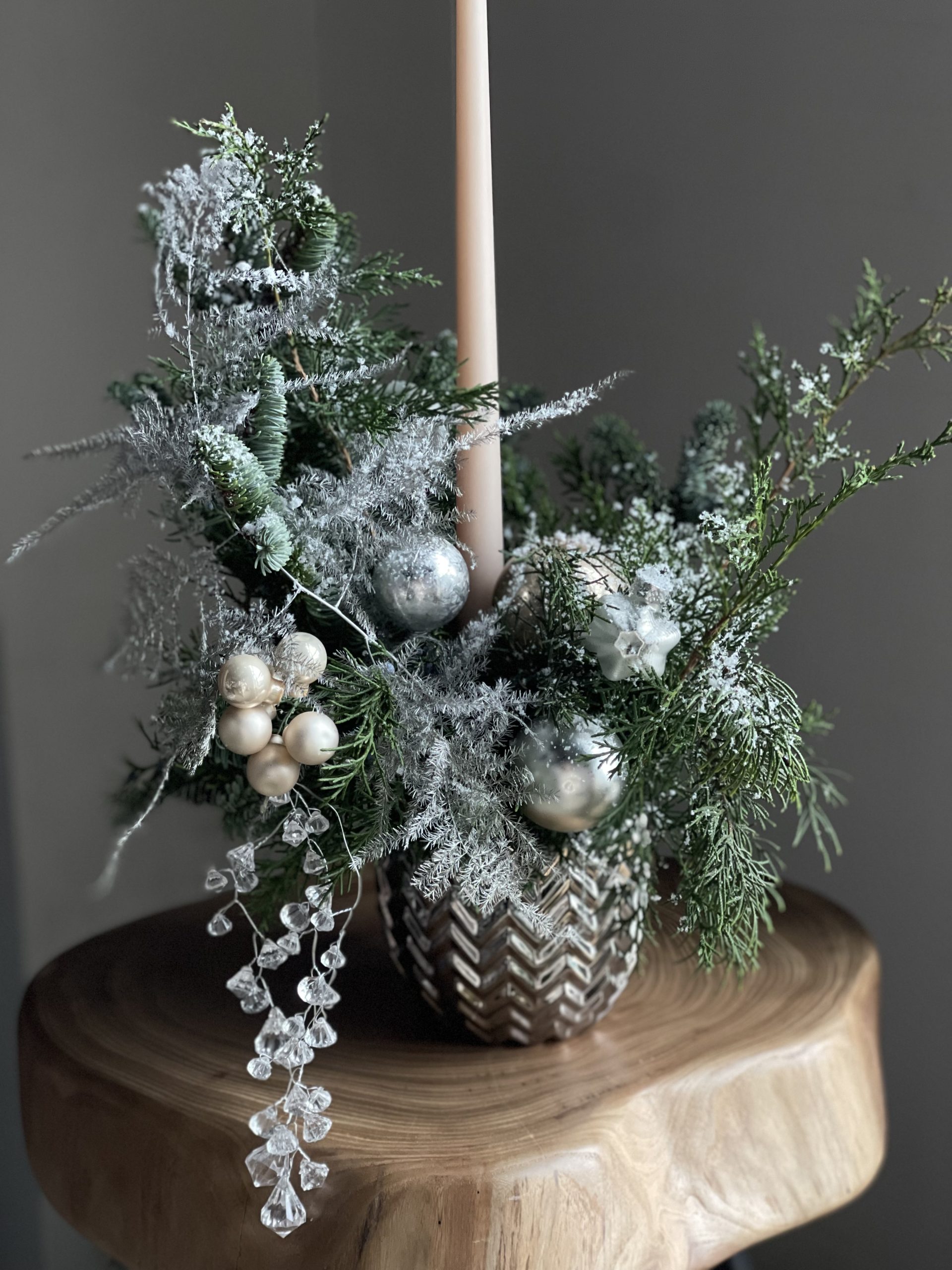 Для поддержания свежего вида хвои подливайте воду в центр композиции раз в 1-2 дня по мере высыхания губки, а также умеренно опрыскивайте пульверизатором.