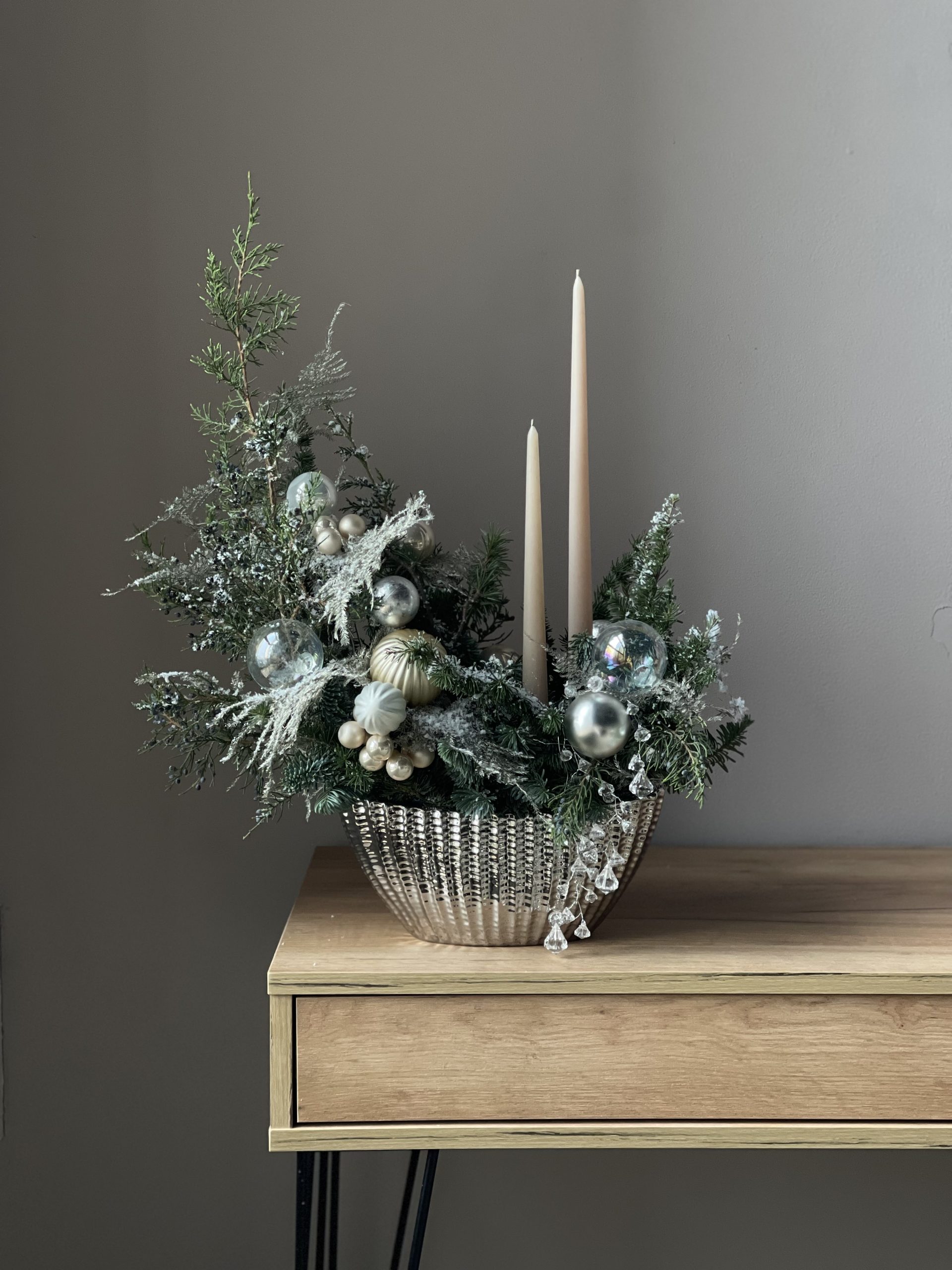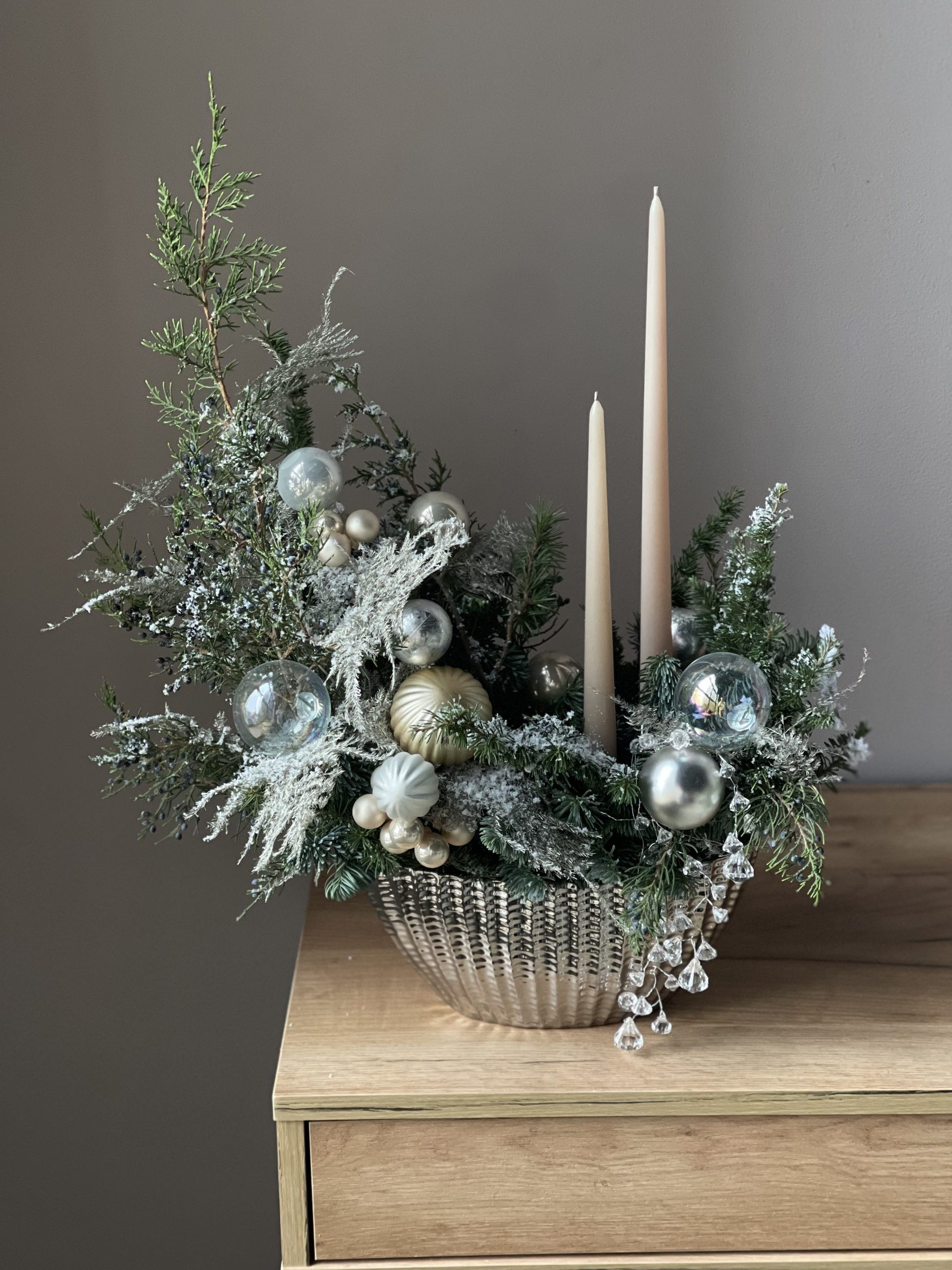 В составе конусные свечи, стеклянные шары и природные декоративные материалы.
