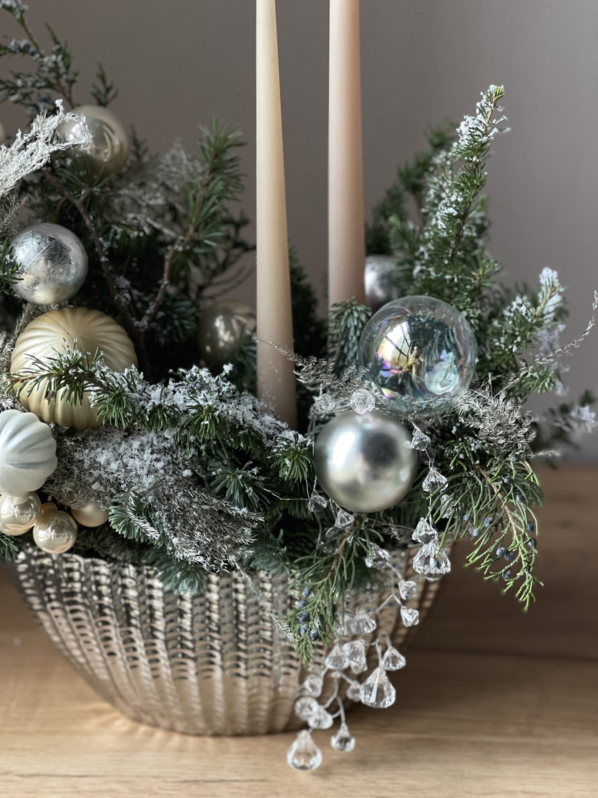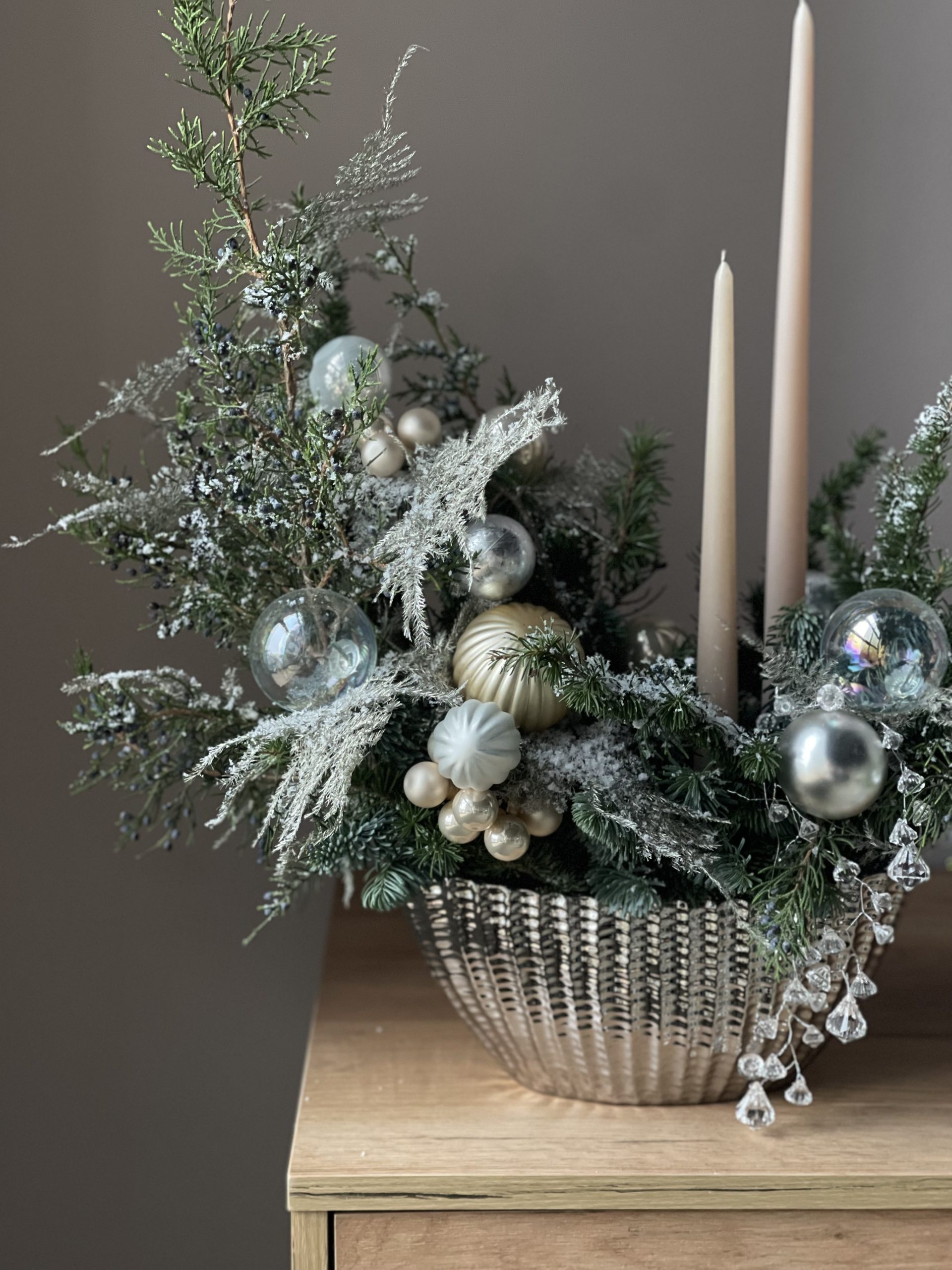 Для поддержания свежего вида хвои подливайте воду в центр композиции раз в 1-2 дня по мере высыхания губки, а также умеренно опрыскивайте пульверизатором.