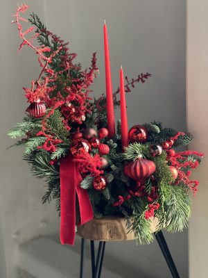 Для поддержания свежего вида хвои подливайте воду в центр композиции раз в 1-2 дня по мере высыхания губки, а также умеренно опрыскивайте пульверизатором.